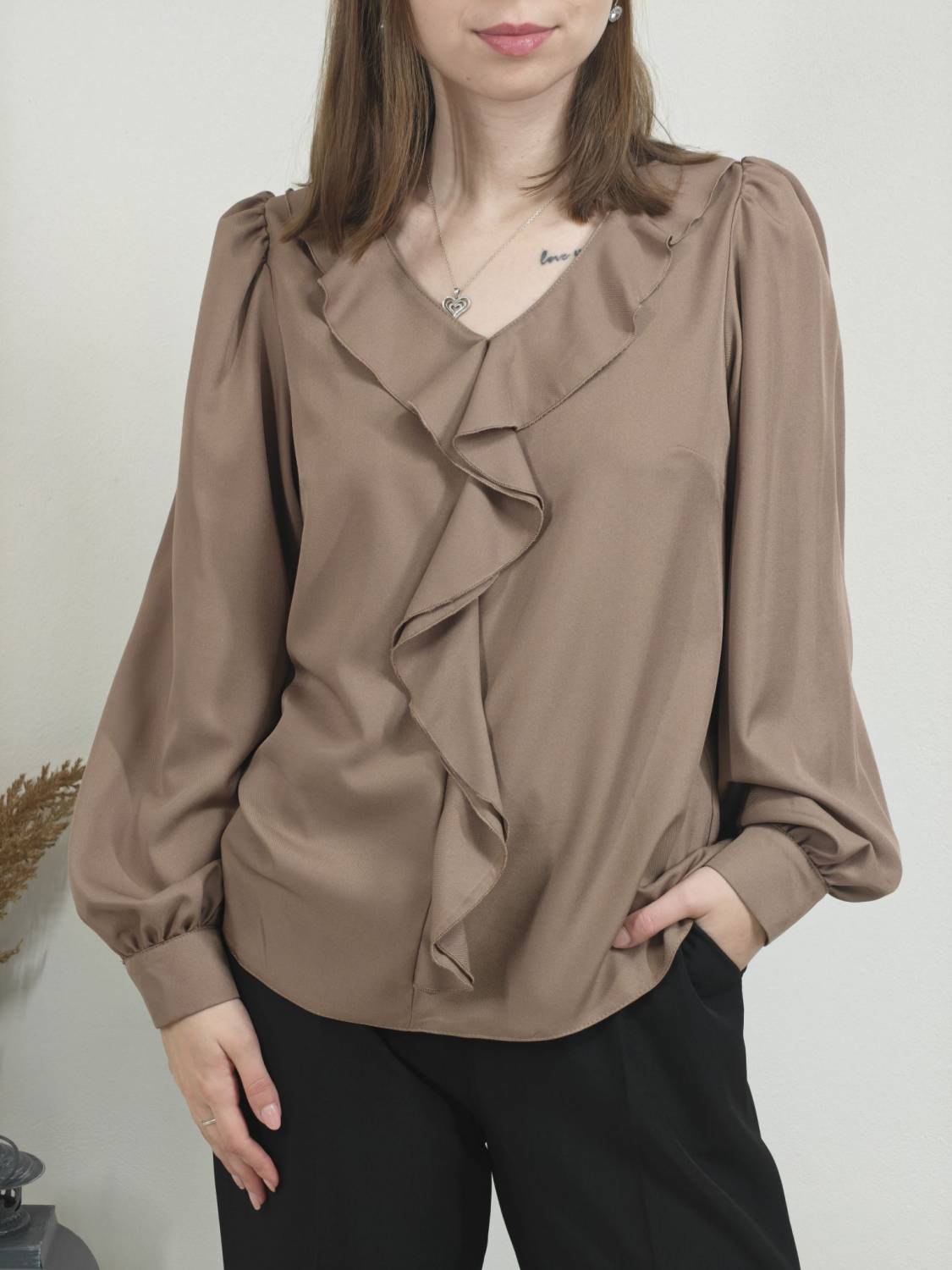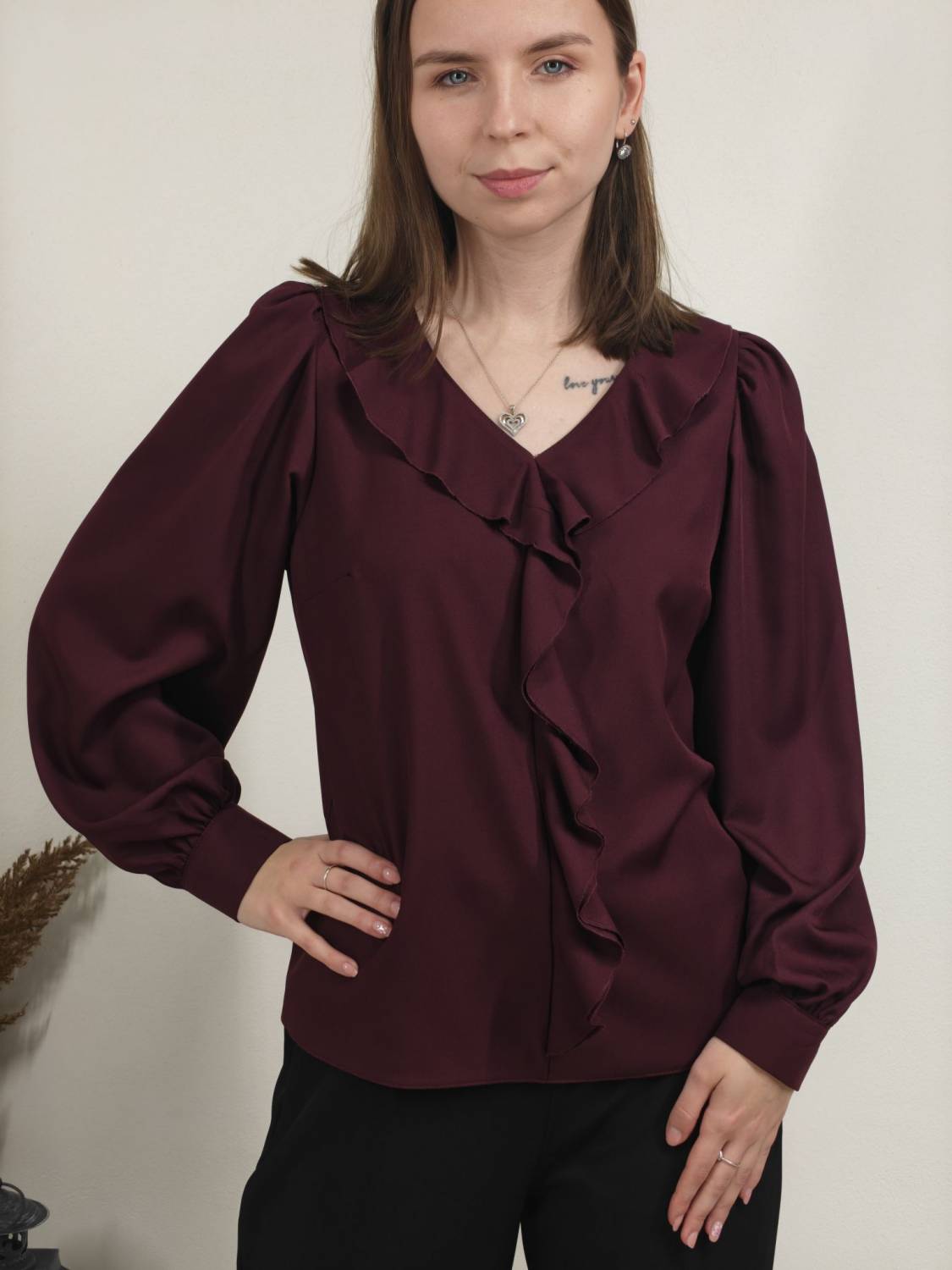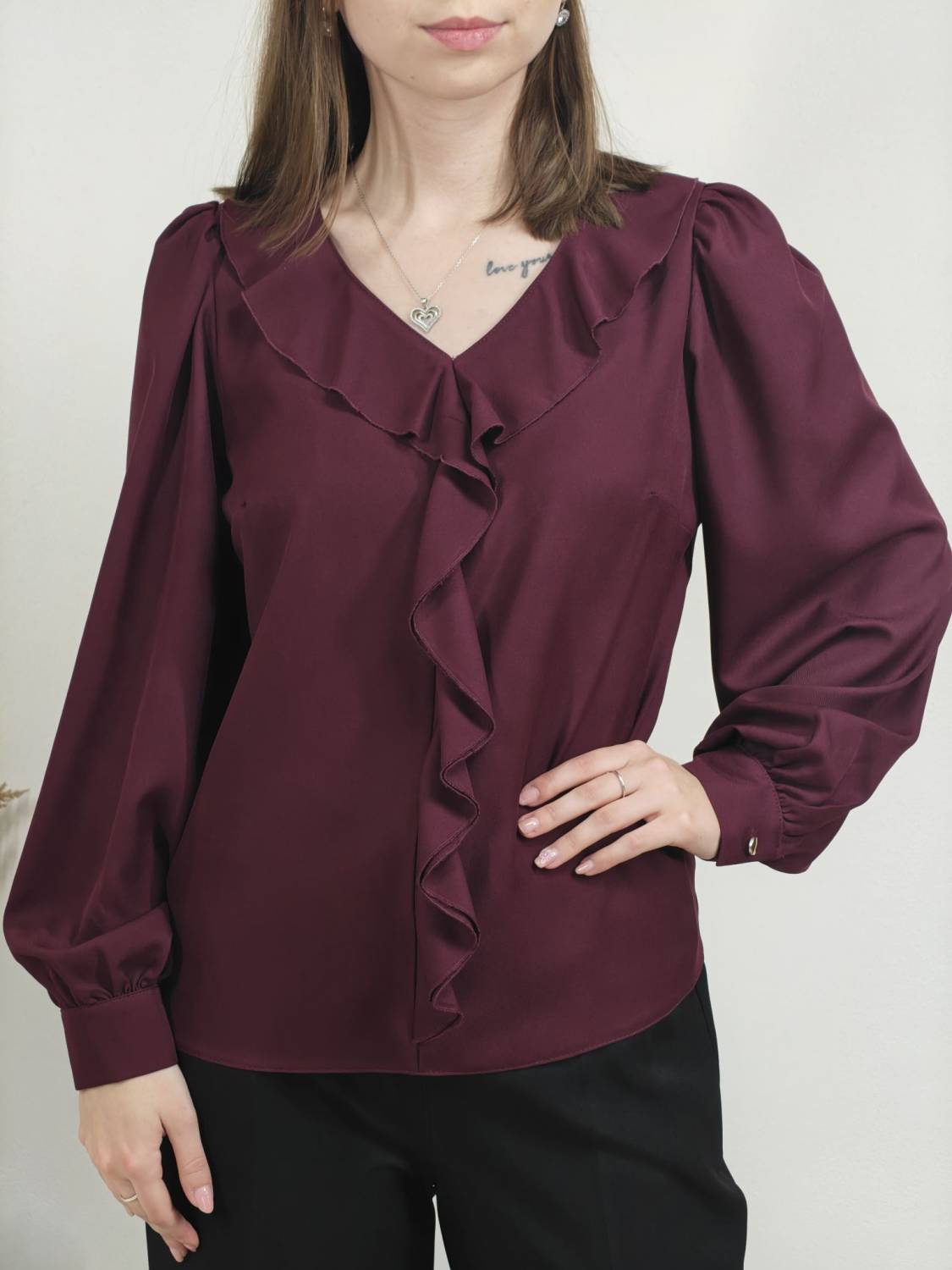 Blúzka so žabó, je prestrihnutá na prsiach. Rukáv je nariasený a zakončený manžetou na gombík.