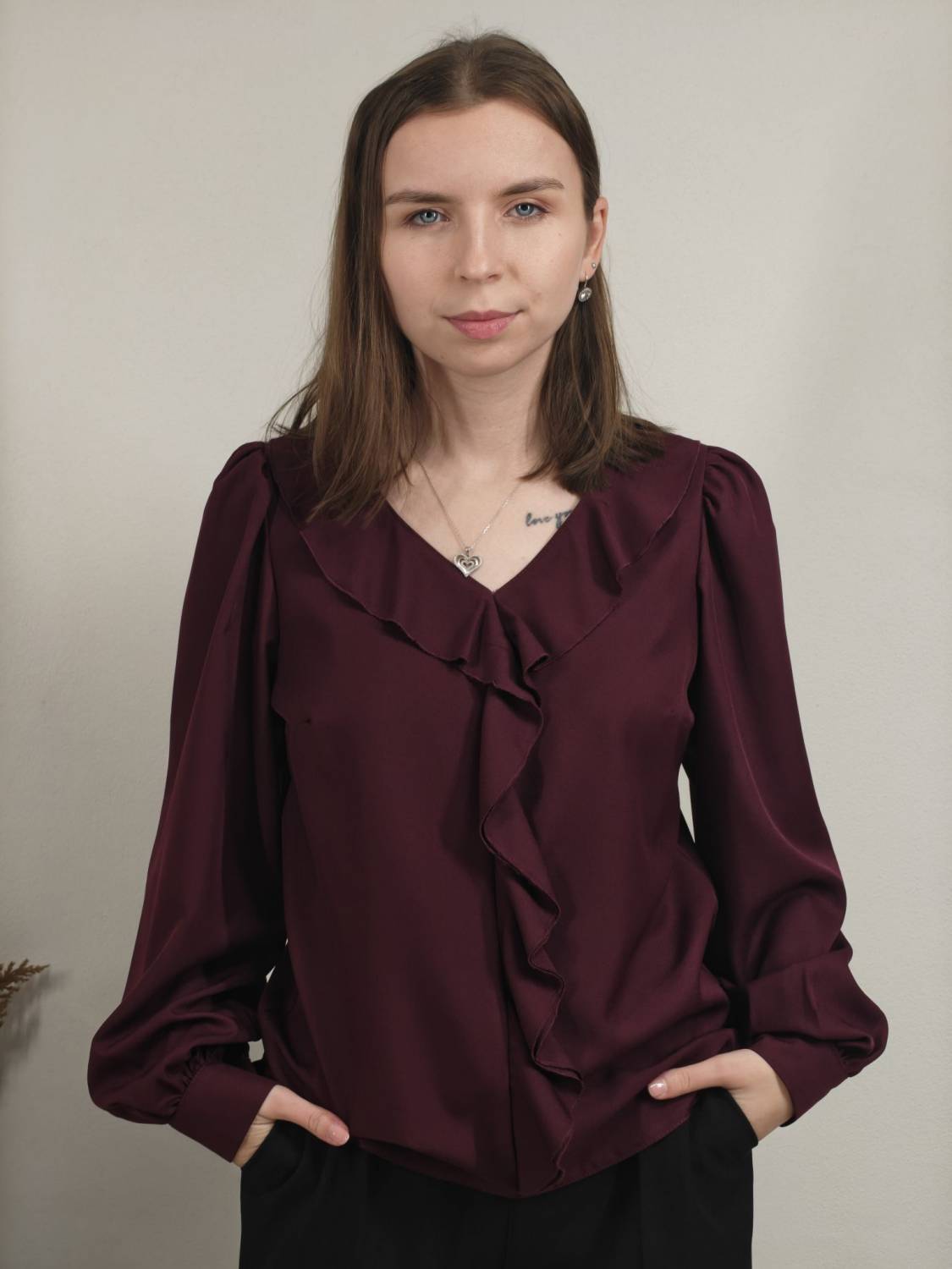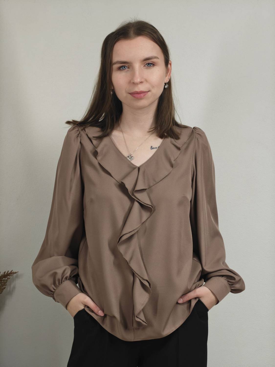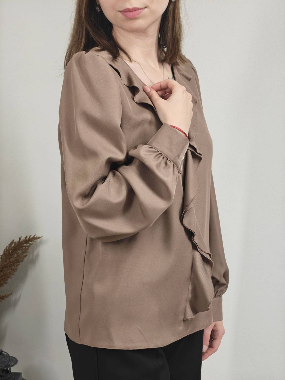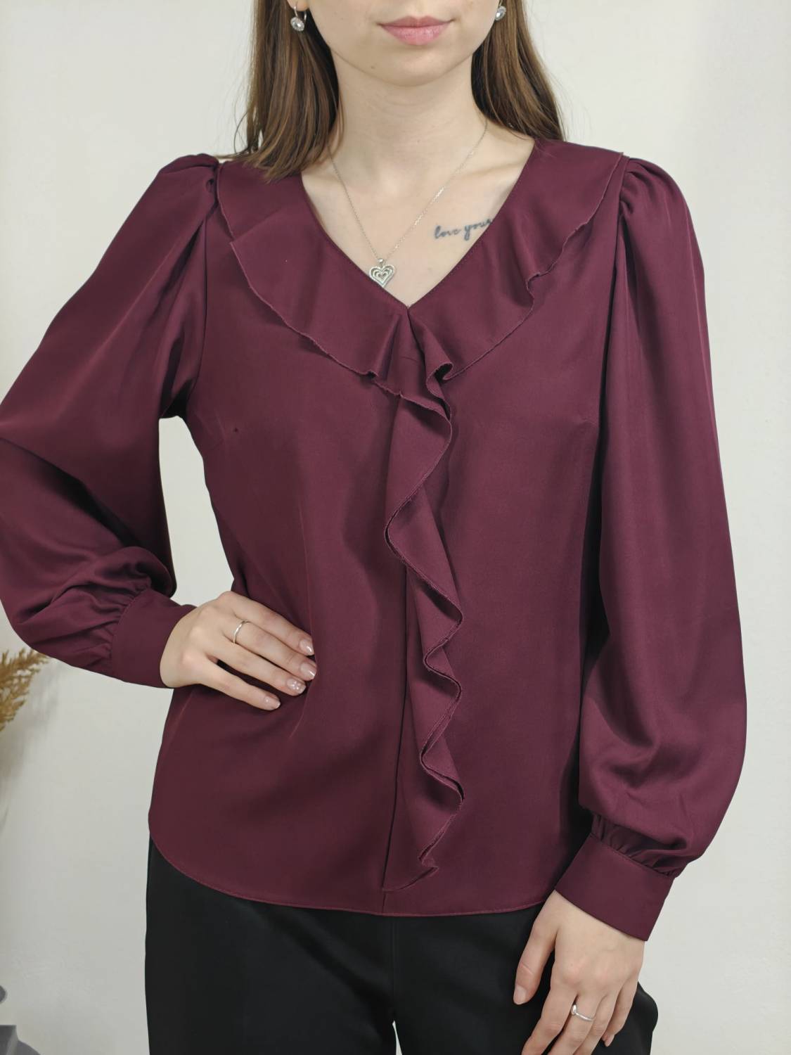 Blúzka so žabó, je prestrihnutá na prsiach. Rukáv je nariasený a zakončený manžetou na gombík.
