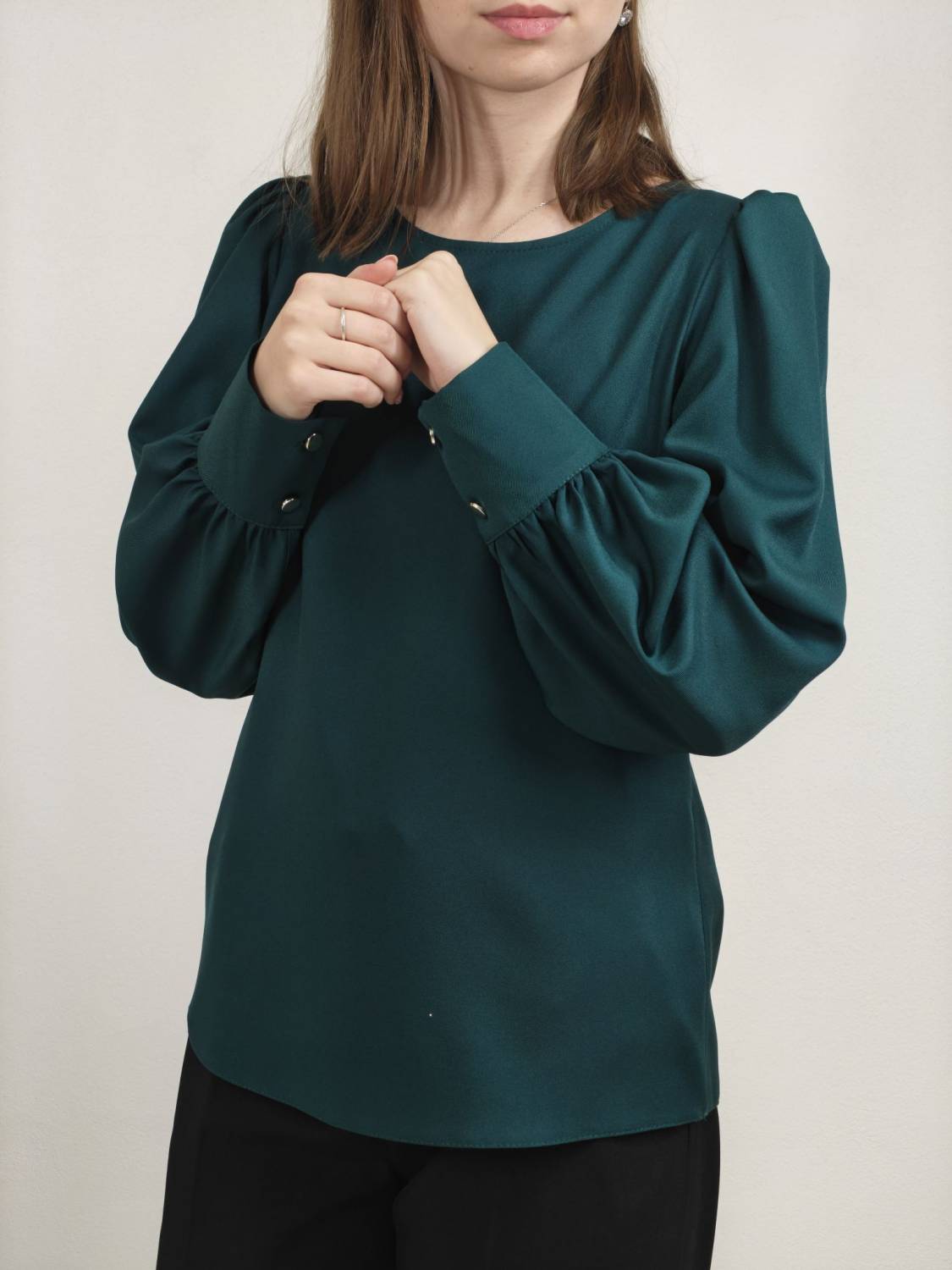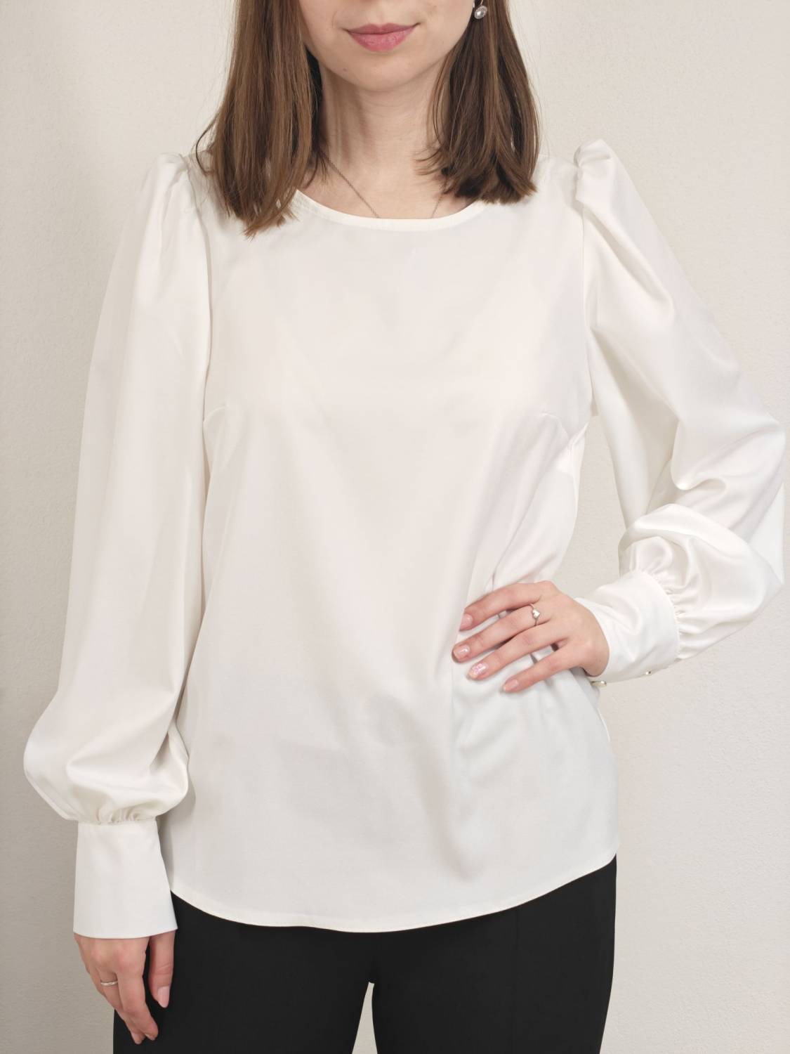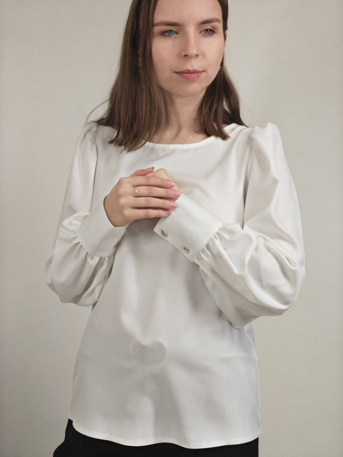 Blúzka rovného strihu, je prestrihnutá na prsiach. Rukáv je nariasený a zakončený manžetou na gombík.