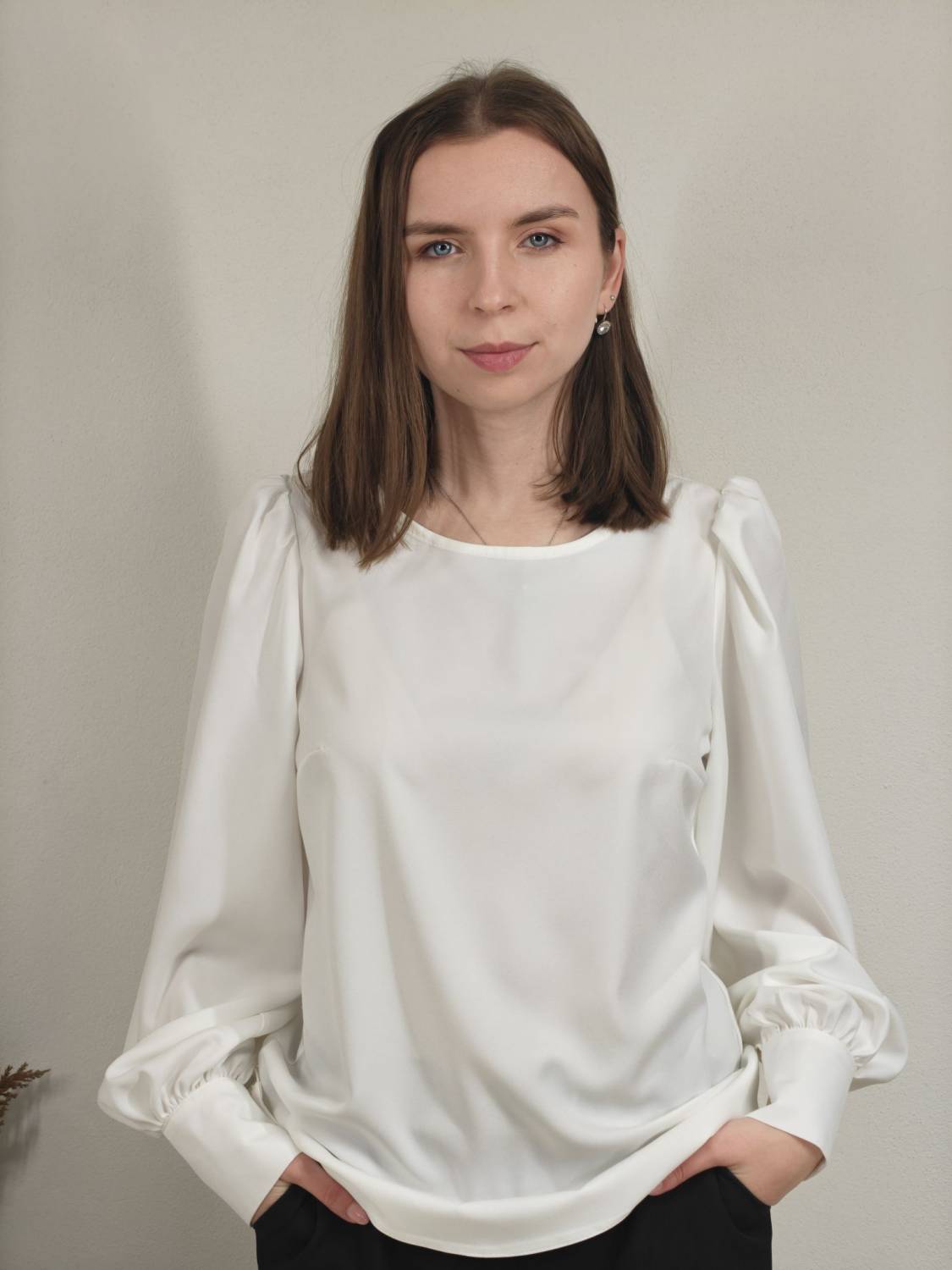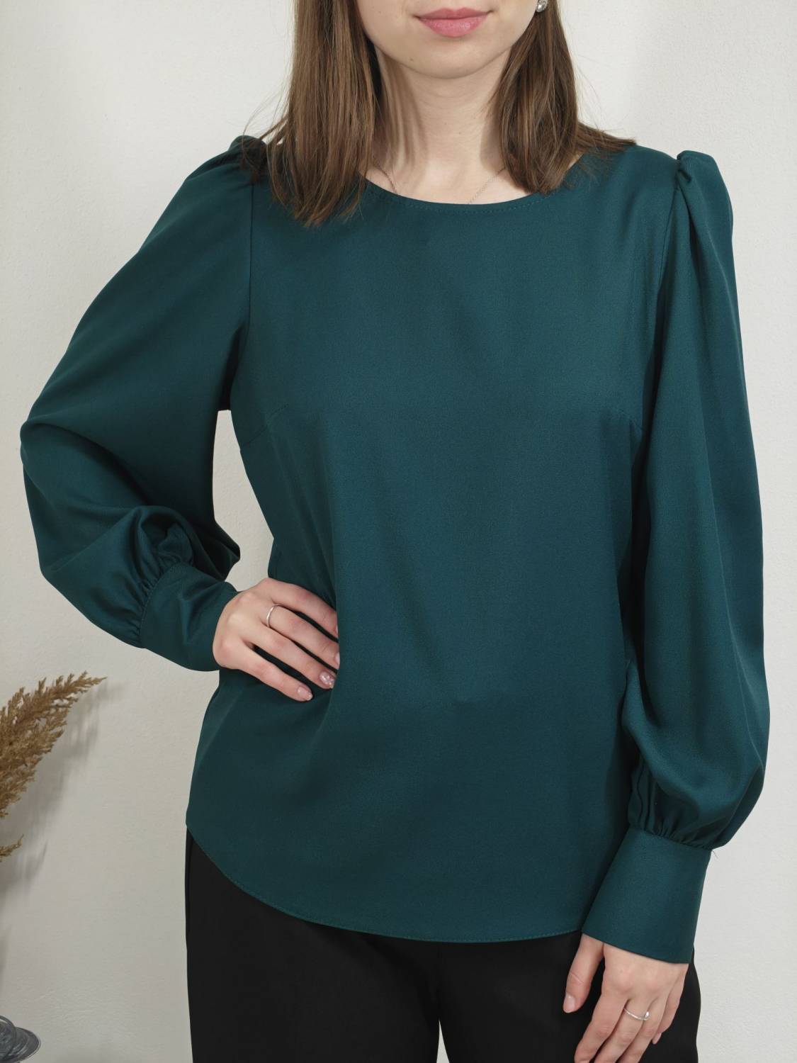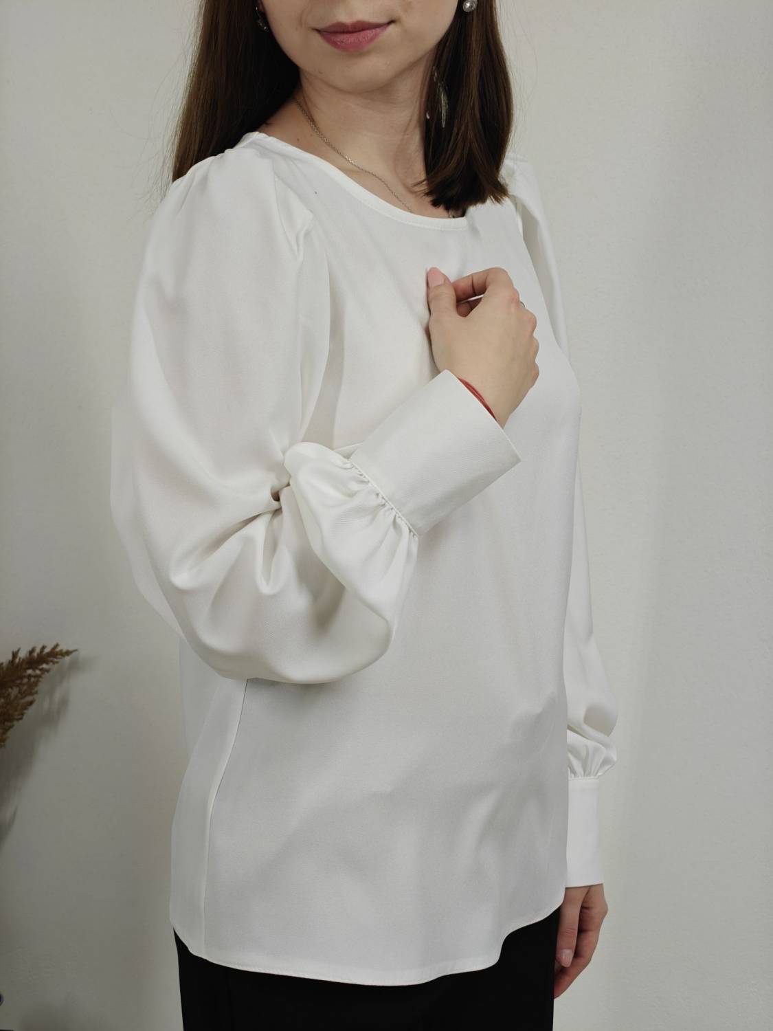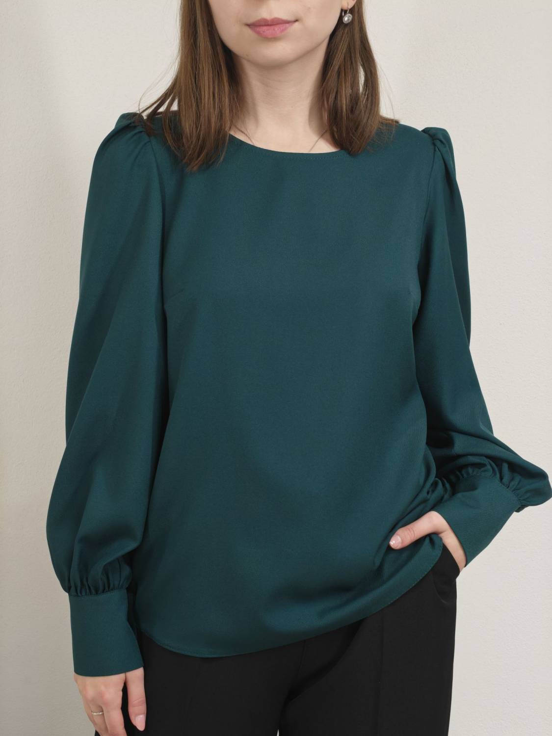 Blúzka rovného strihu, je prestrihnutá na prsiach. Rukáv je nariasený a zakončený manžetou na gombík.