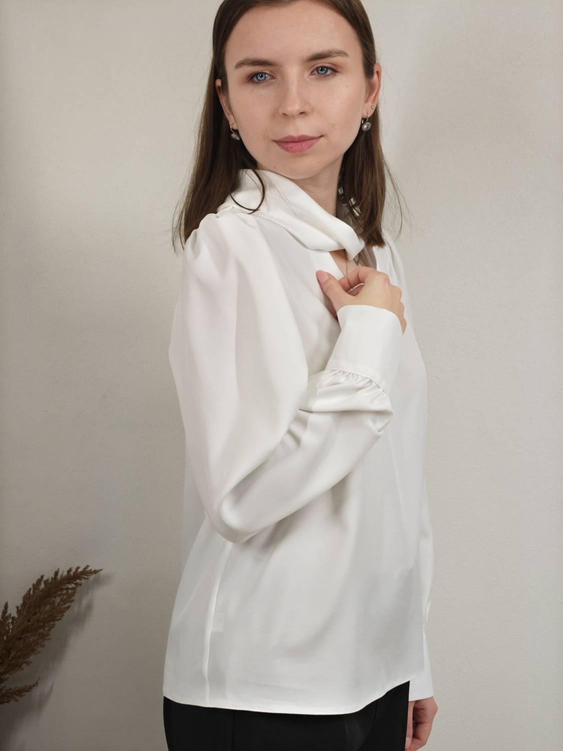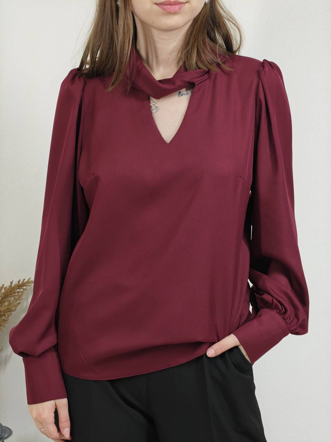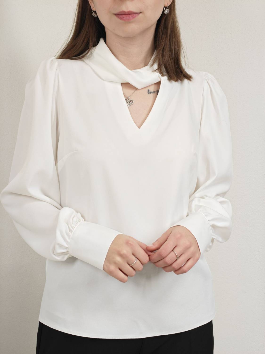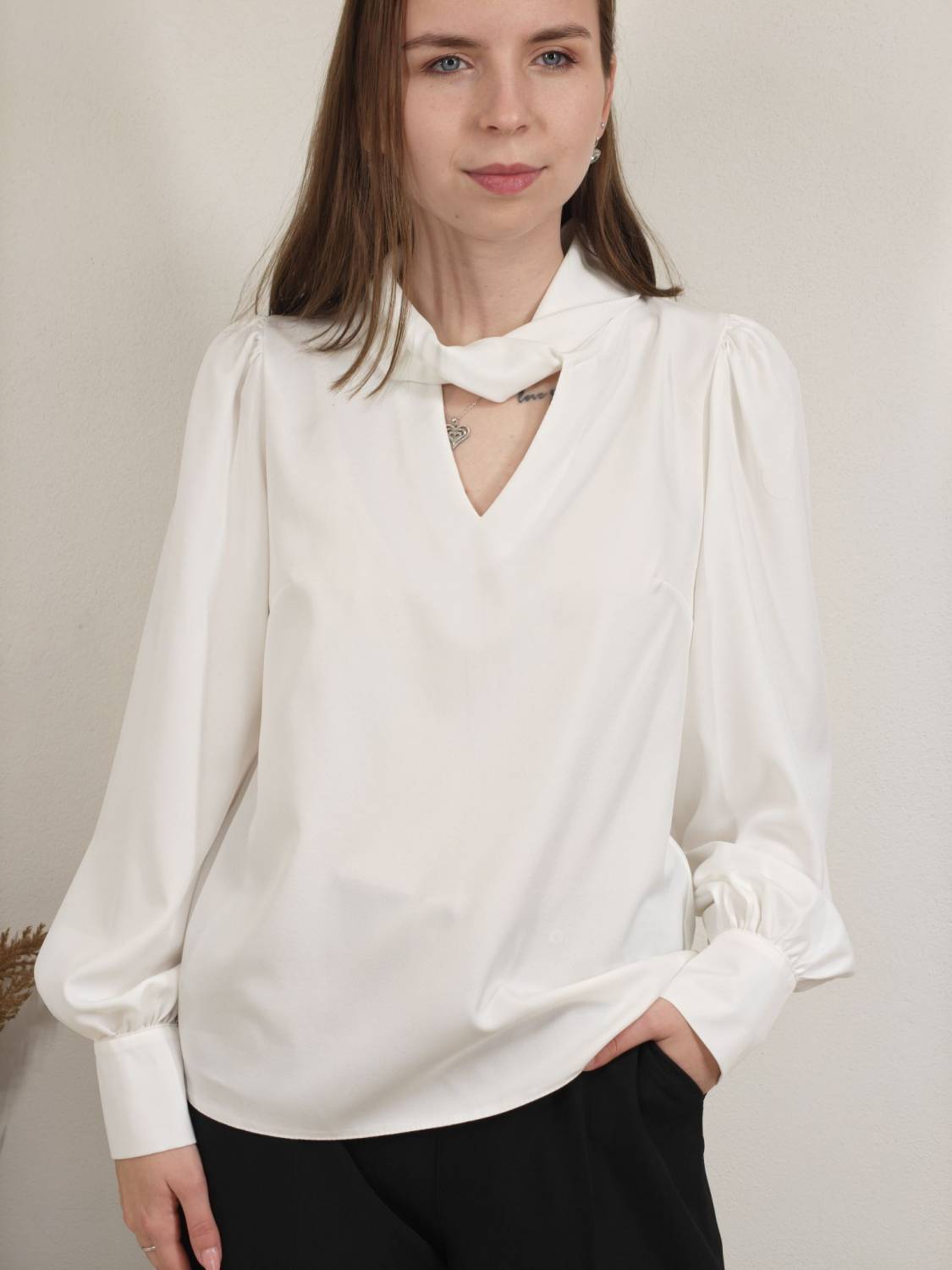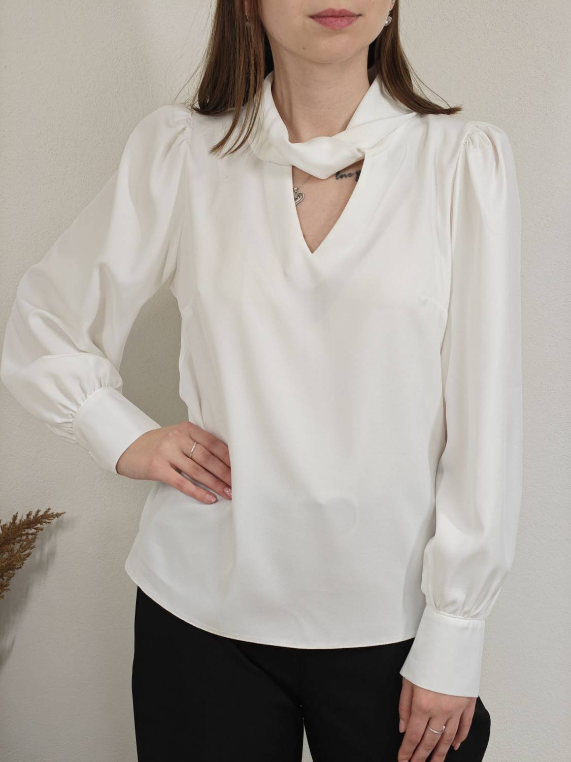 Blúzka s pretočeným golierom, je prestrihnutá na prsiach. Rukáv je nariasený a zakončený manžetou na dva gombíky. Vzadu sa zapína na dva gombíky.