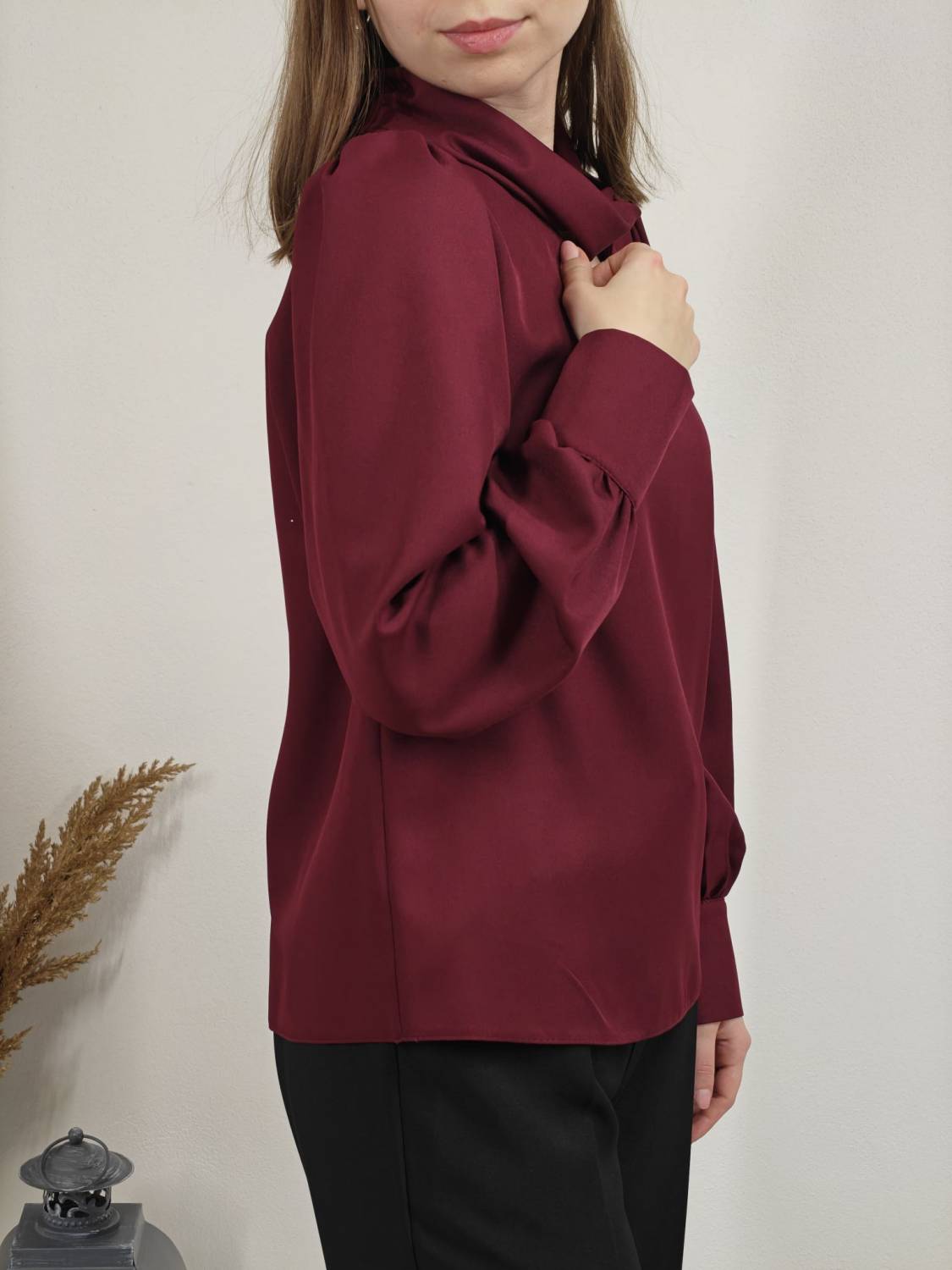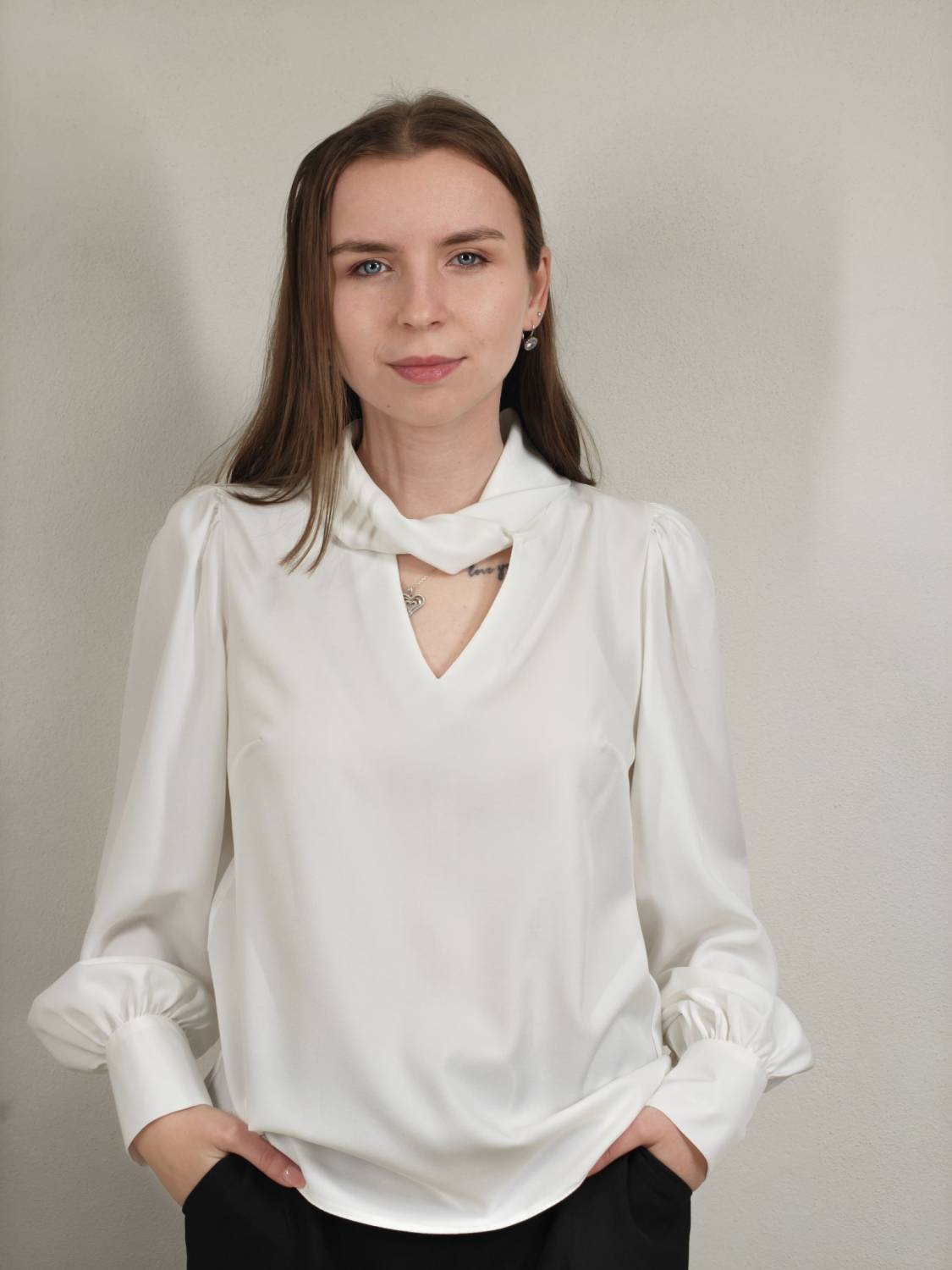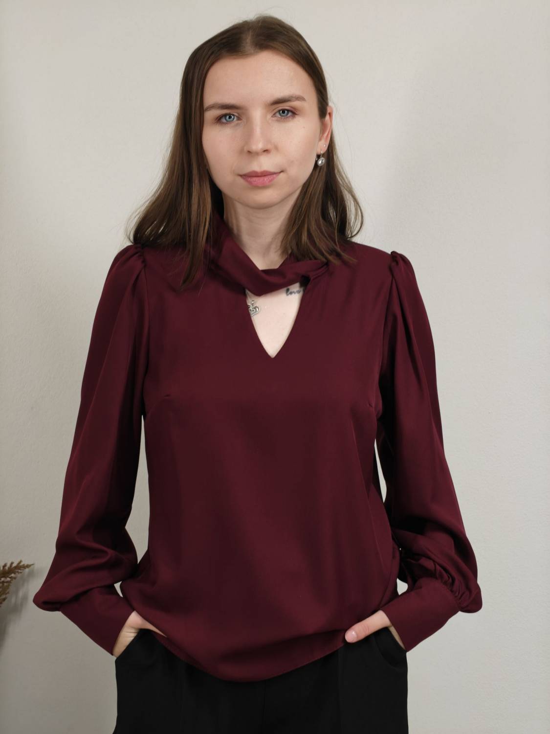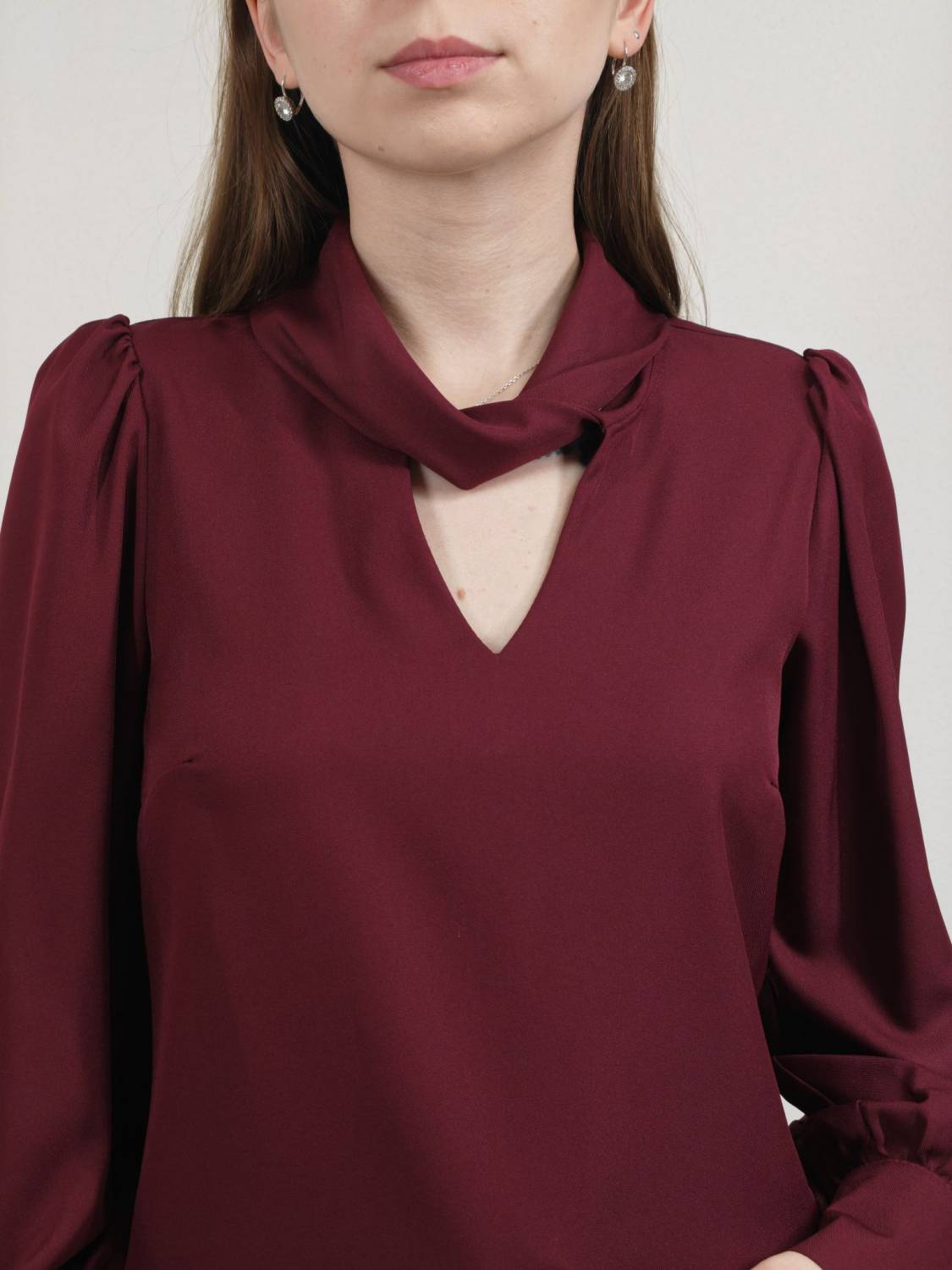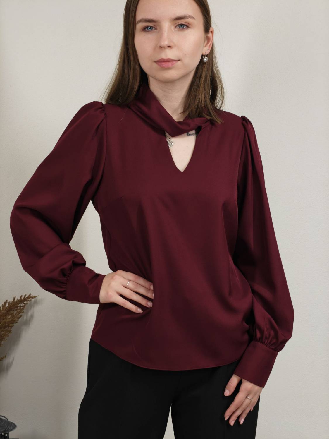 Blúzka s pretočeným golierom, je prestrihnutá na prsiach. Rukáv je nariasený a zakončený manžetou na dva gombíky. Vzadu sa zapína na dva gombíky.