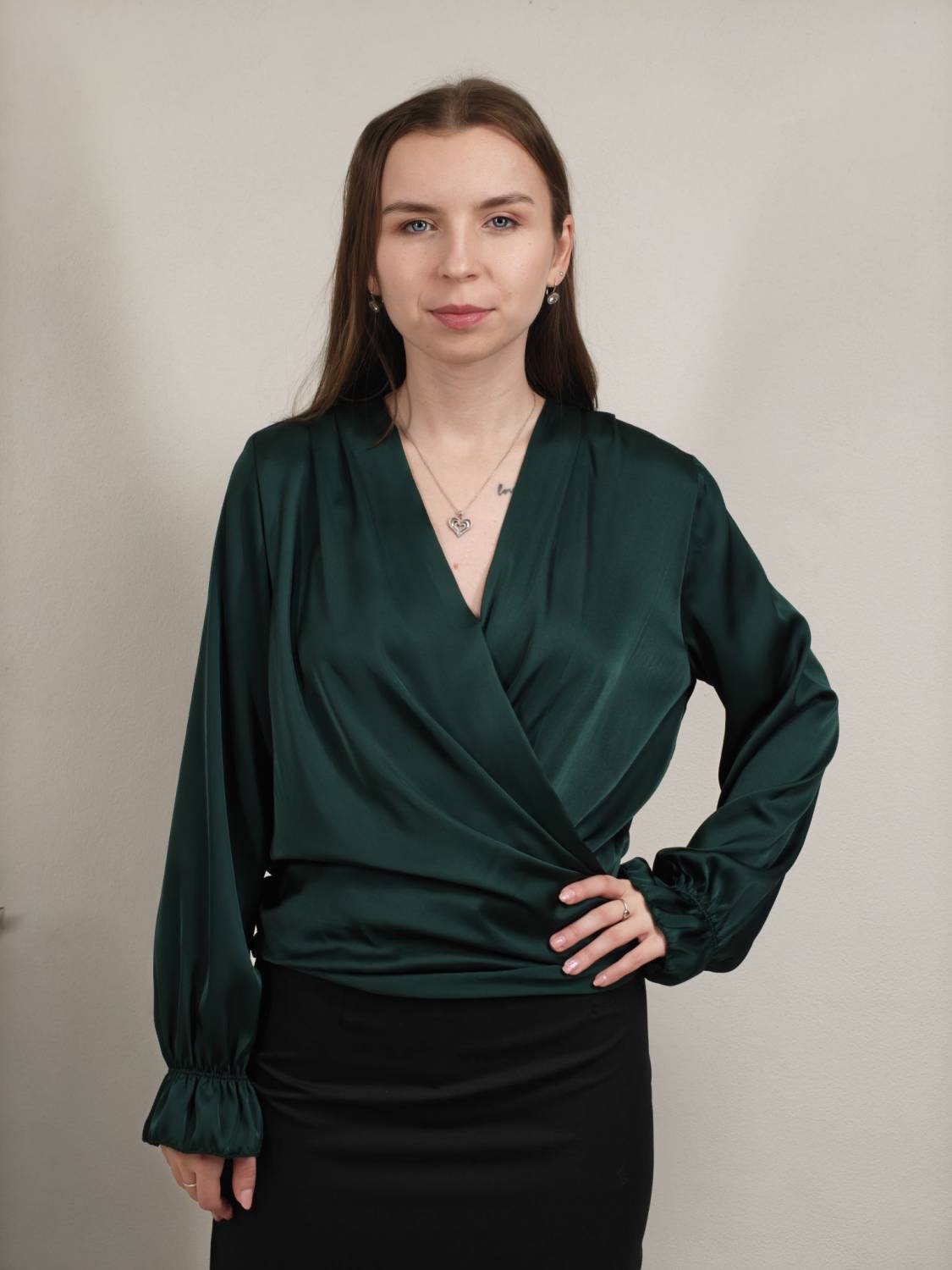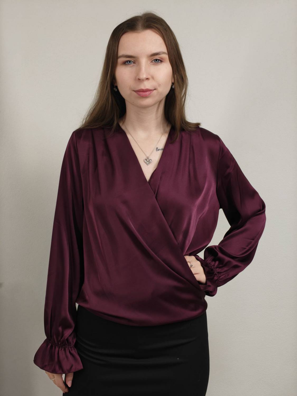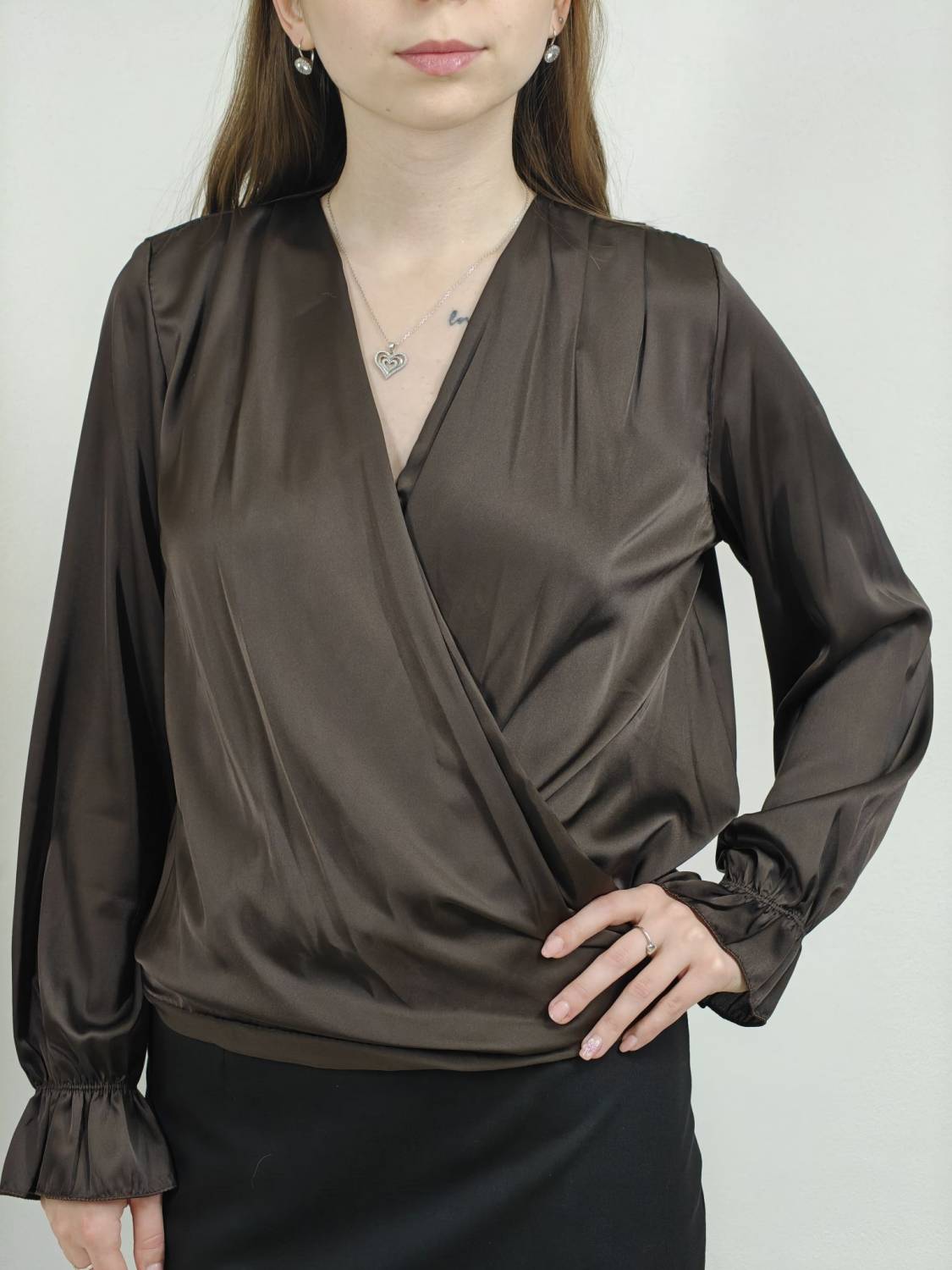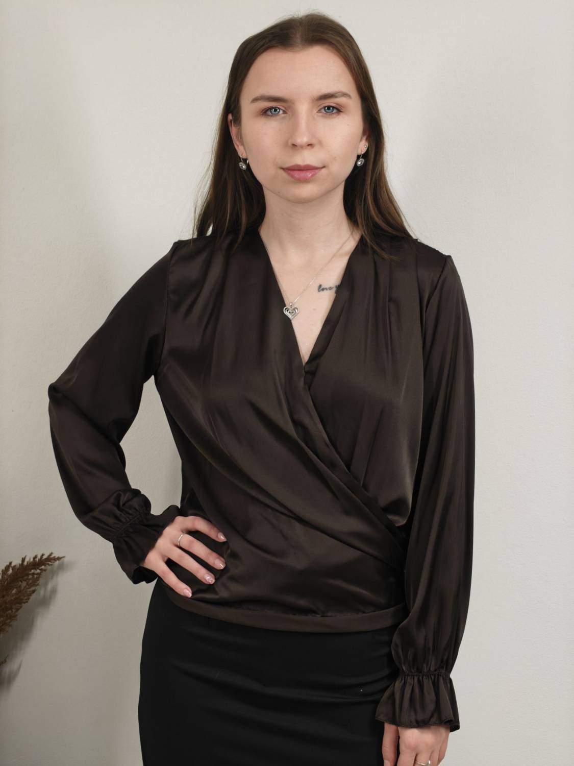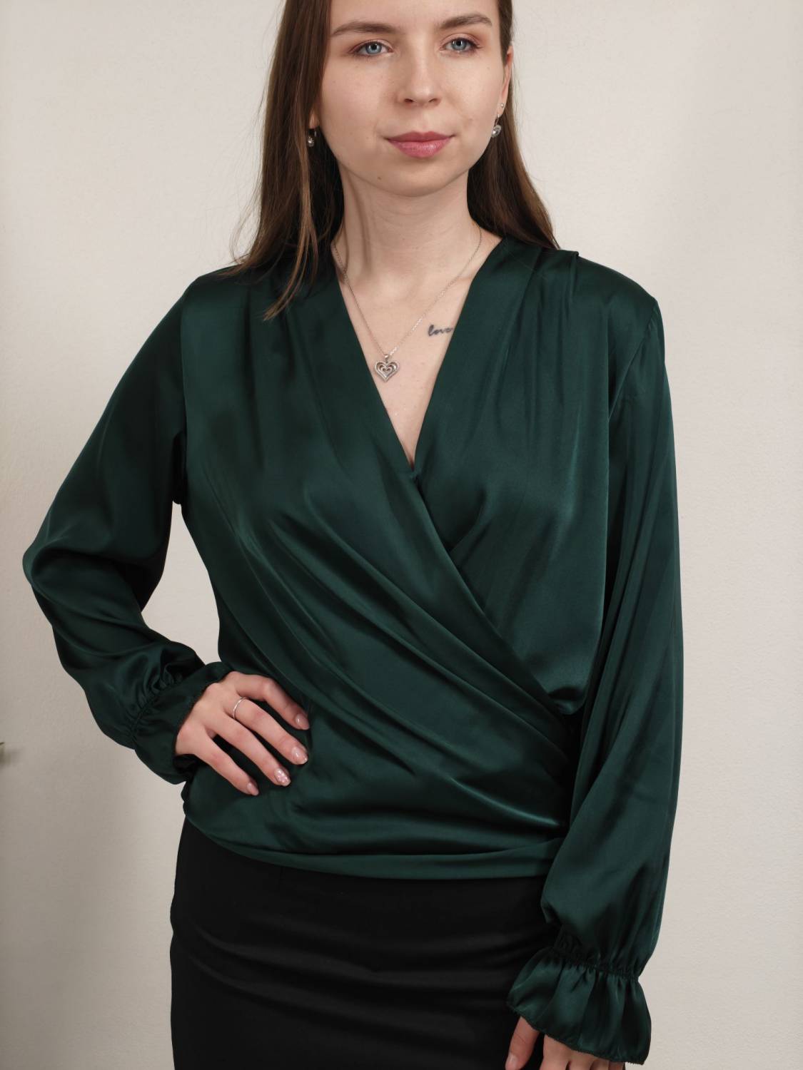 Jednofarebná blúzka s prekladom, v zadnu na spodnej časti je zakončená gumičkou. Blúzka má rukáv s gumičkou.