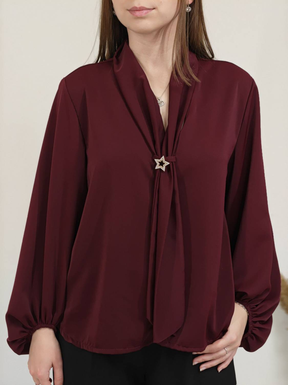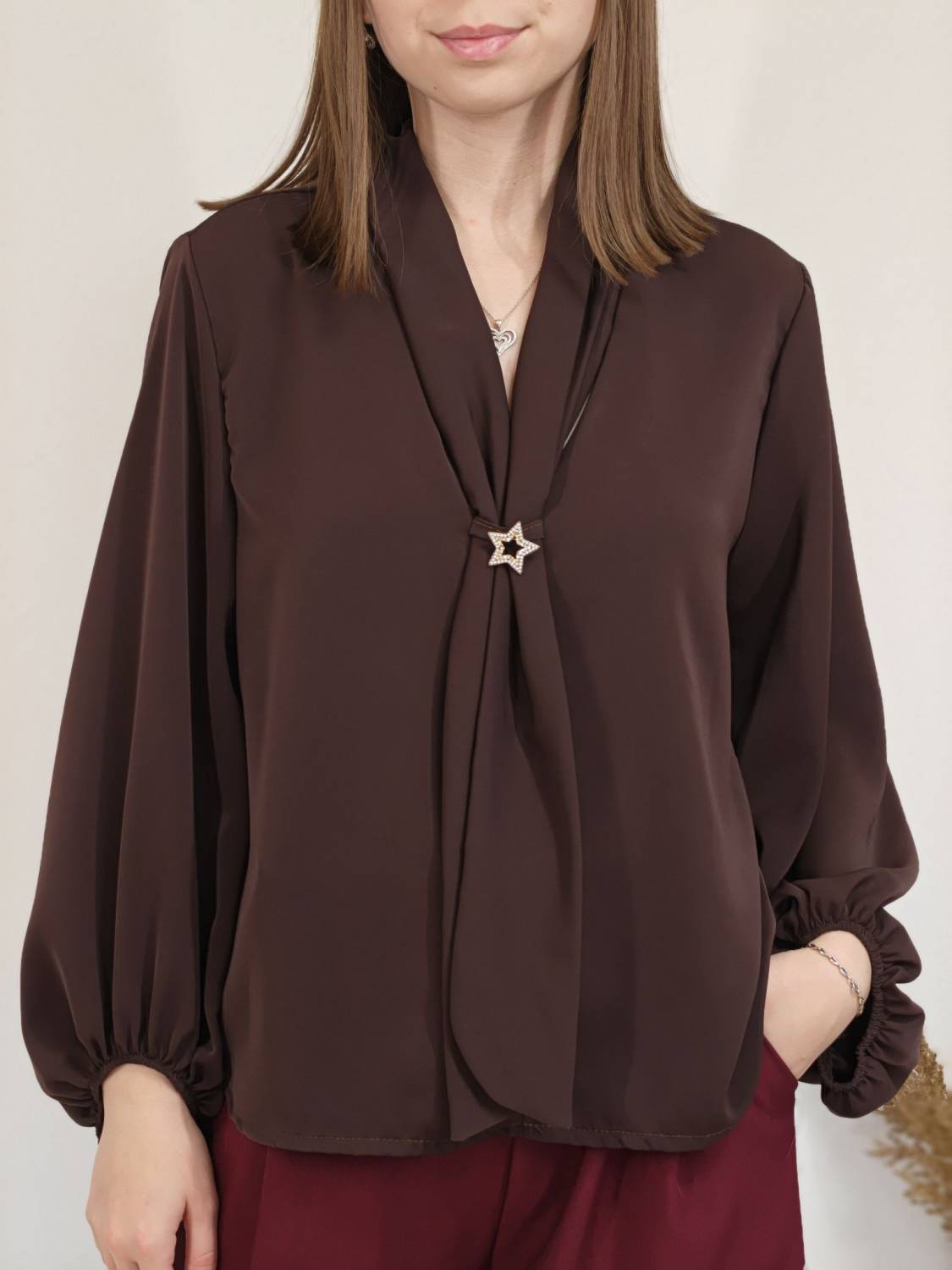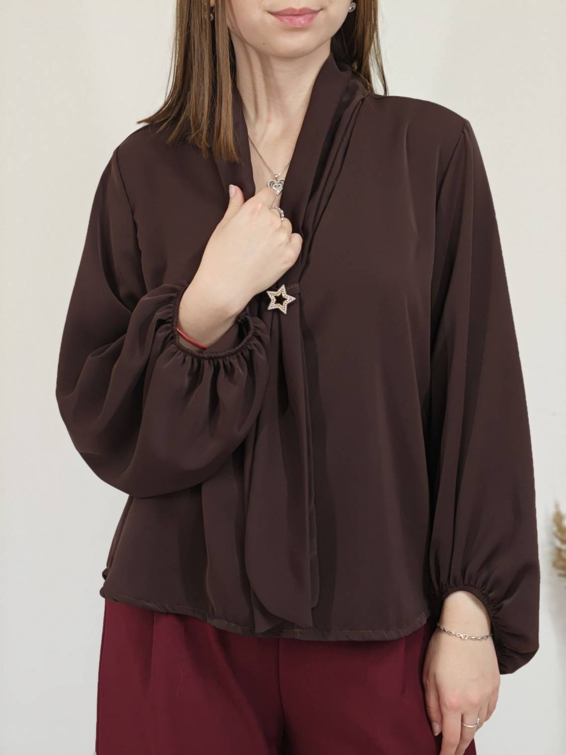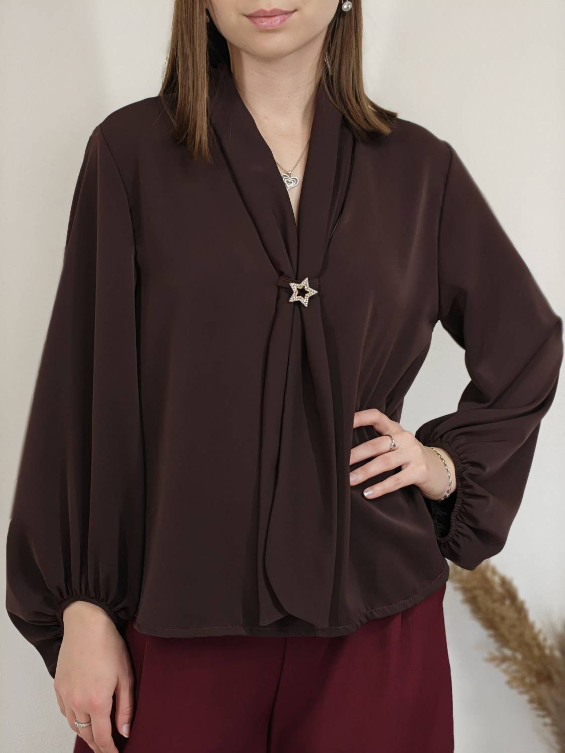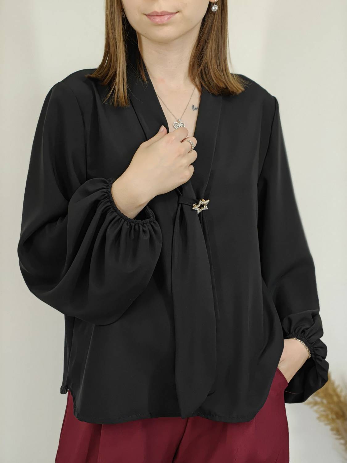 Jednofarebná blúzka s falošnou kravatou a brošňou. Blúzka má širší rukáv zakončený gumičkou.