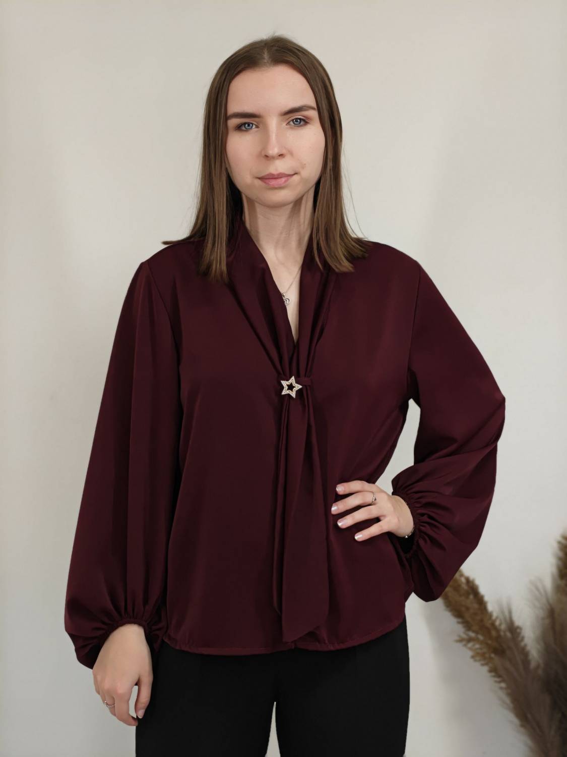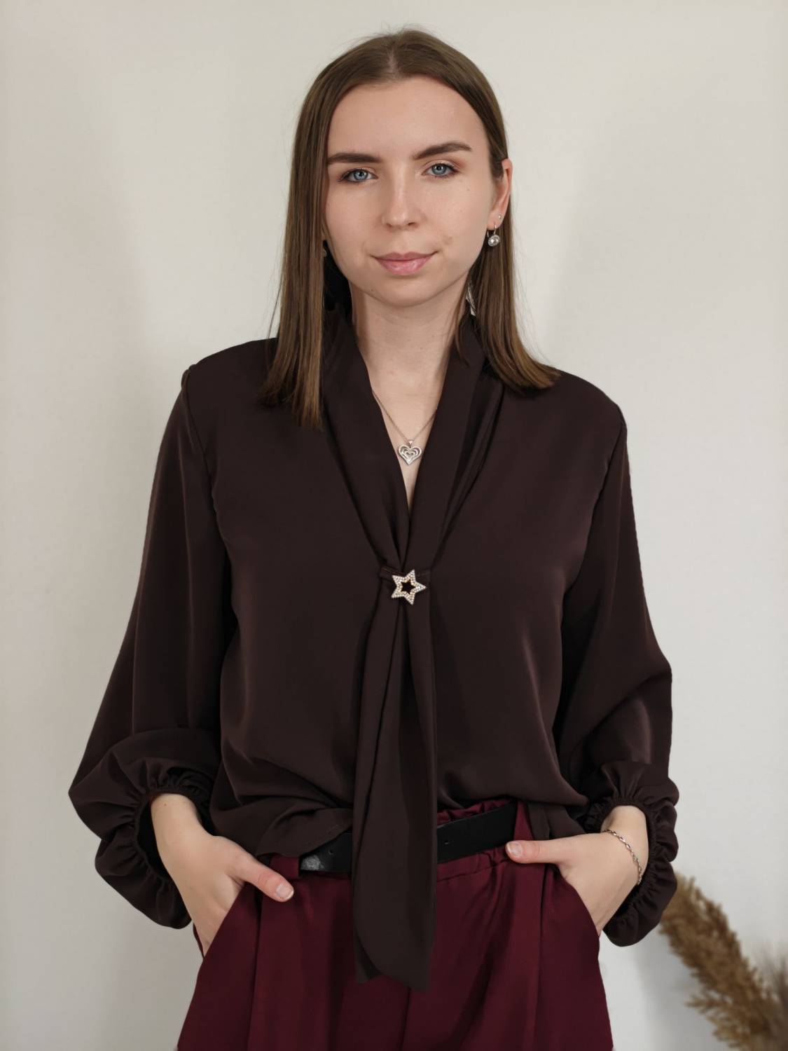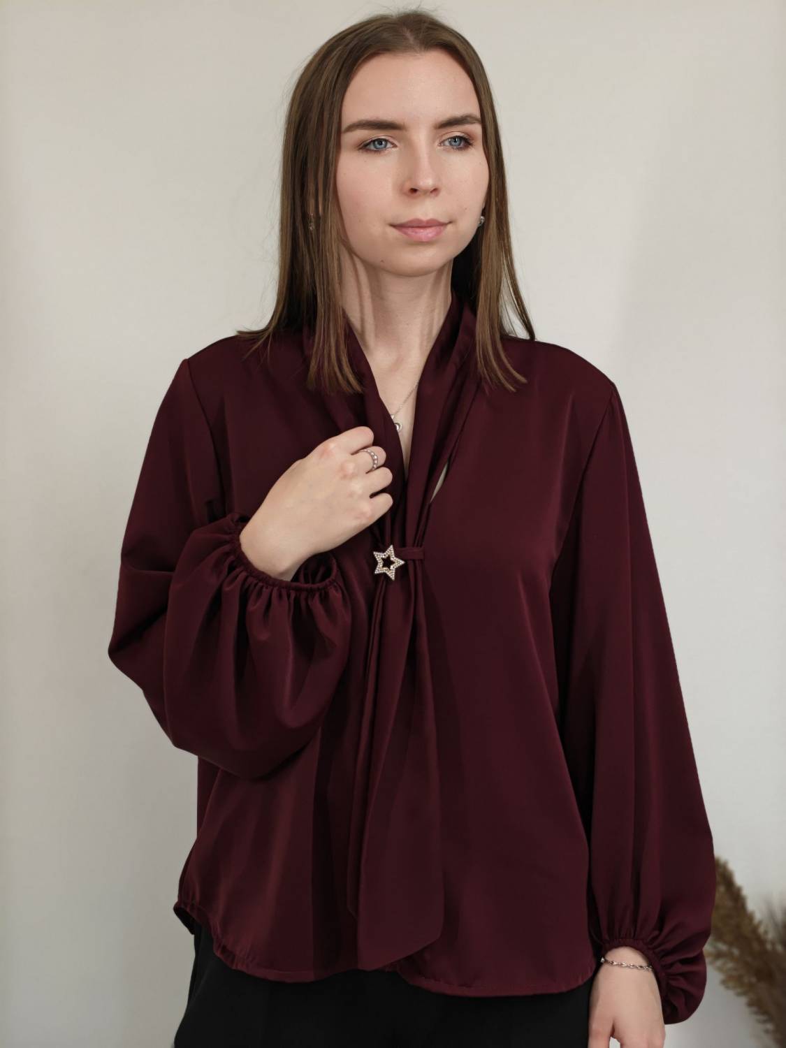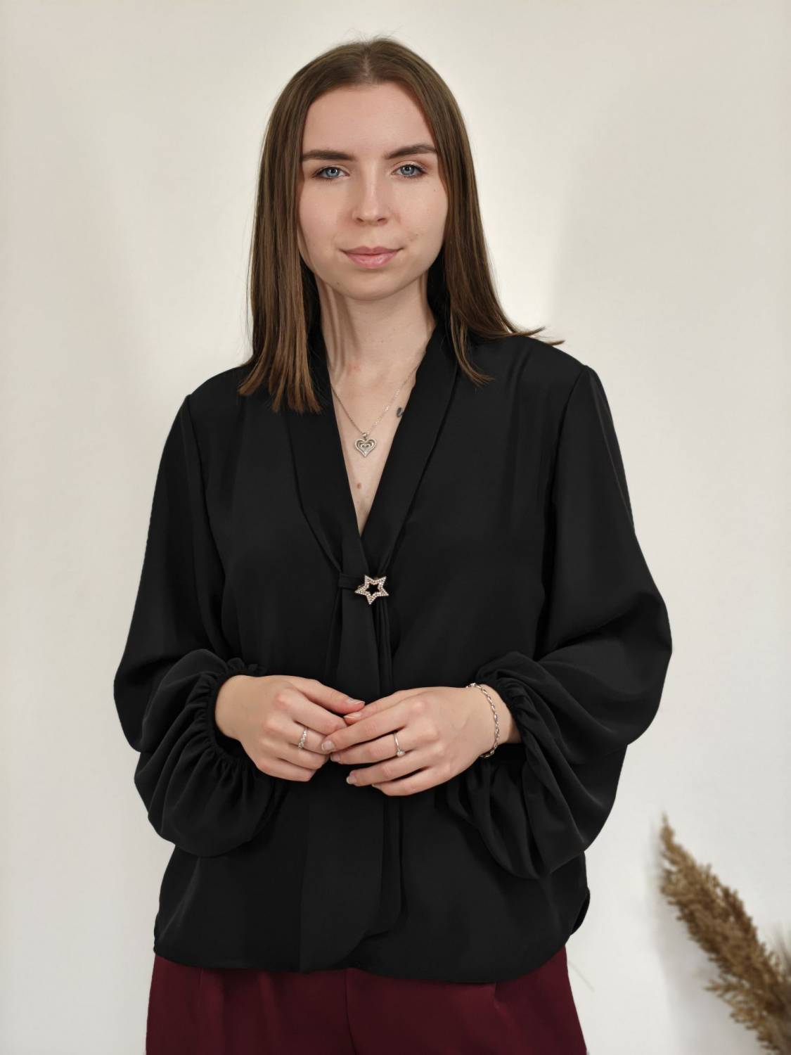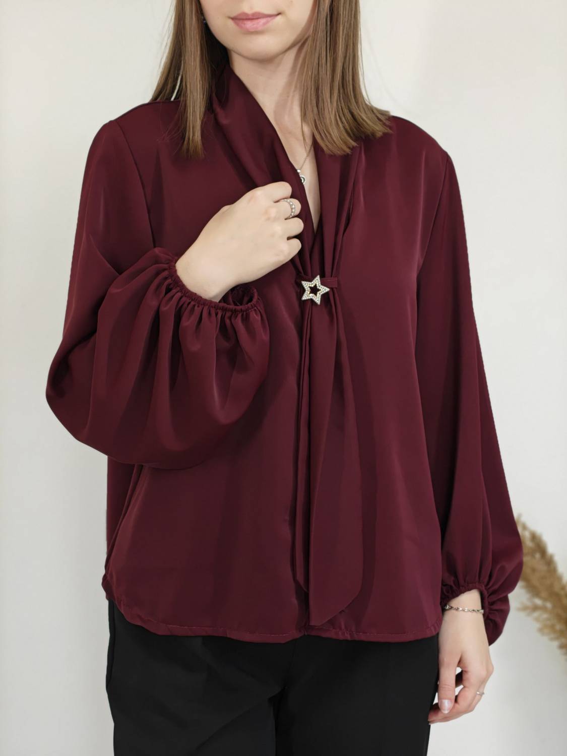 Jednofarebná blúzka s falošnou kravatou a brošňou. Blúzka má širší rukáv zakončený gumičkou.