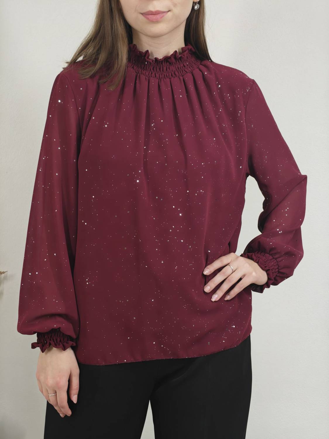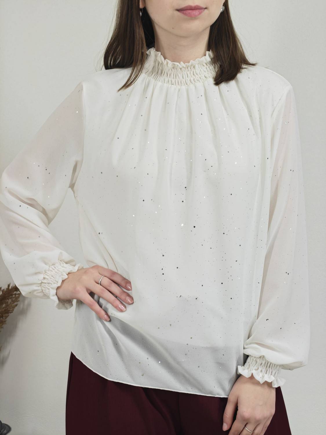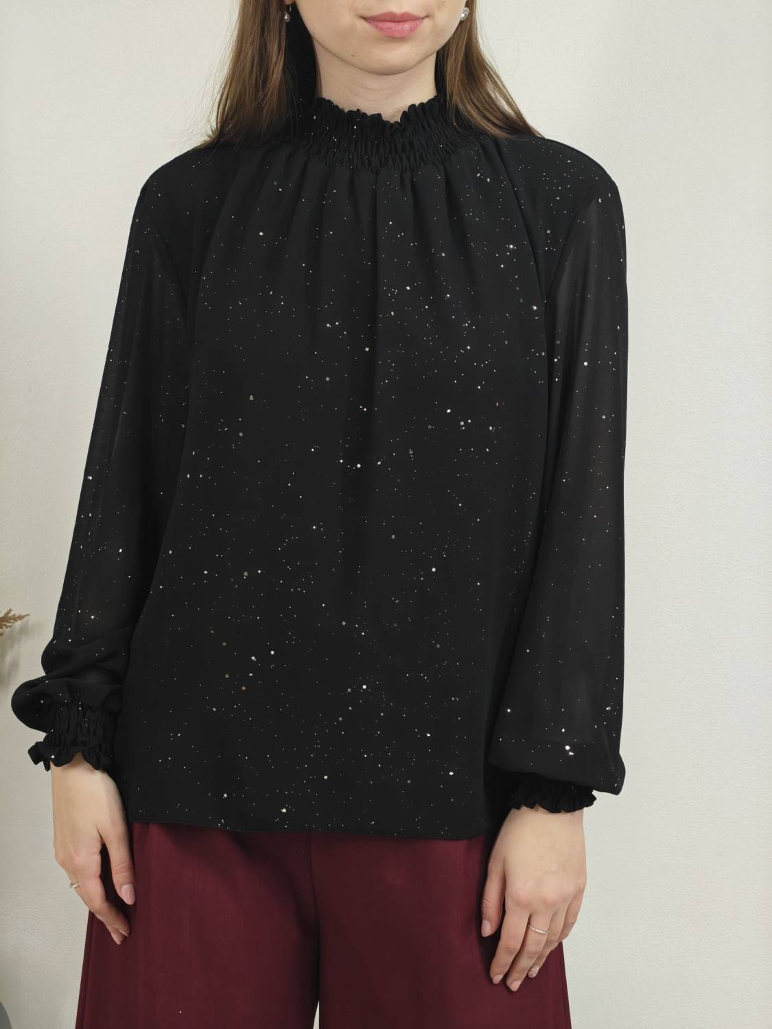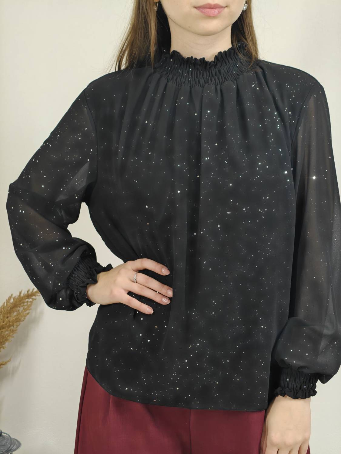 Jednofarebná blúzka s trblietkami, patent pri krku a aj na rukáve je zakončený na gumičku. Rukáv je jemne transparentný. Blúzka má podšívku, takže nepresvitá.