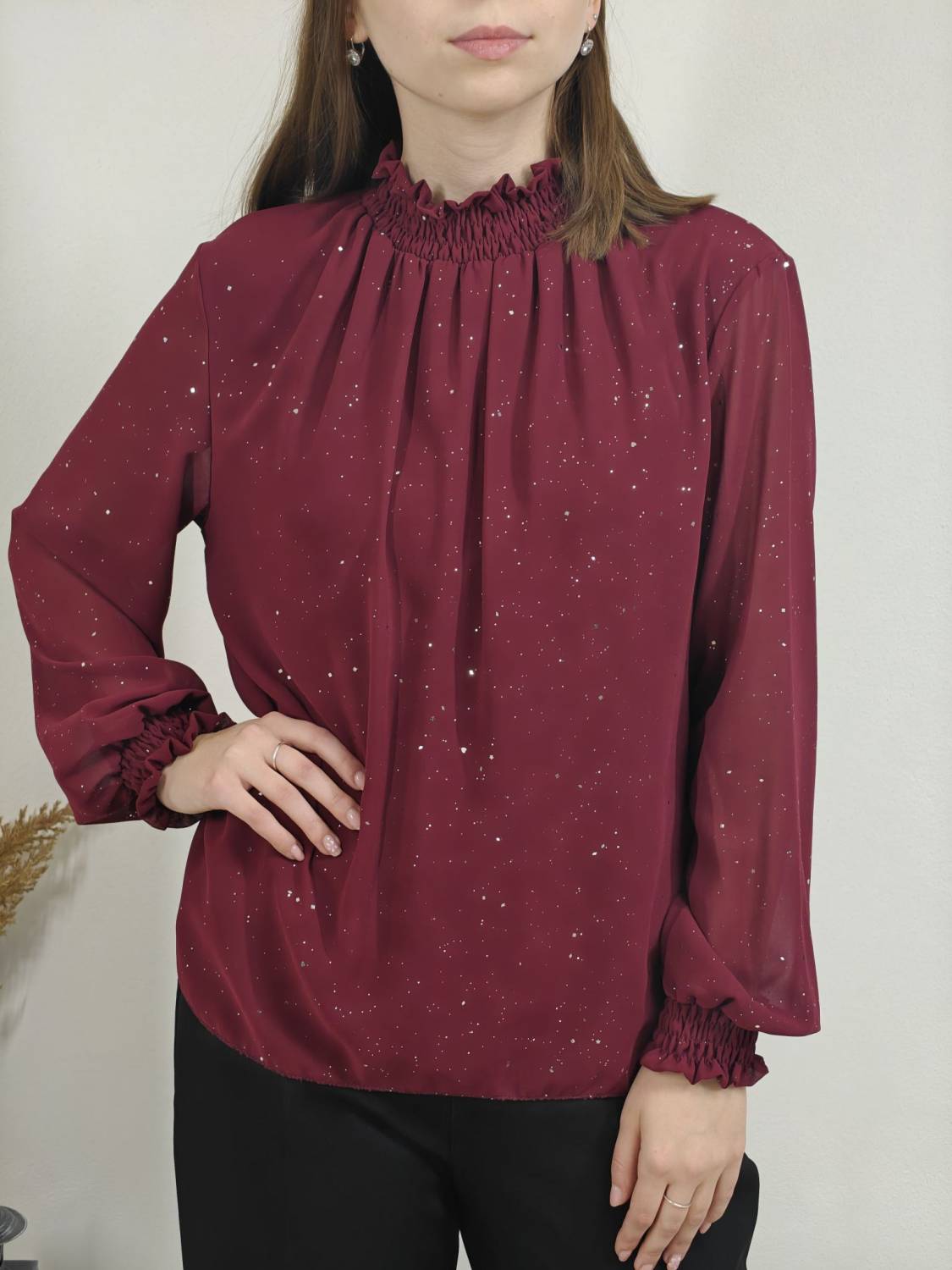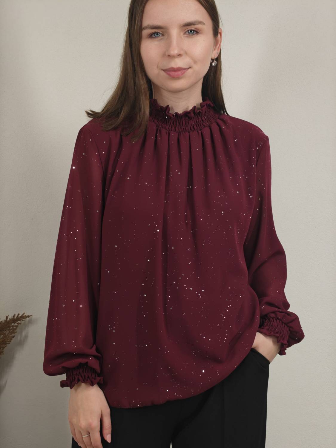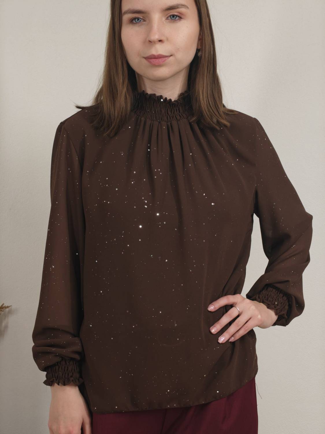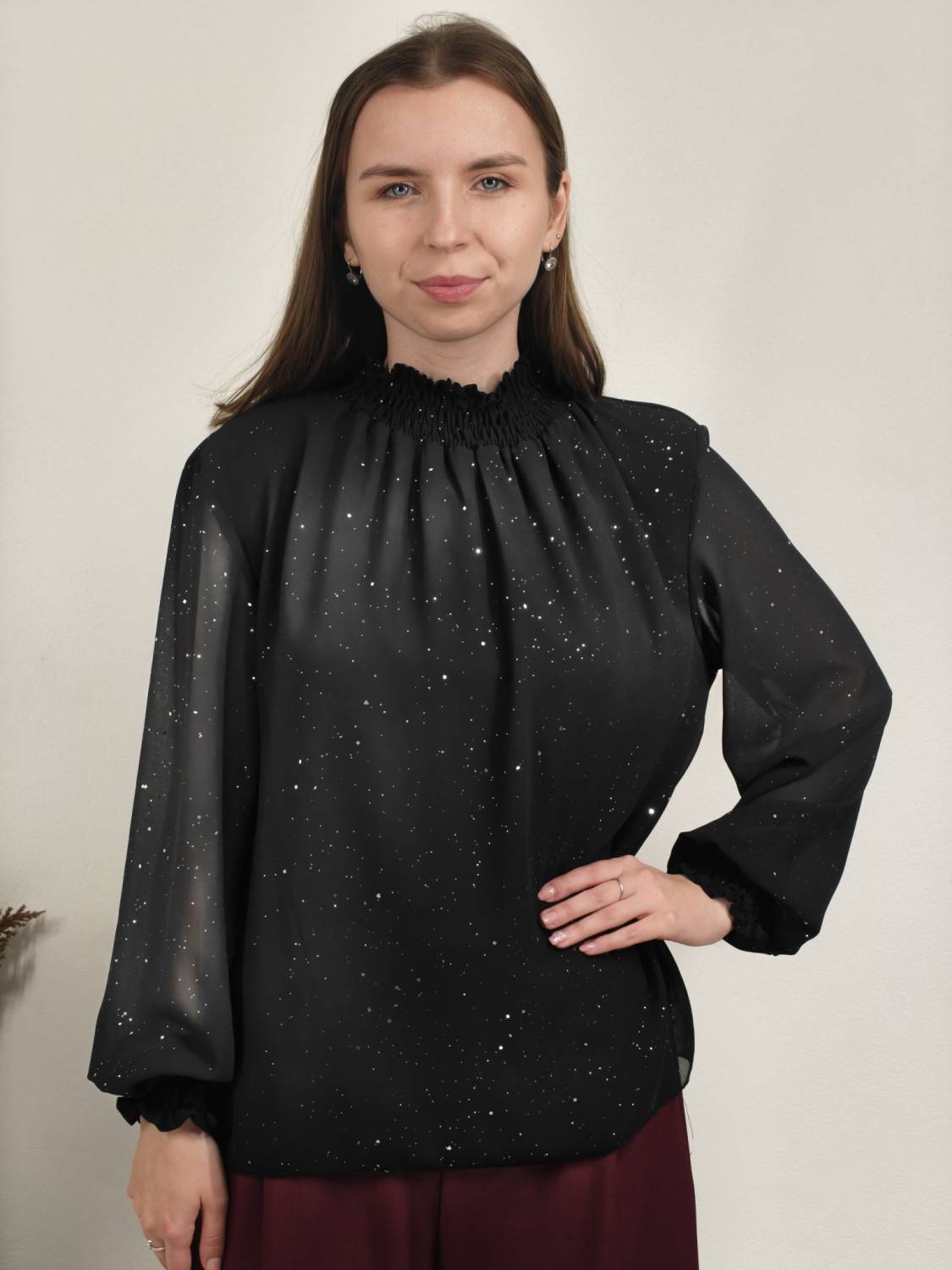 Jednofarebná blúzka s trblietkami, patent pri krku a aj na rukáve je zakončený na gumičku. Rukáv je jemne transparentný. Blúzka má podšívku, takže nepresvitá.