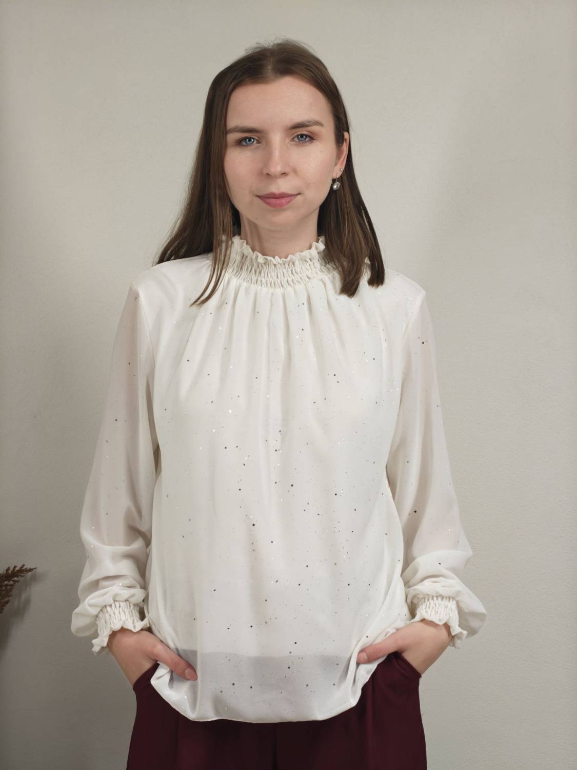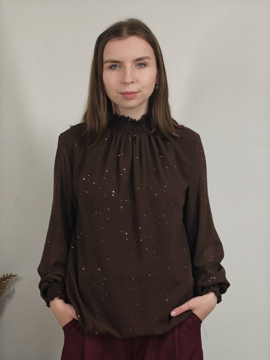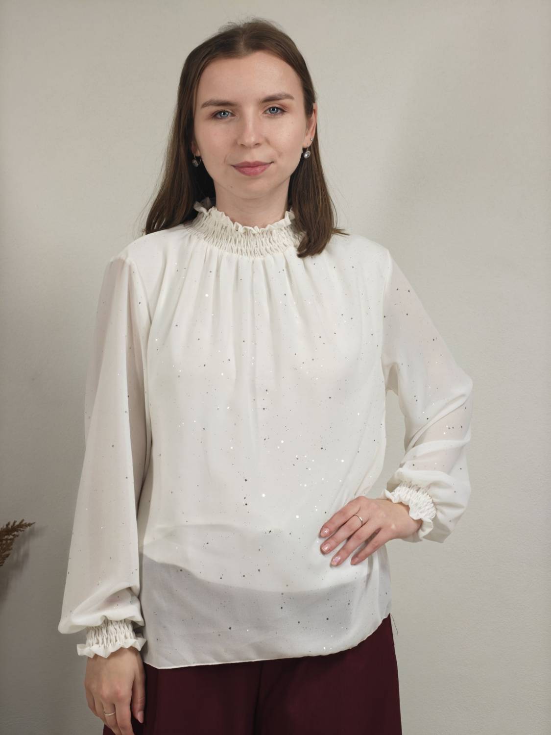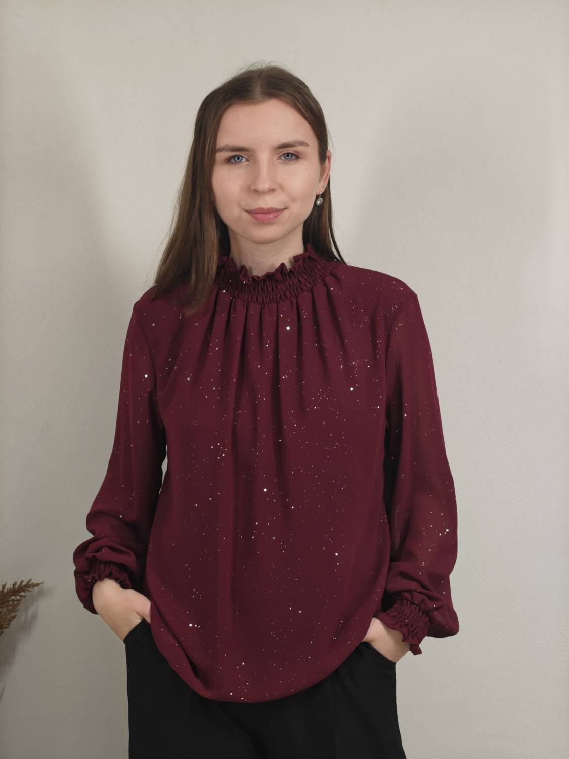 Jednofarebná blúzka s trblietkami, patent pri krku a aj na rukáve je zakončený na gumičku. Rukáv je jemne transparentný. Blúzka má podšívku, takže nepresvitá.