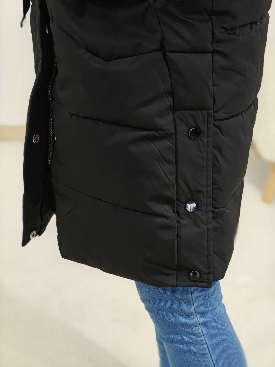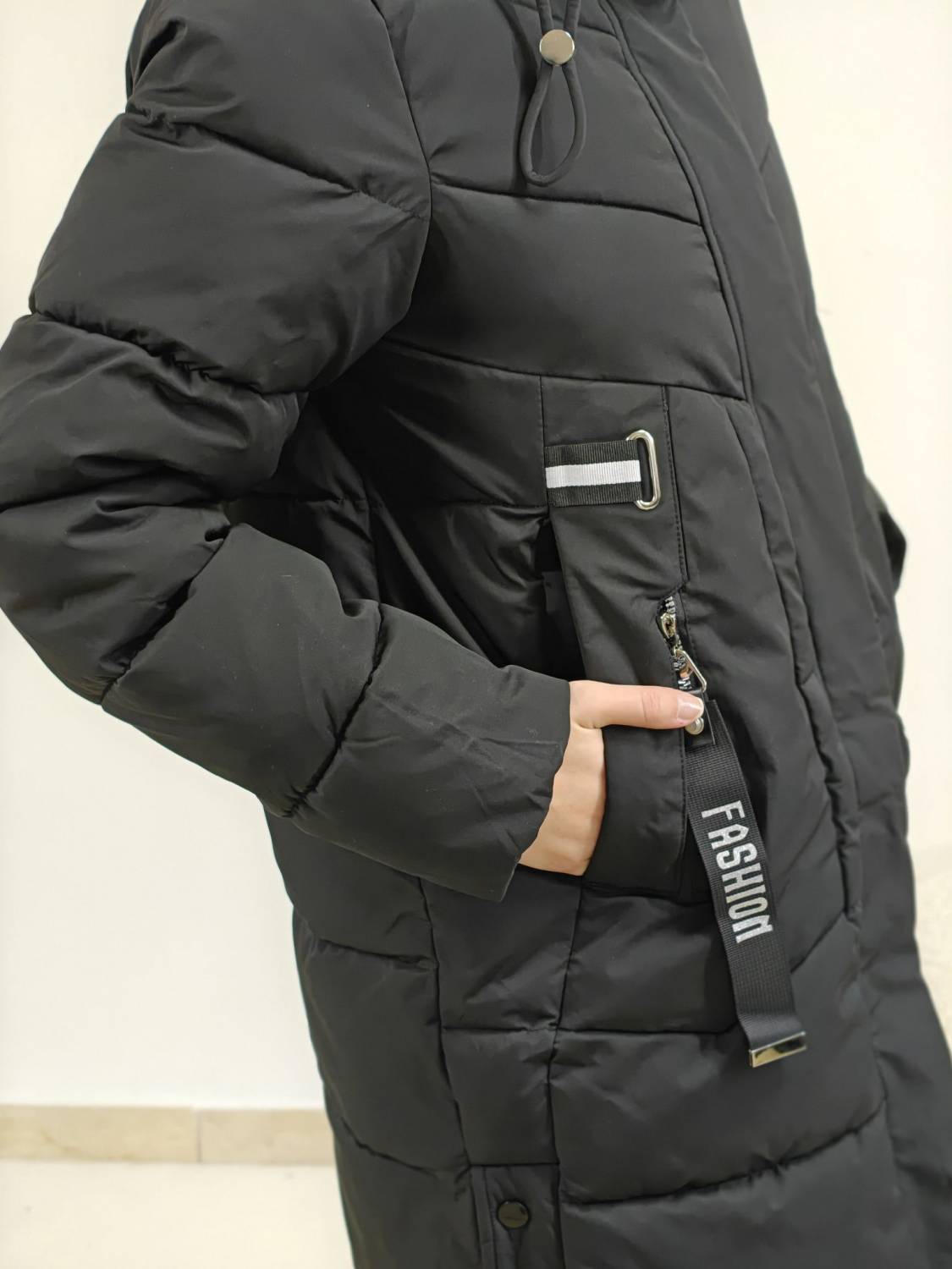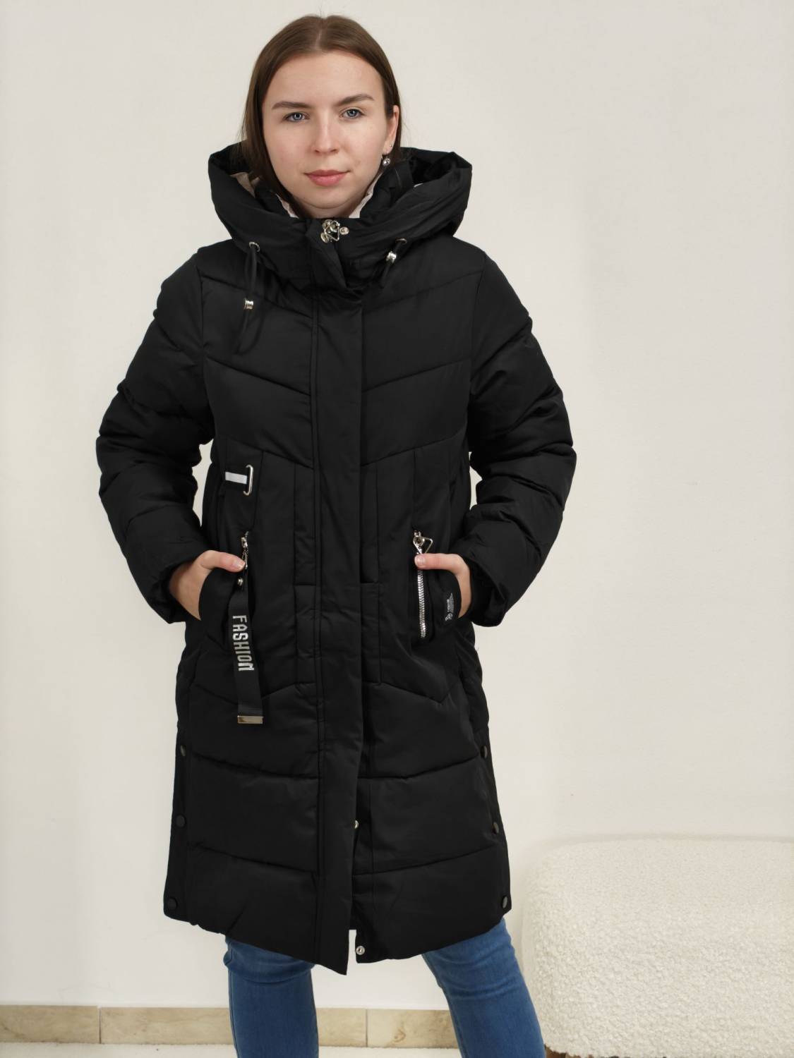 Zimná bunda s kapucňou. Má vrecká a moderné ozdobné prvky.