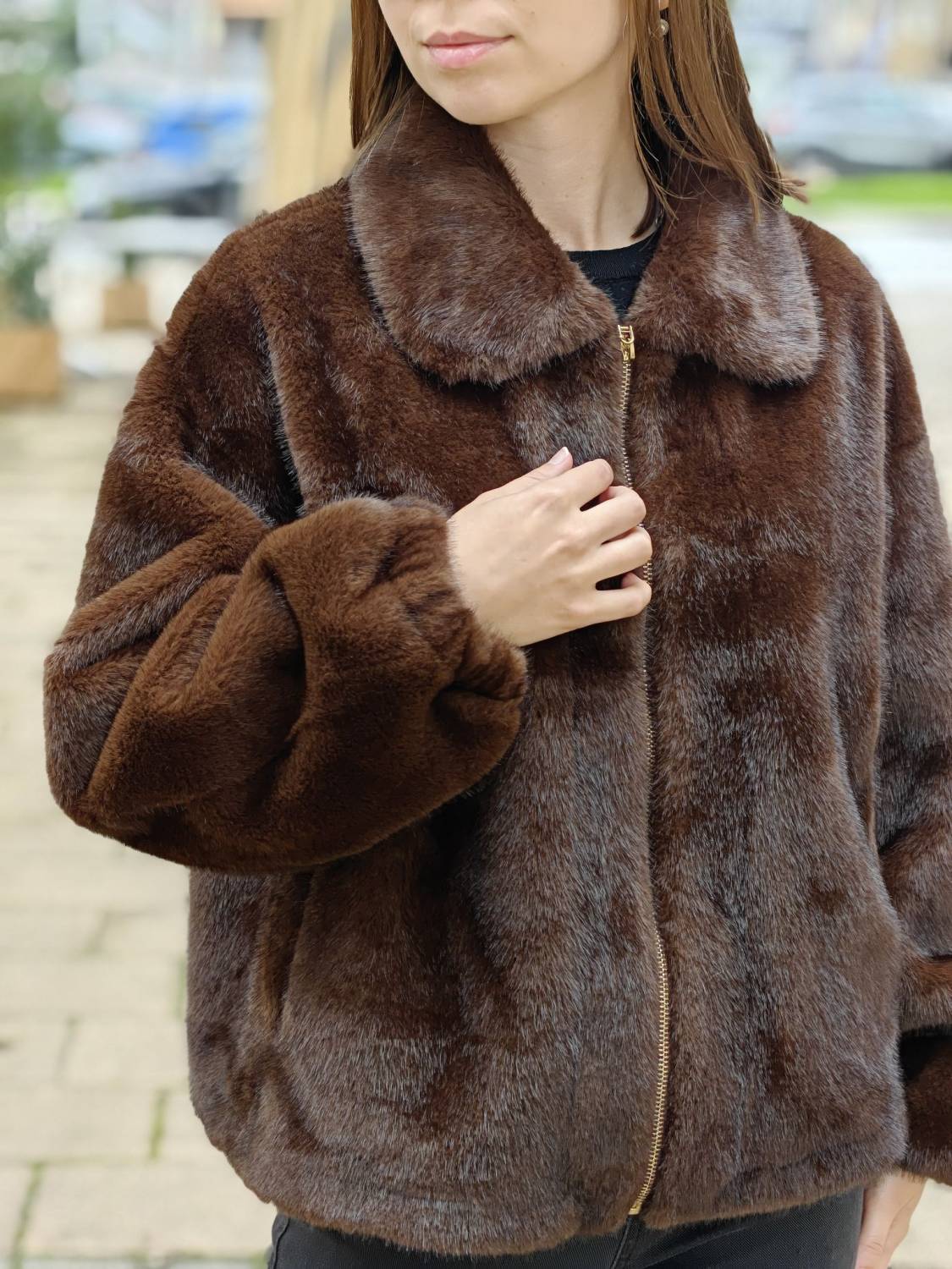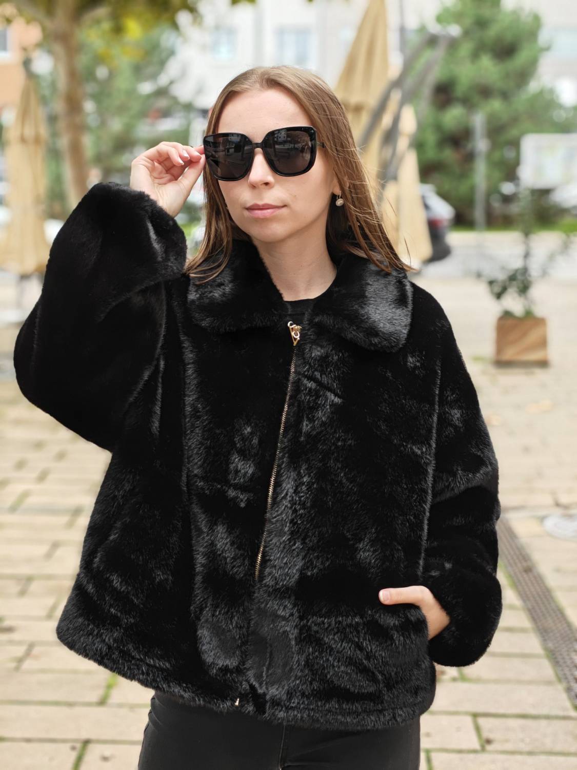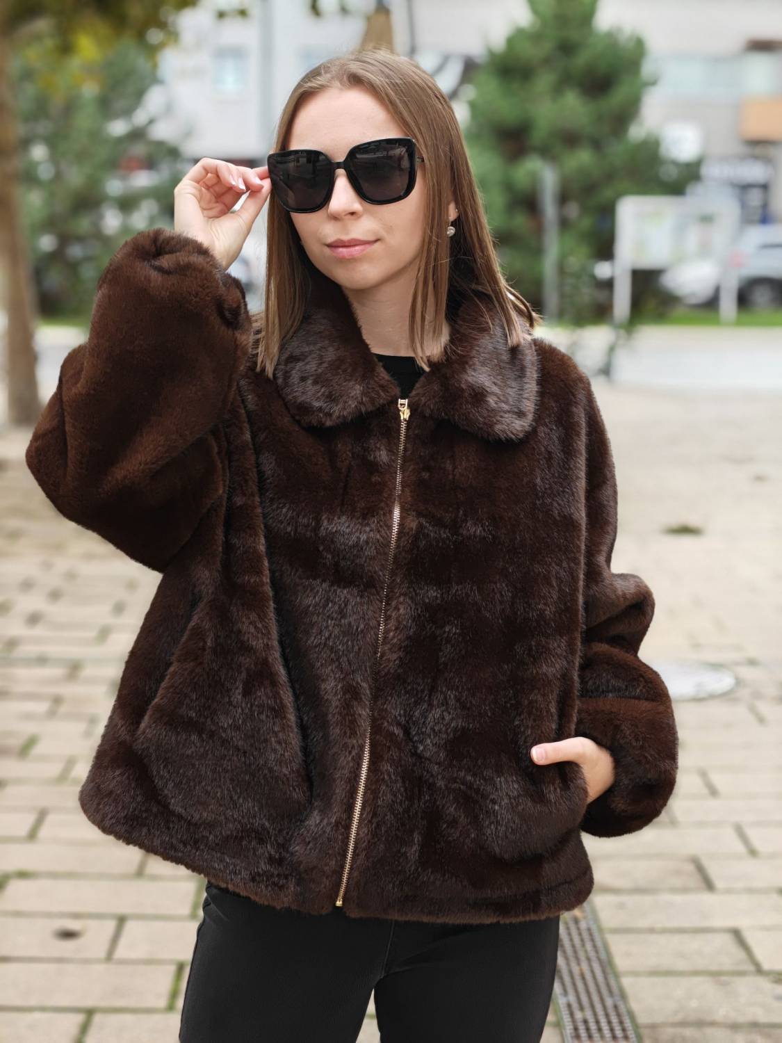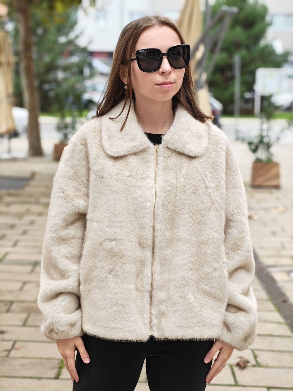 Krátky kožúšok z jemného materiálu na zips, voľnejšieho strihu. Má vrecká a podšivka je z imitácie jelenice.