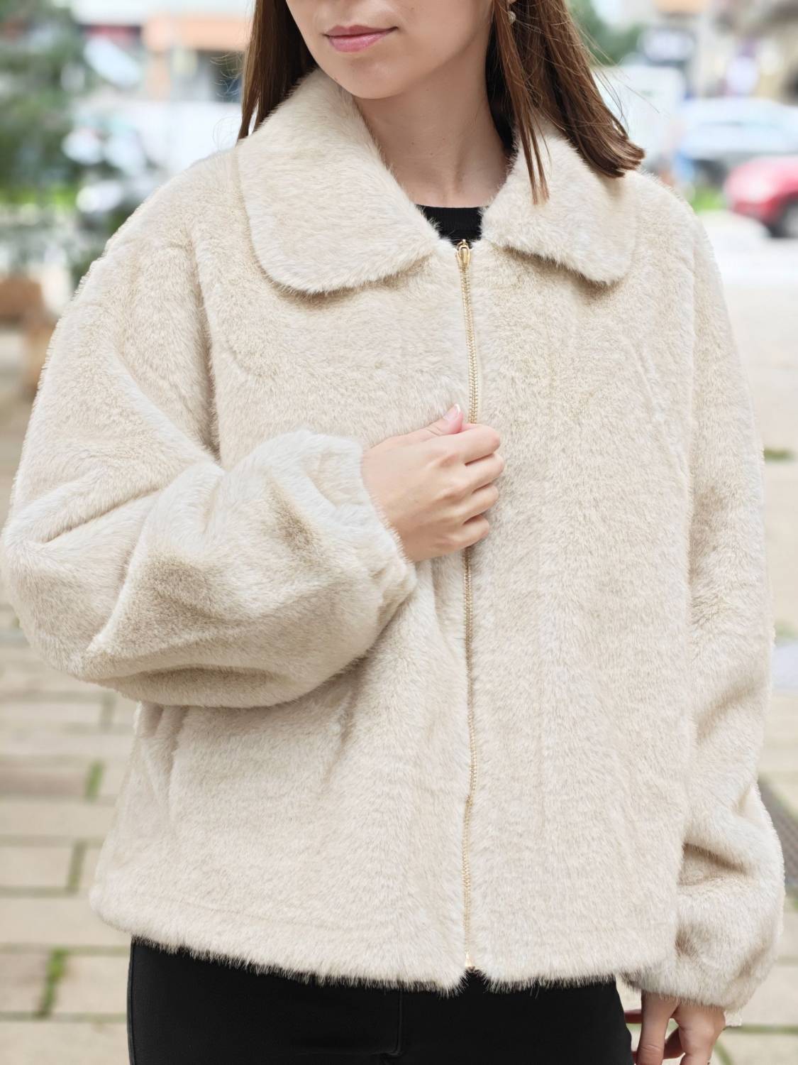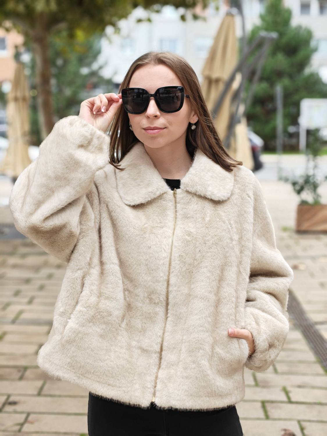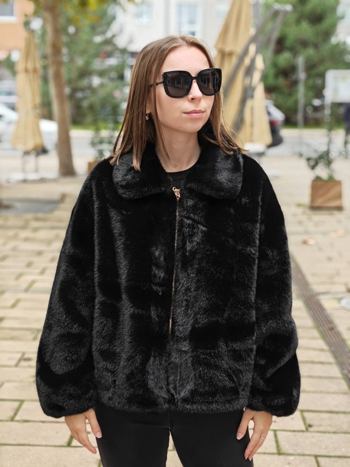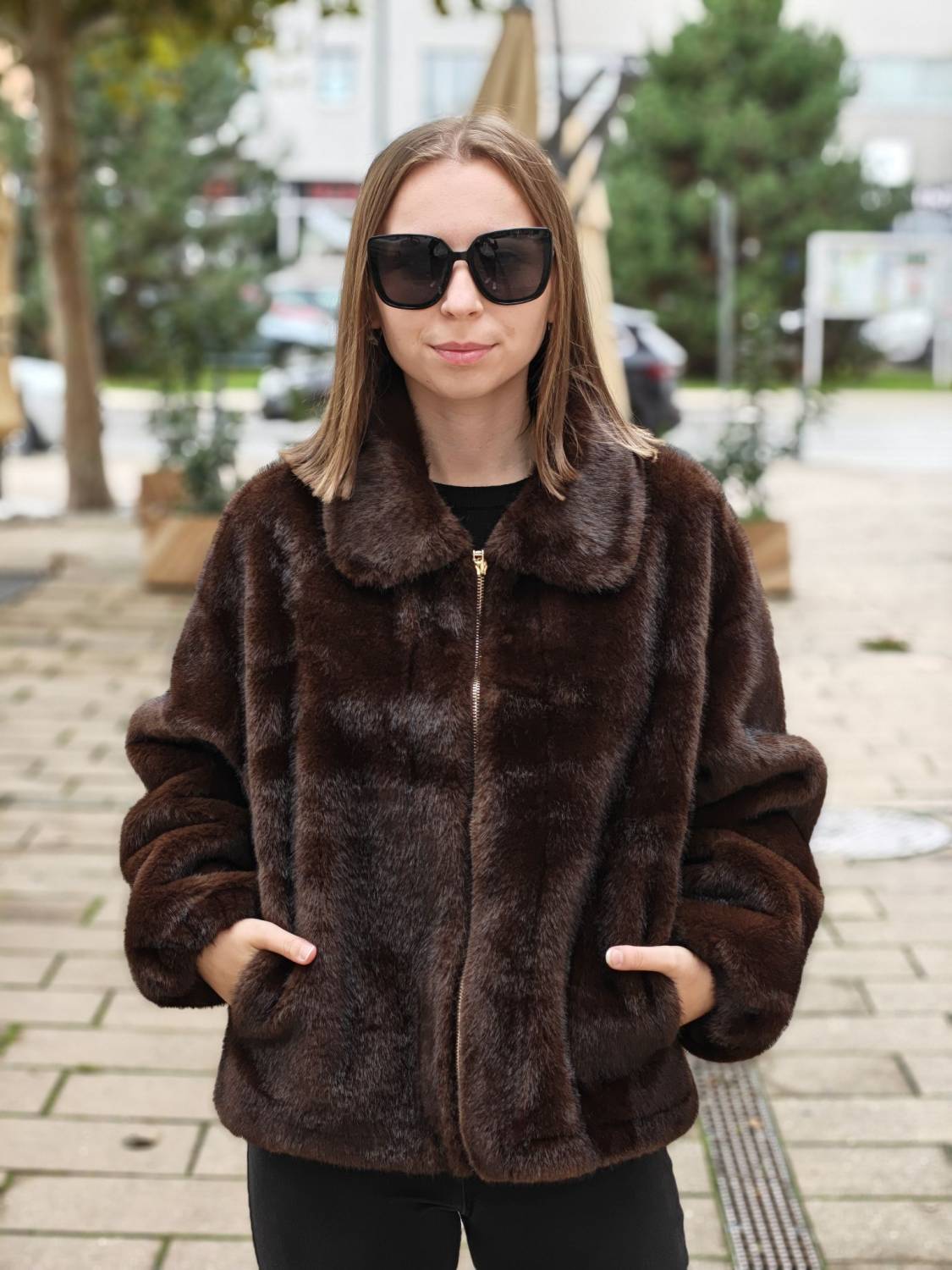 Krátky kožúšok z jemného materiálu na zips, voľnejšieho strihu. Má vrecká a podšivka je z imitácie jelenice.