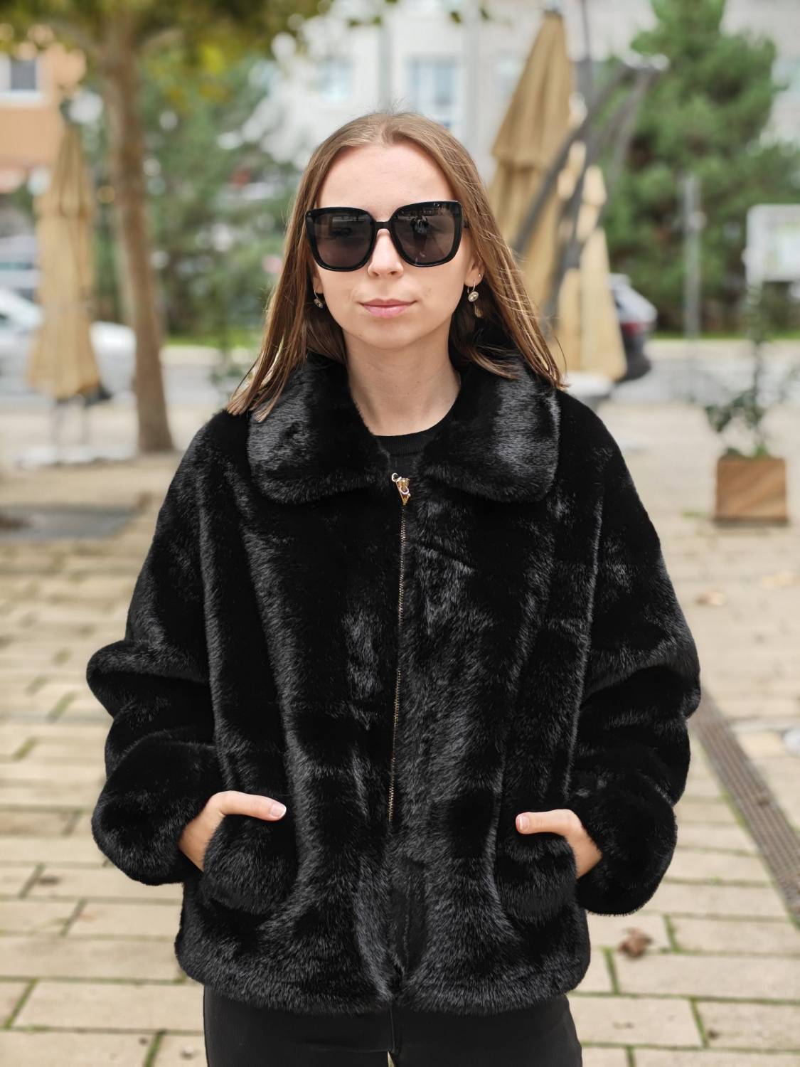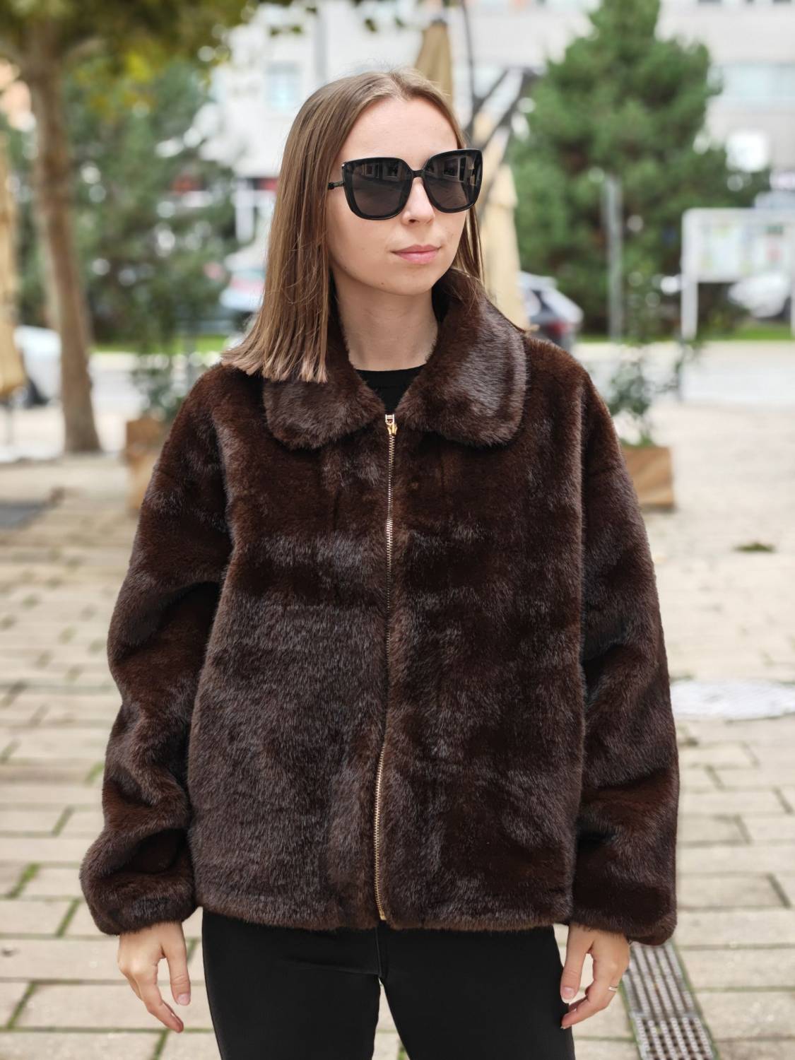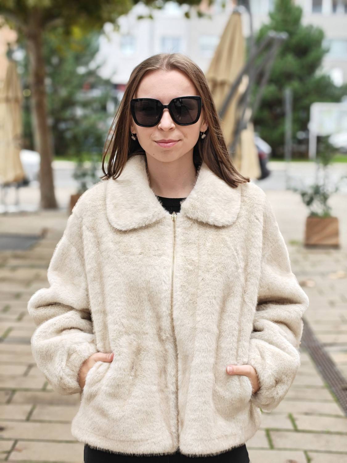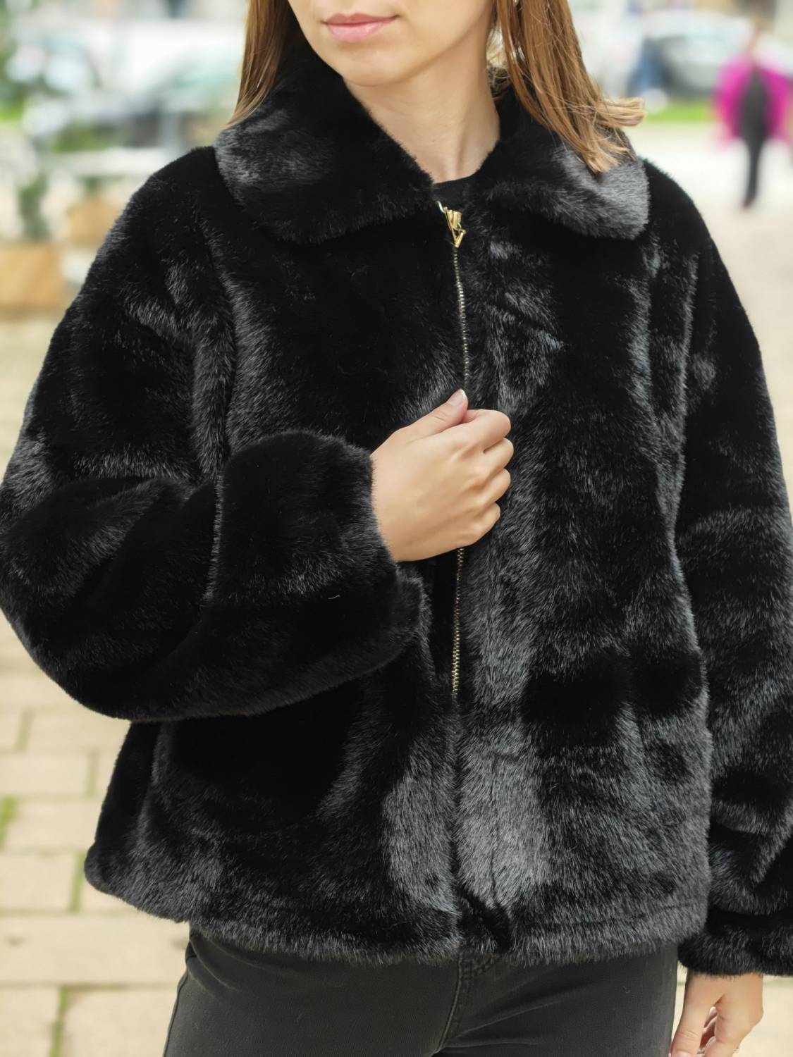 Krátky kožúšok z jemného materiálu na zips, voľnejšieho strihu. Má vrecká a podšivka je z imitácie jelenice.
