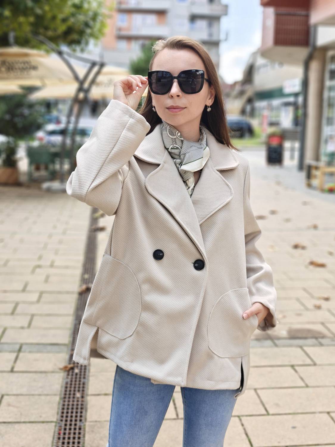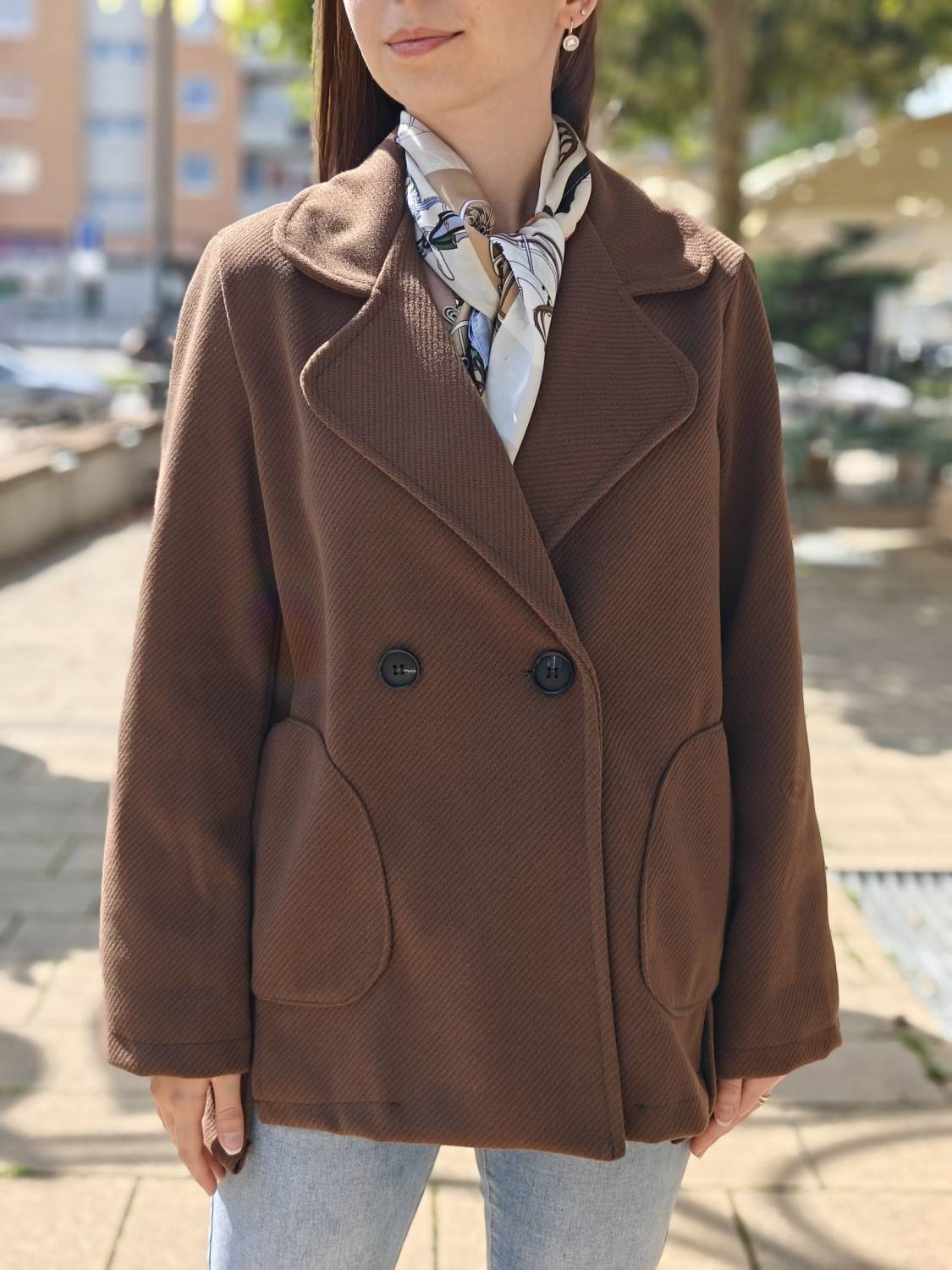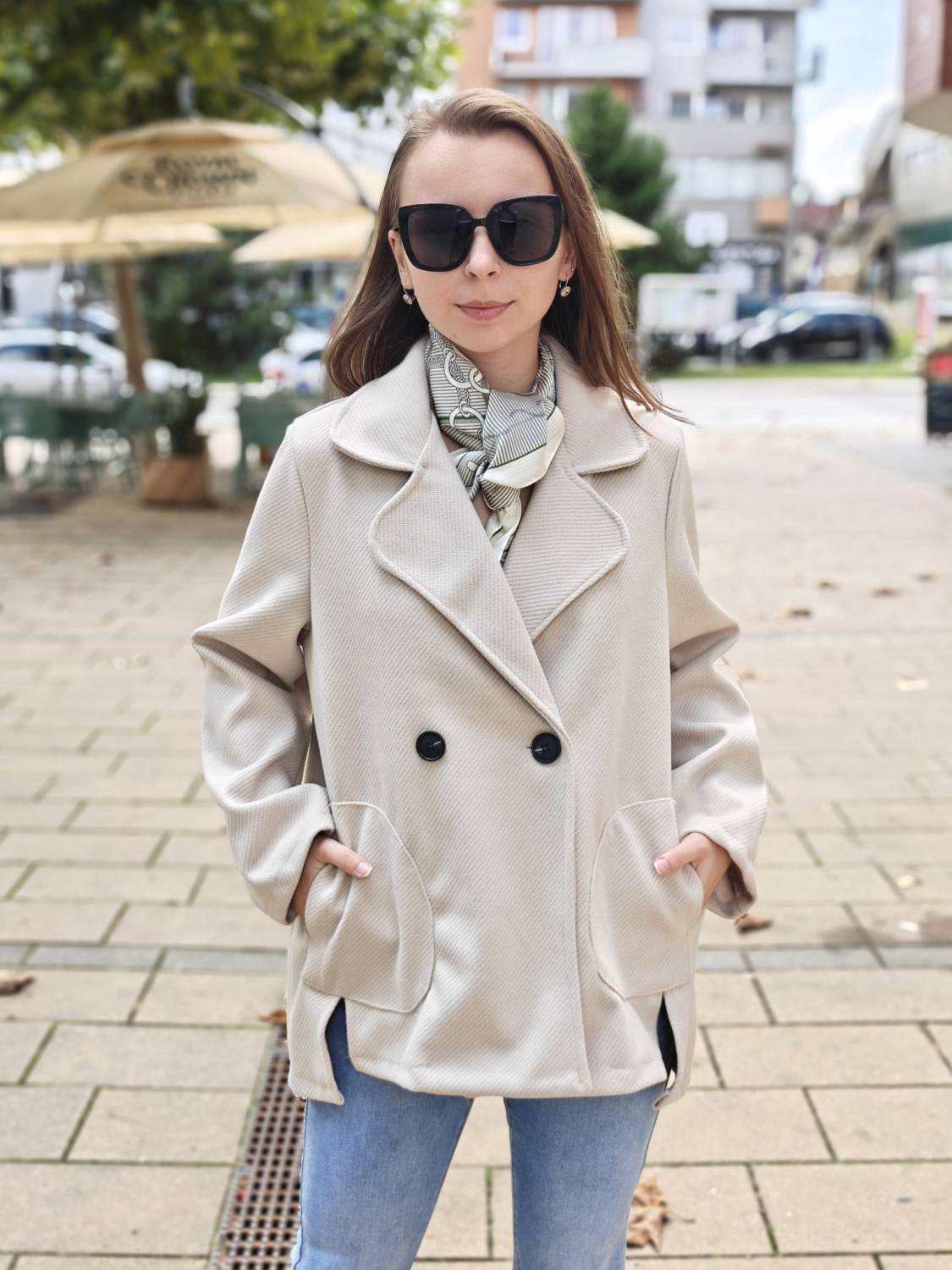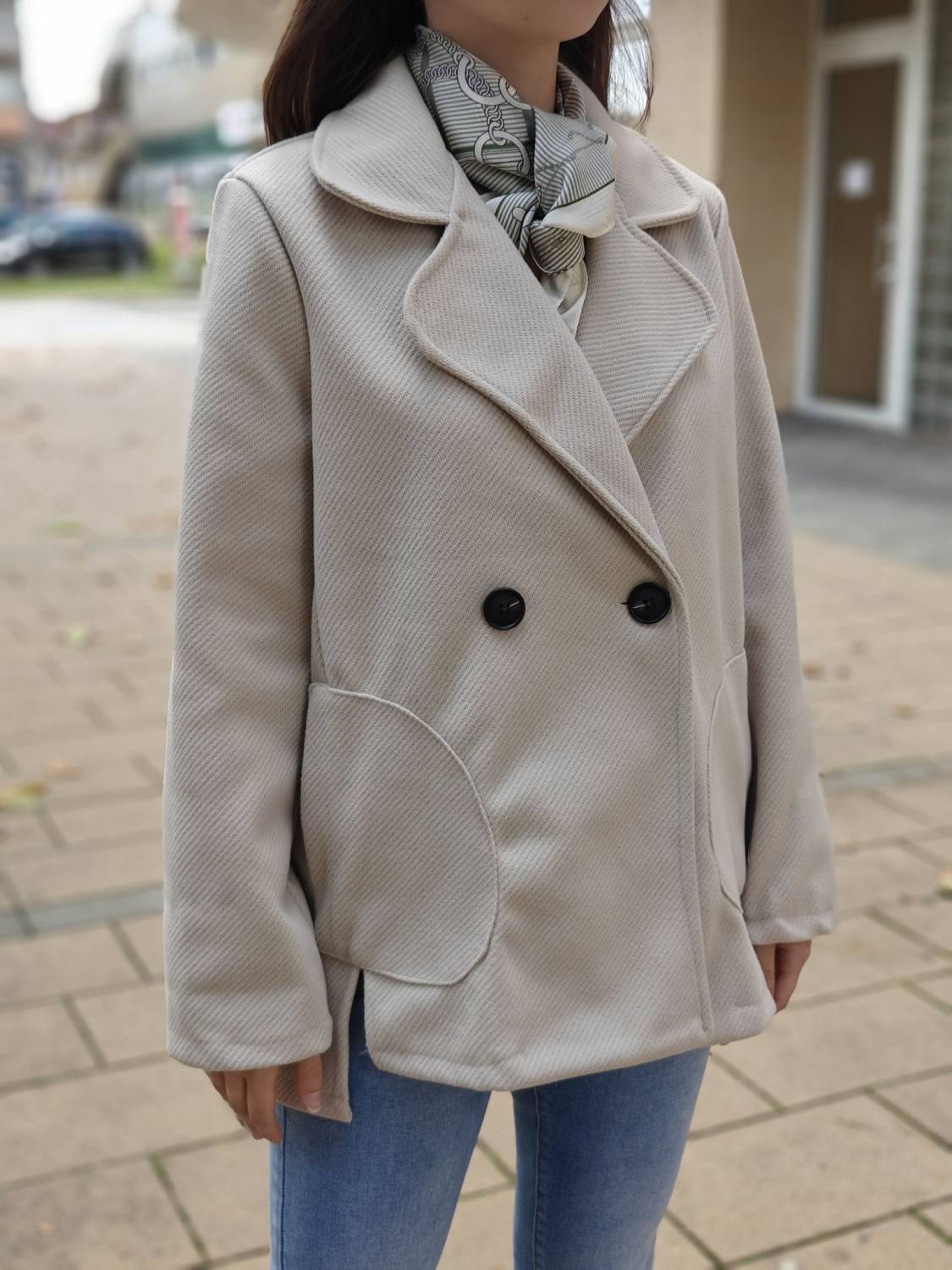 Krátky kabátik na gombík, má aj funkčné vrecká.