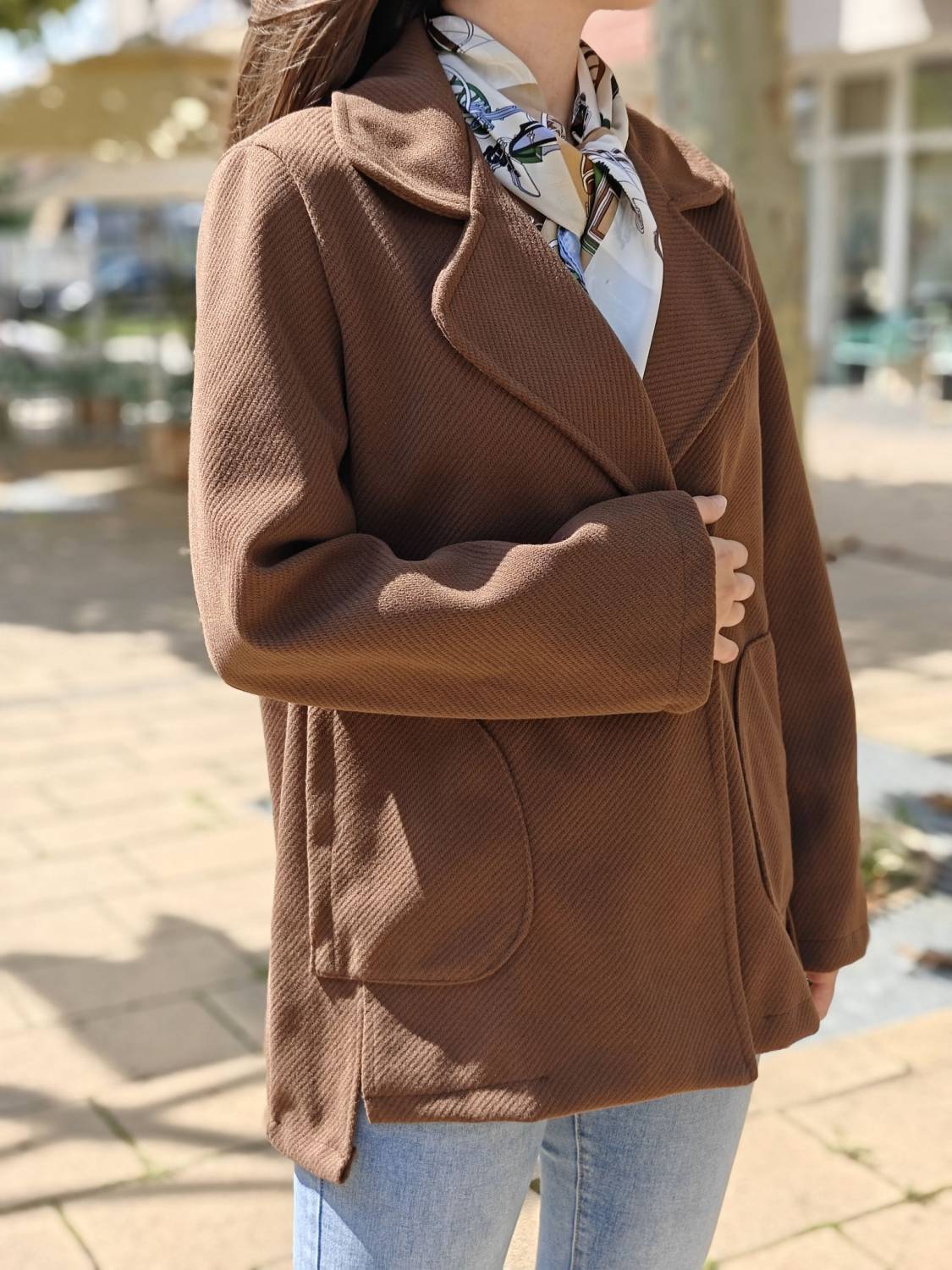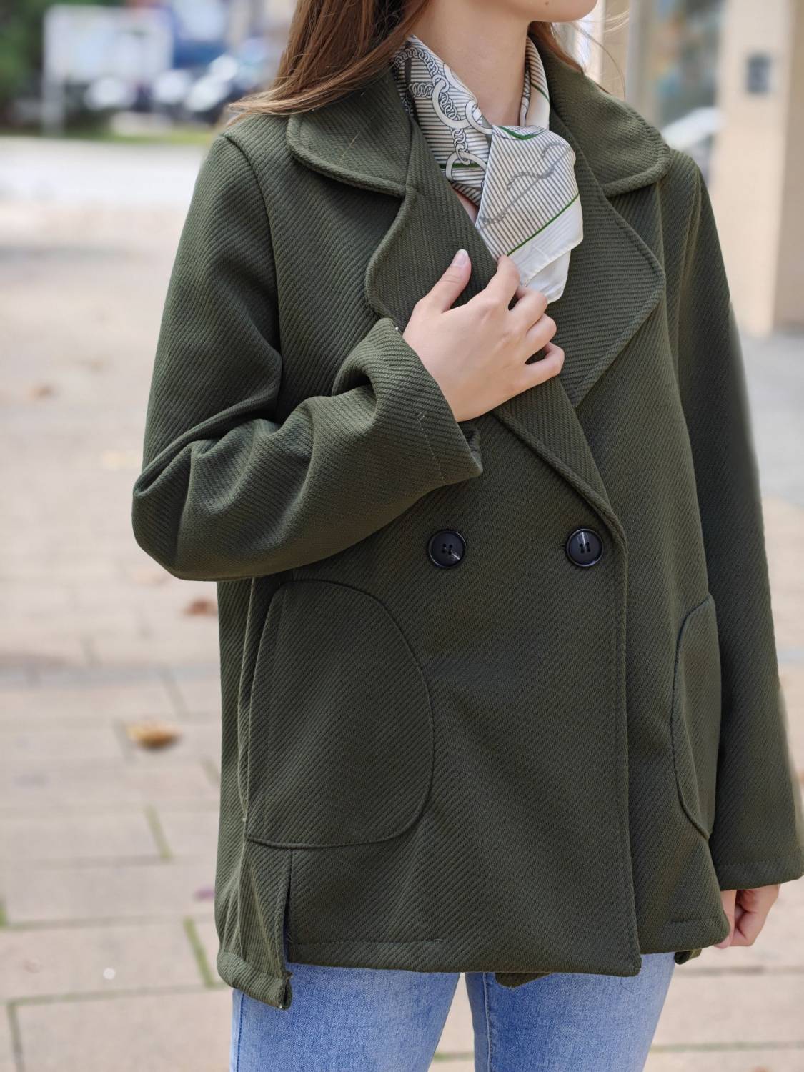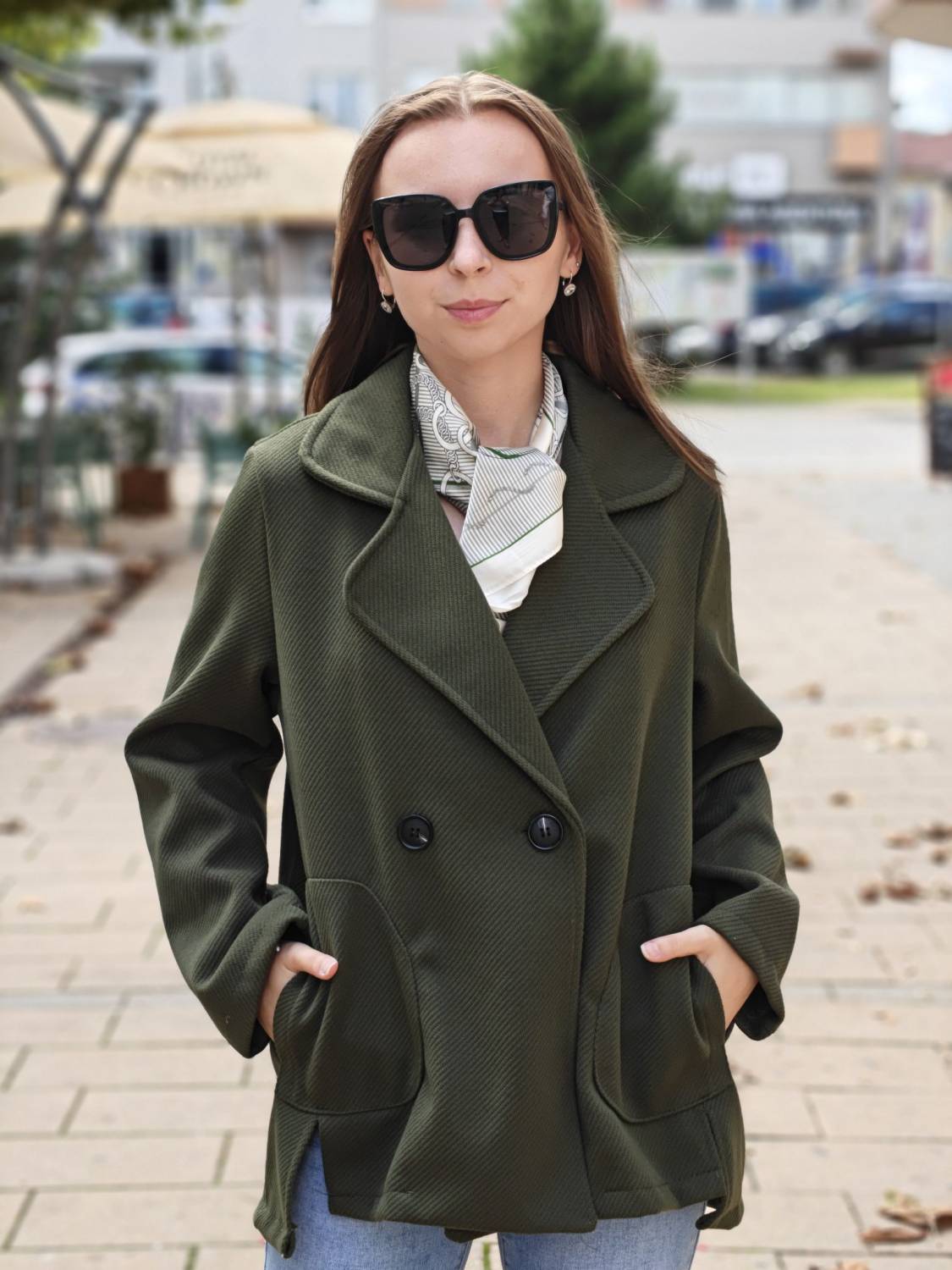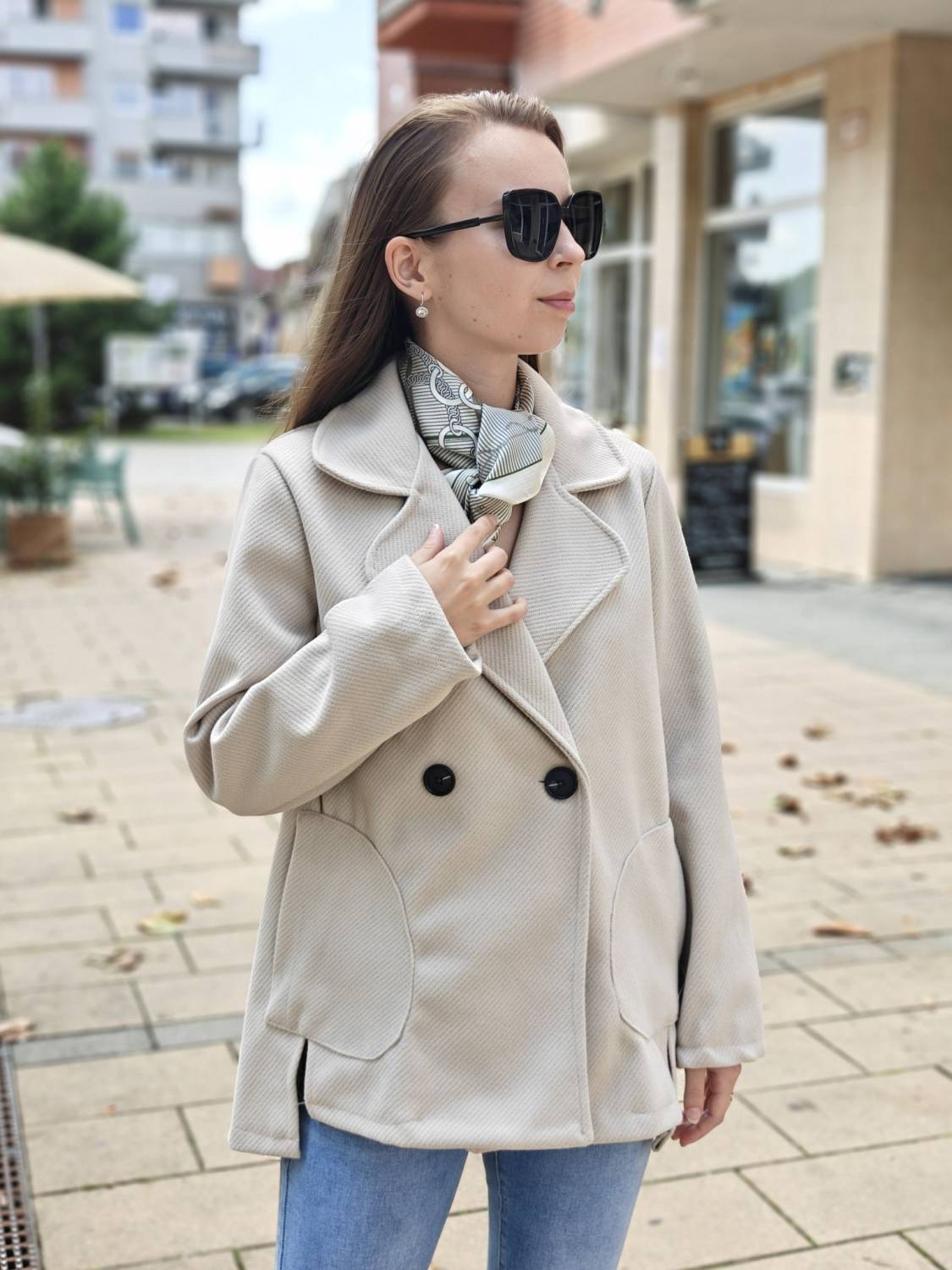 Krátky kabátik na gombík, má aj funkčné vrecká.