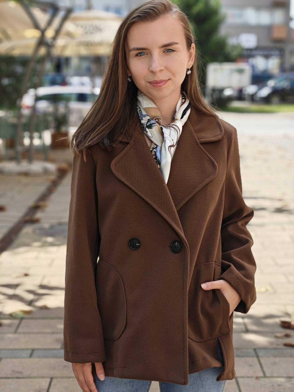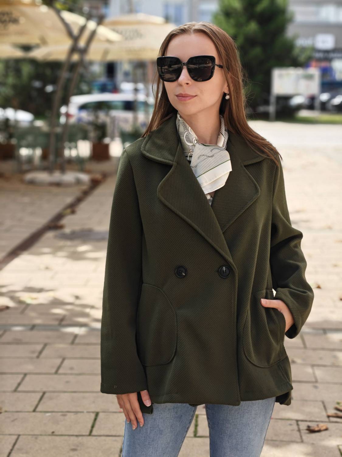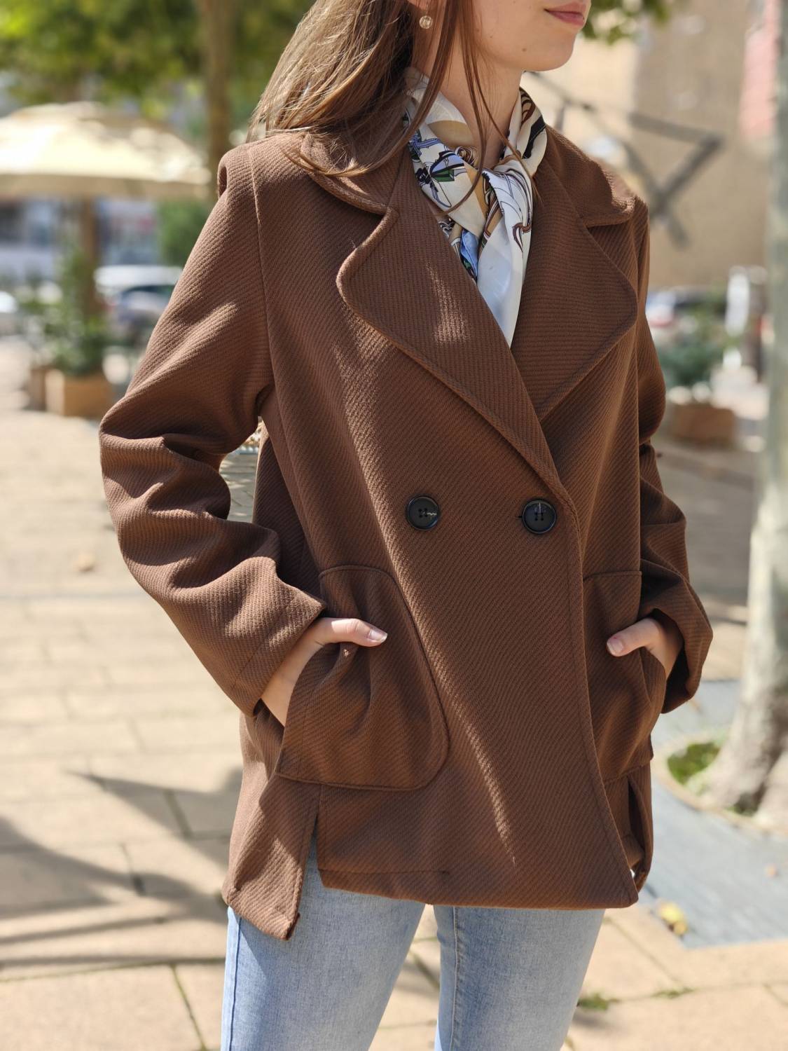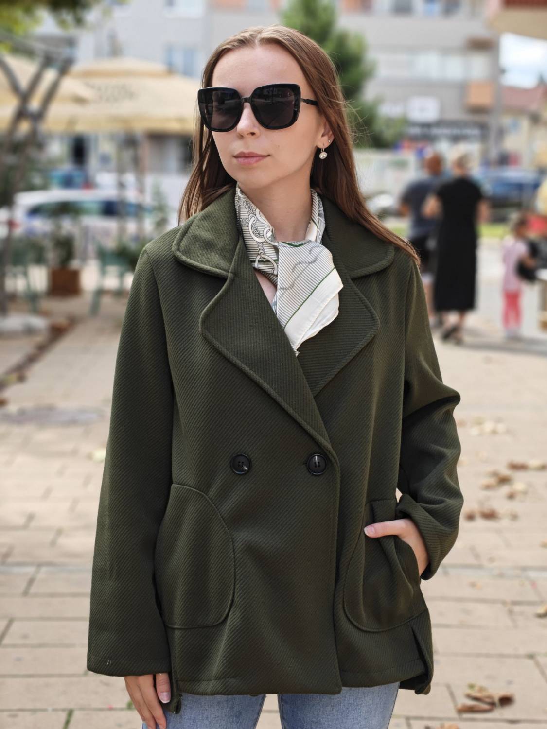 Krátky kabátik na gombík, má aj funkčné vrecká.