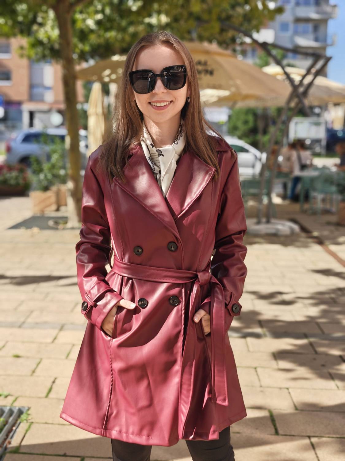 Kabát z jemnej koženky na gombíky s opaskom.