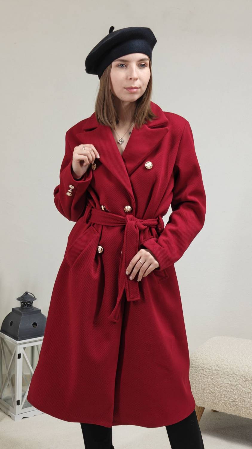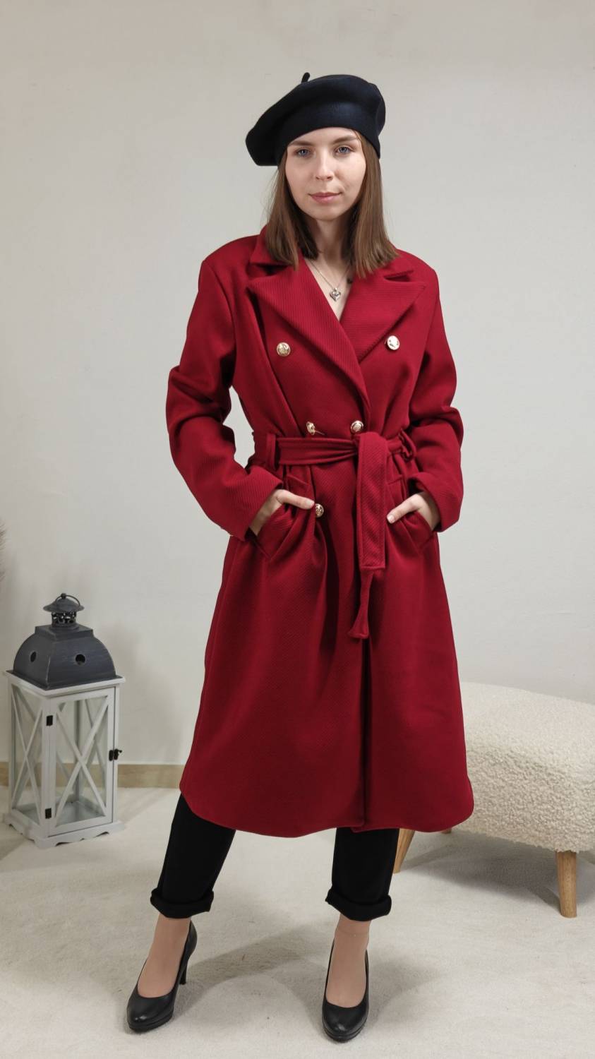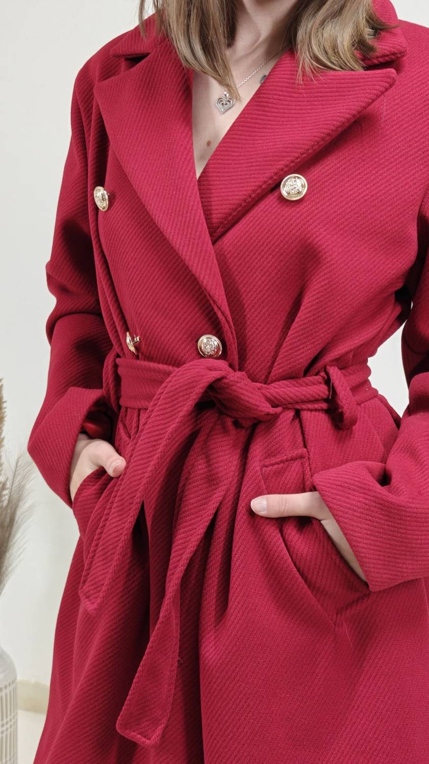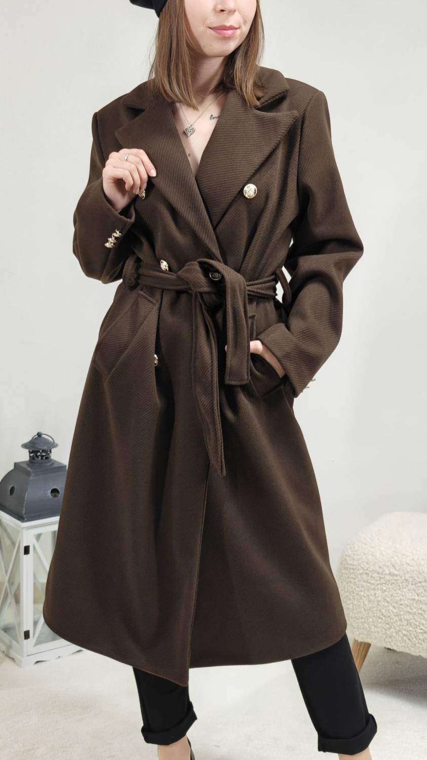 Dlhý podšitý kabát s opaskom, zapínanie na gombíky v zlatej farbe. kabát má aj vrecká.