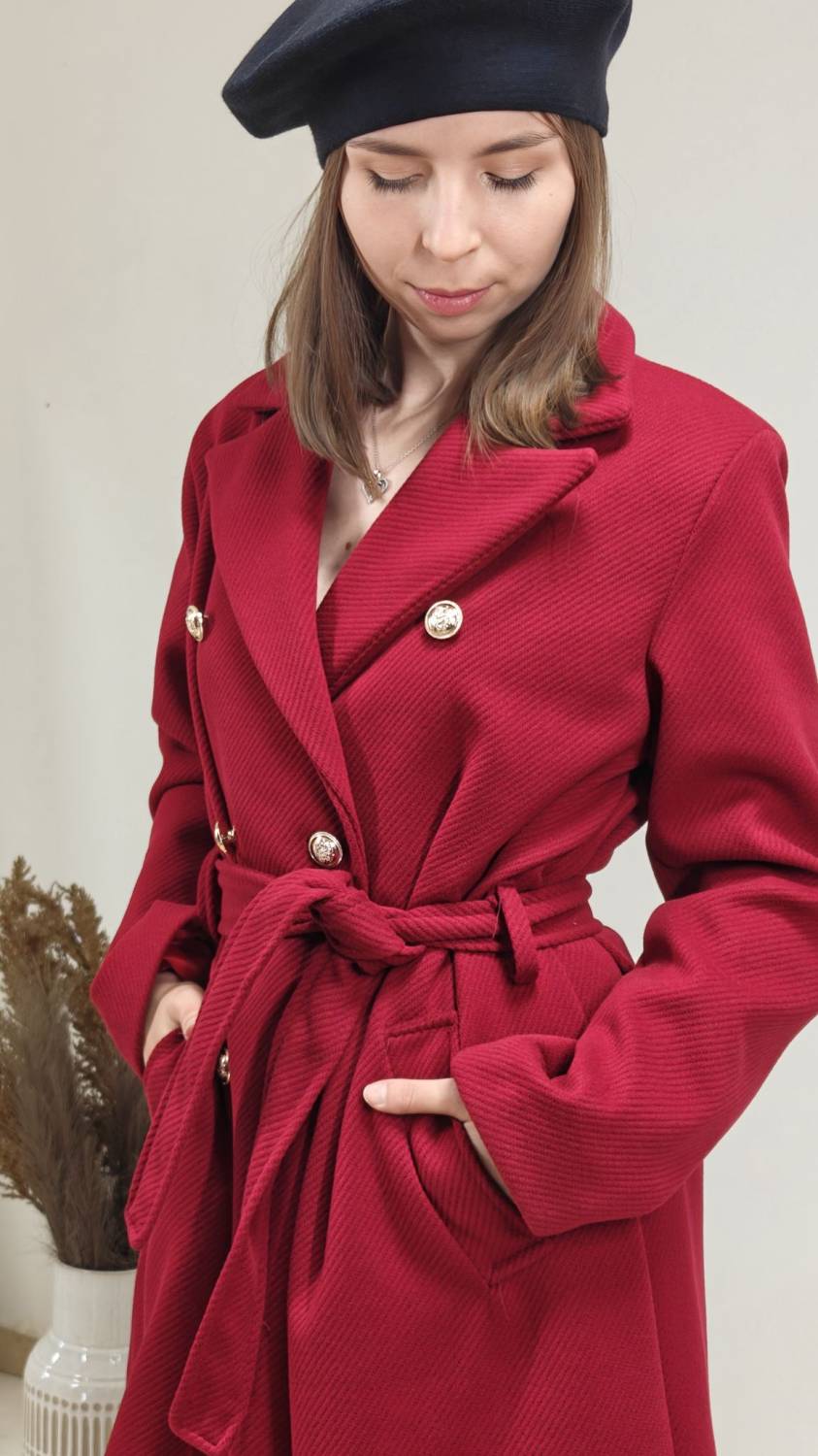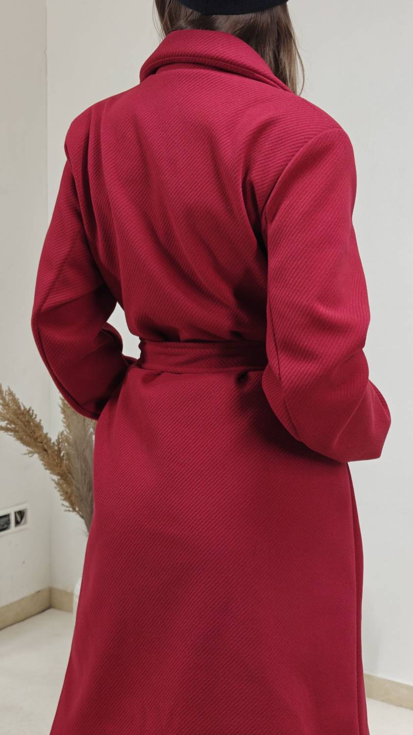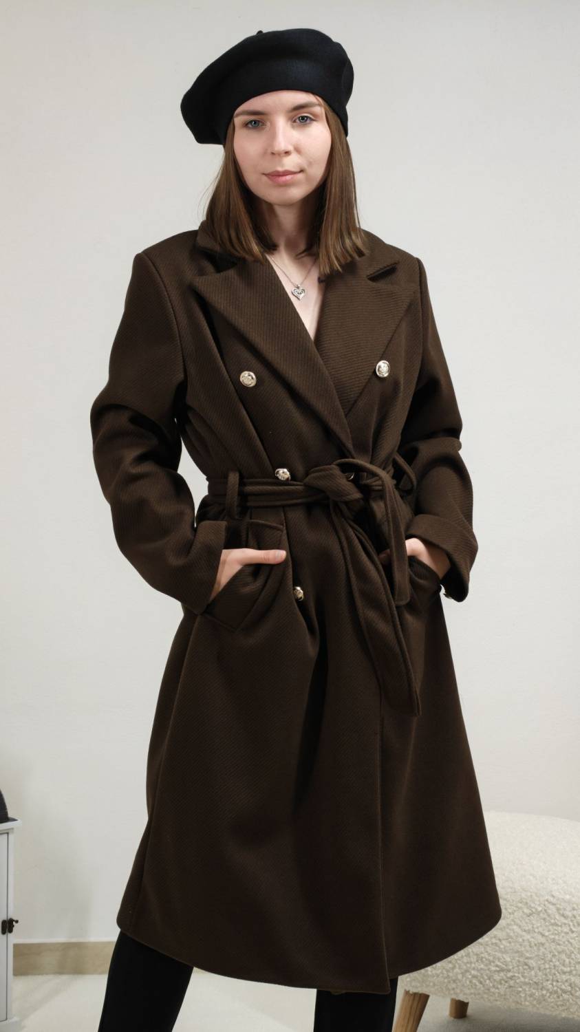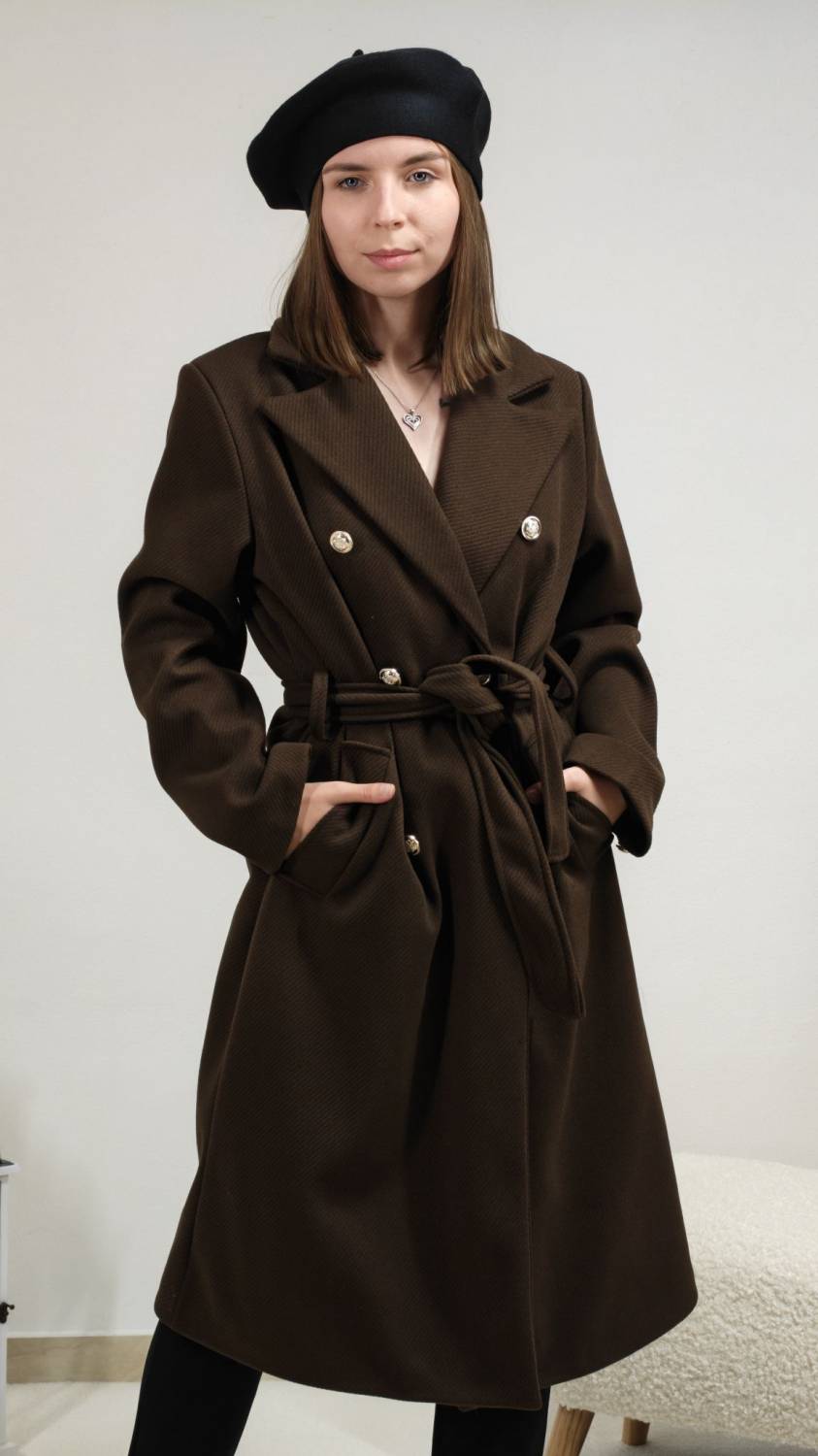 Dlhý podšitý kabát s opaskom, zapínanie na gombíky v zlatej farbe. kabát má aj vrecká.