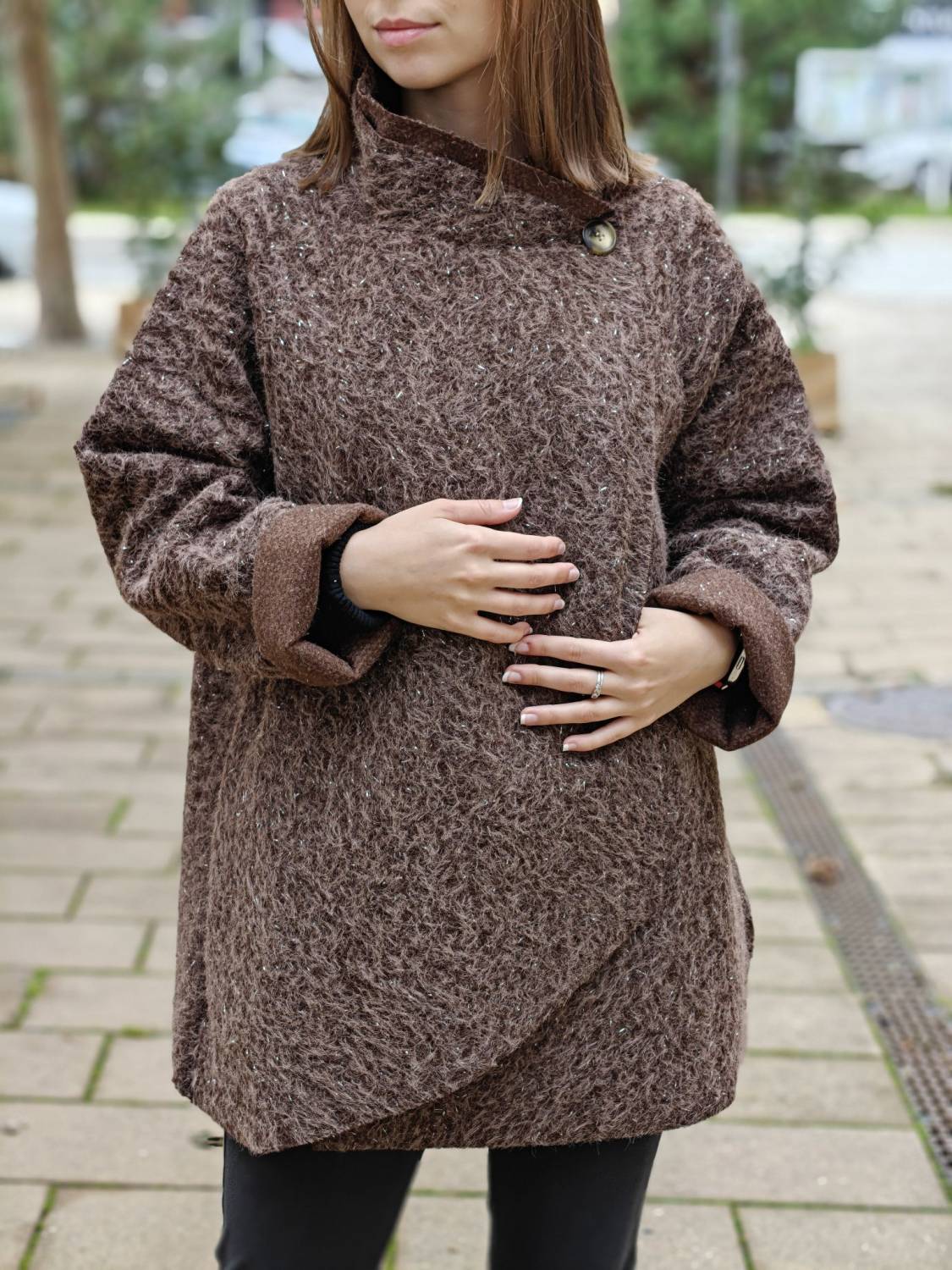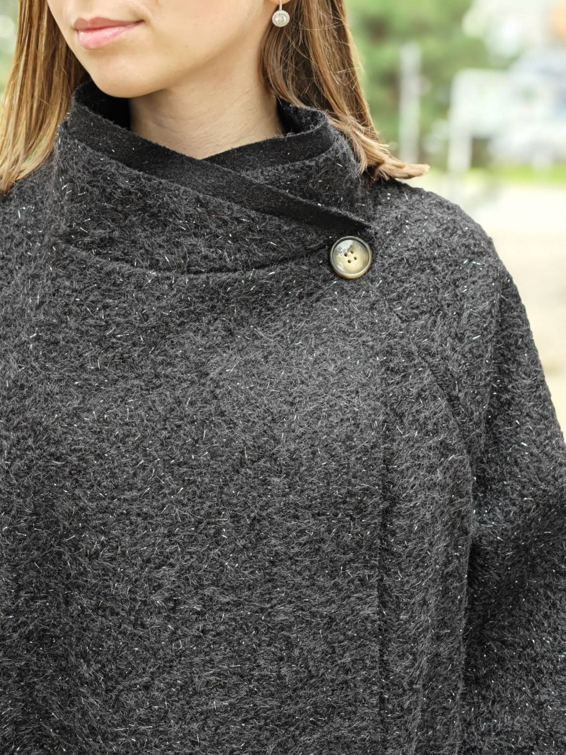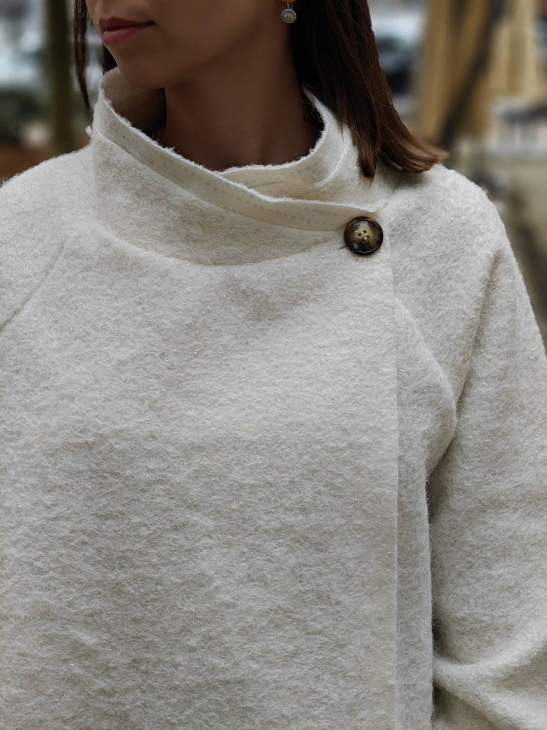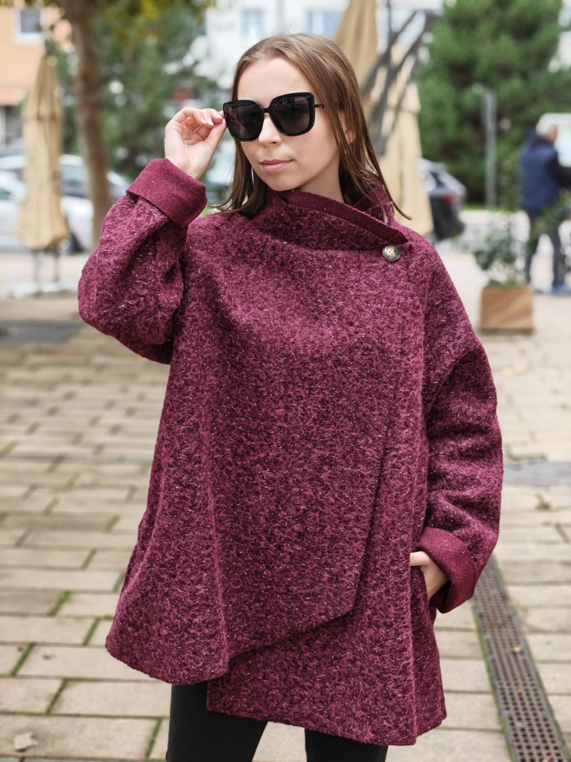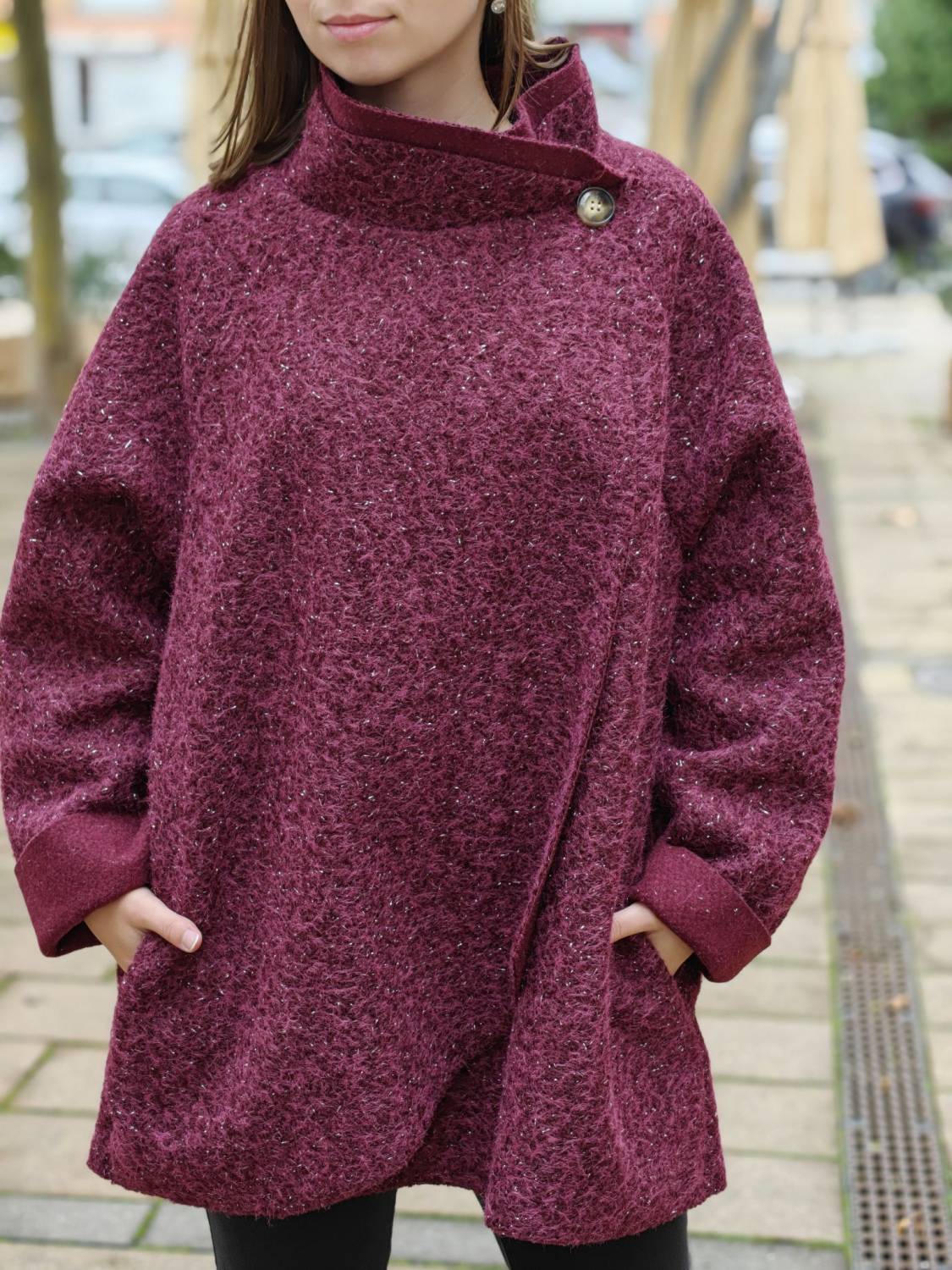 Nepodšitý bukletový kabát s lurexovou nitkou asymetrického strihu. Kabátik sa zapína na jeden gombík .