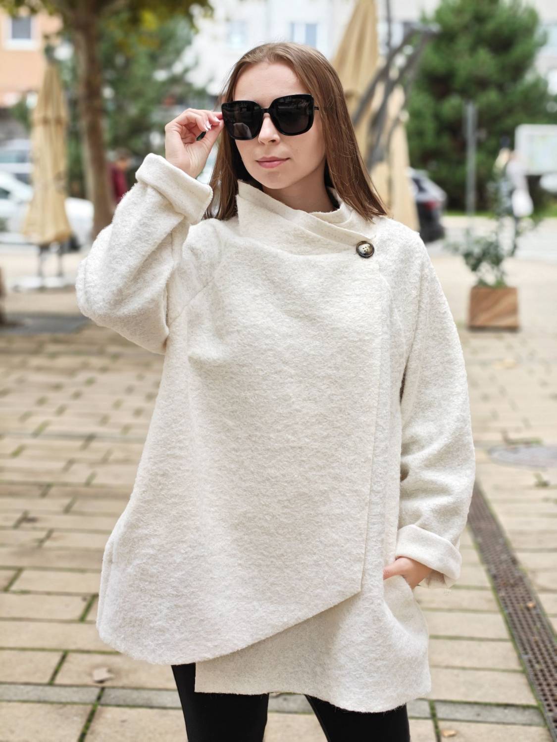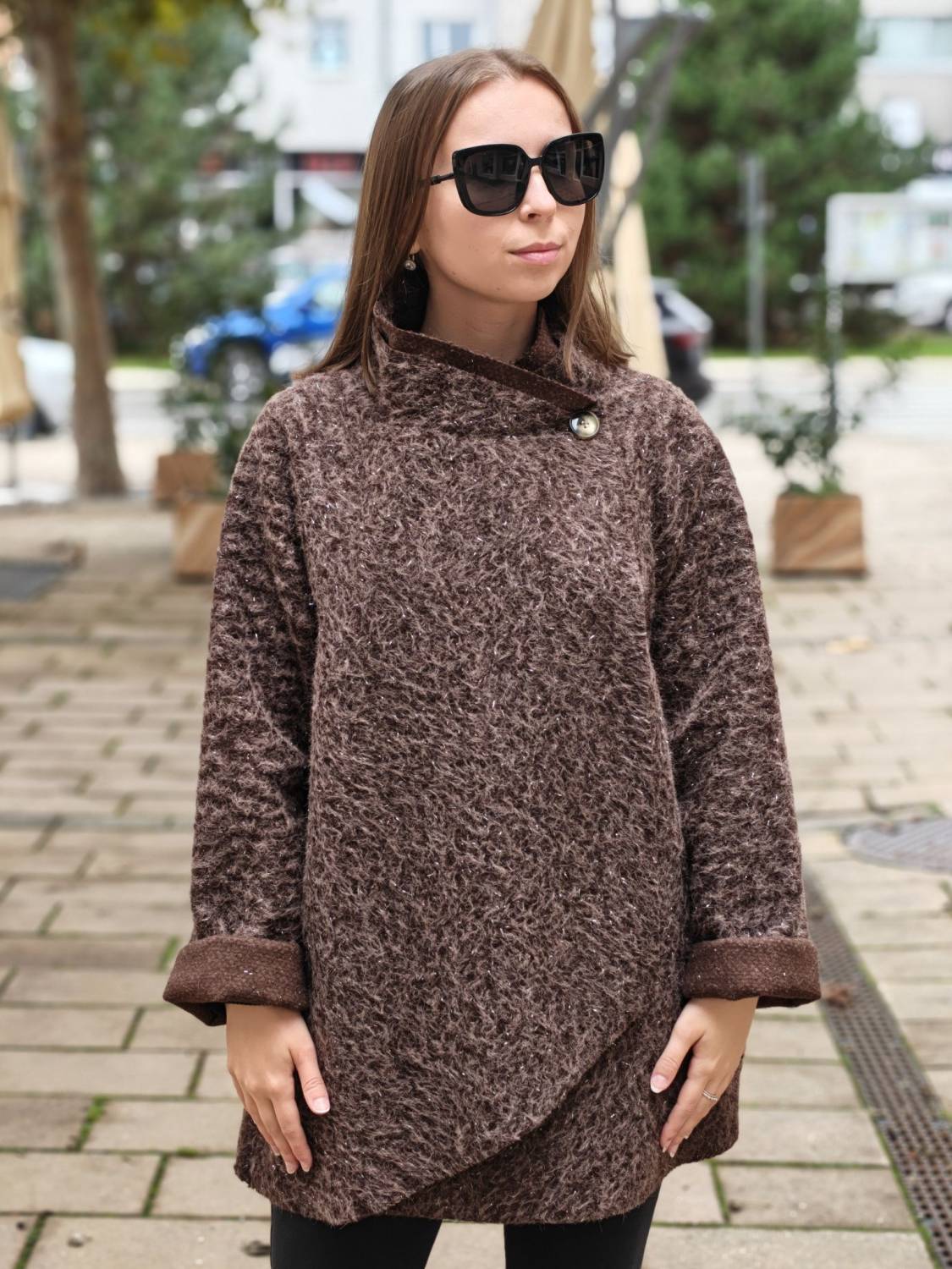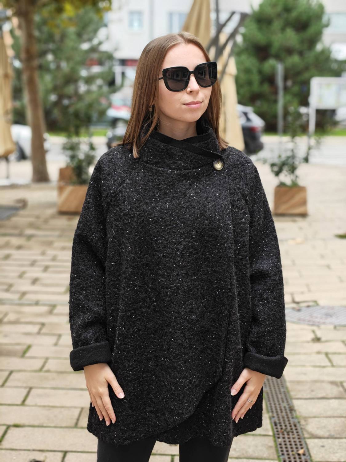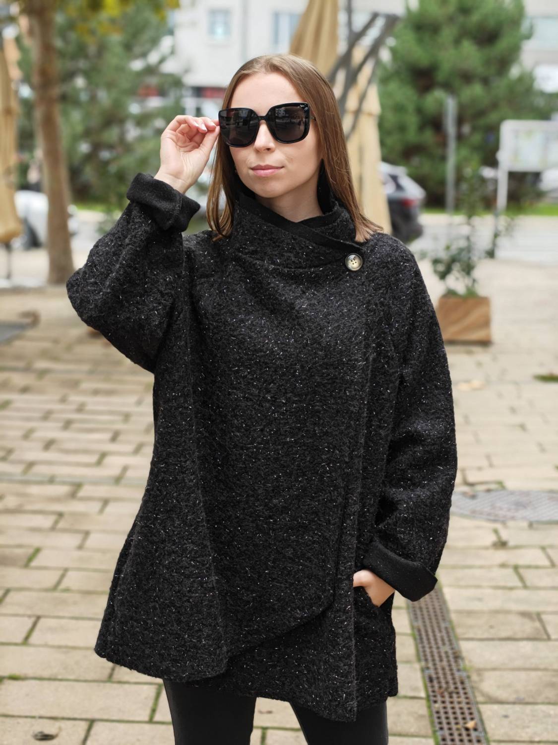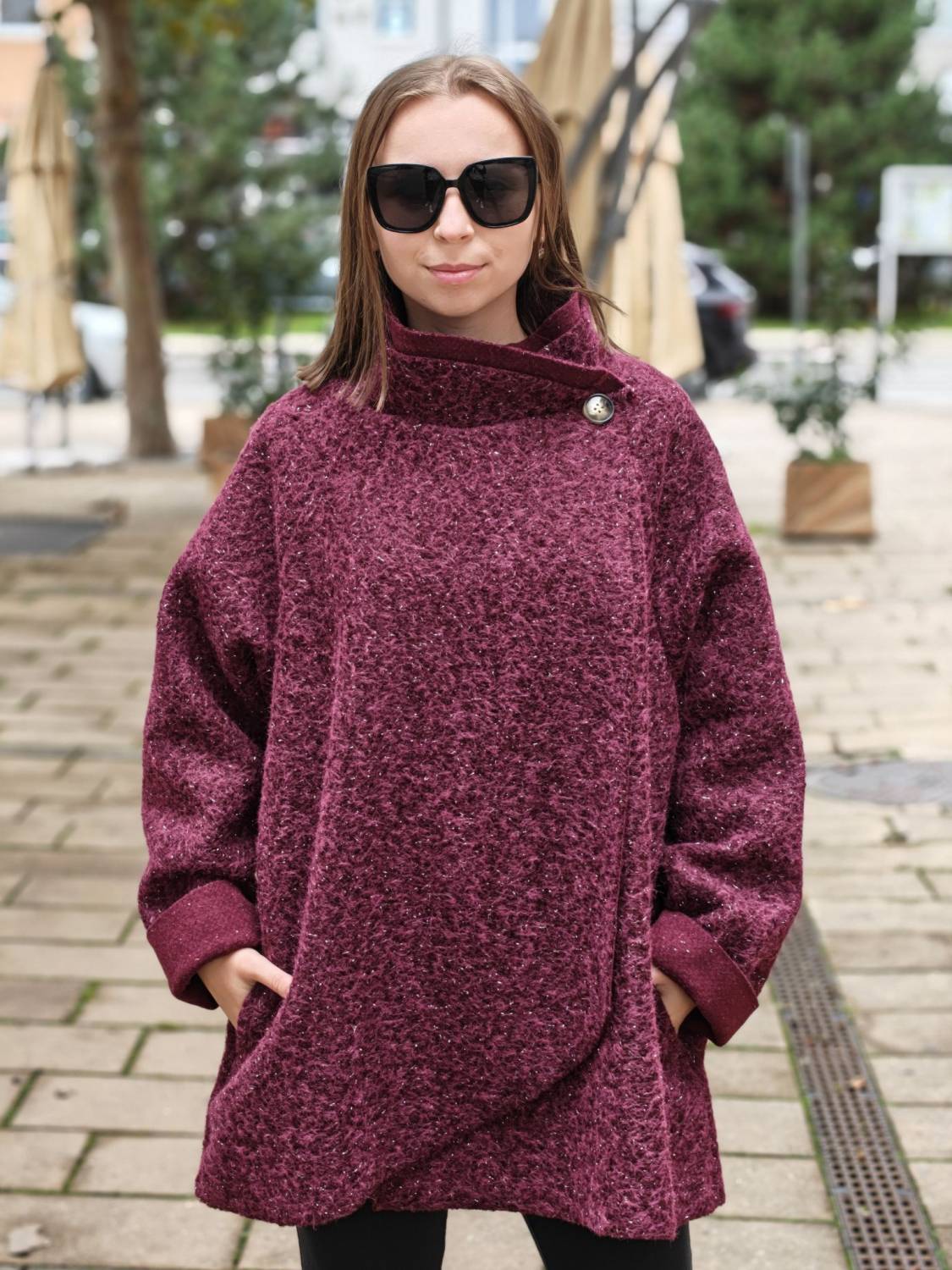 Nepodšitý bukletový kabát s lurexovou nitkou asymetrického strihu. Kabátik sa zapína na jeden gombík .