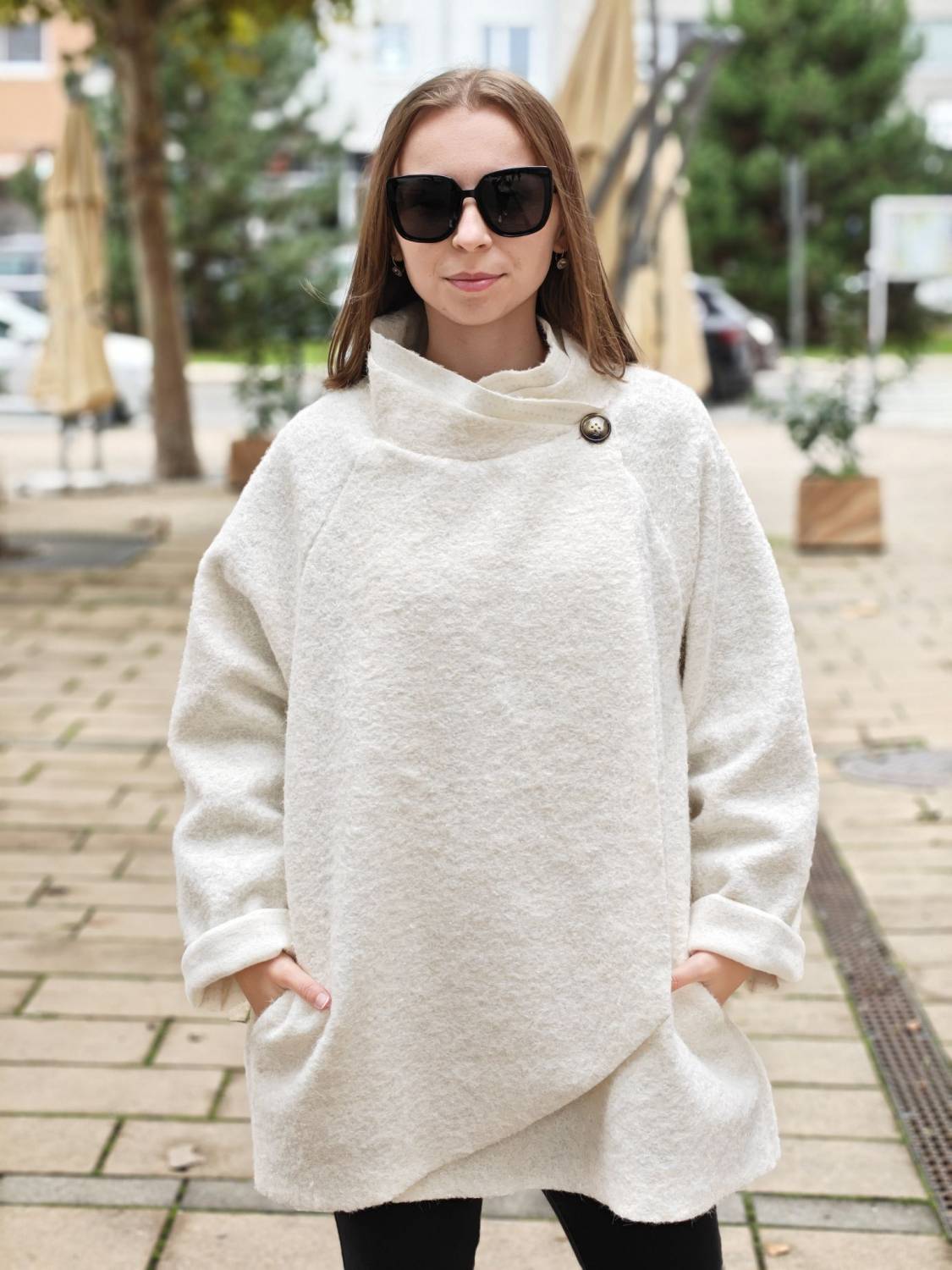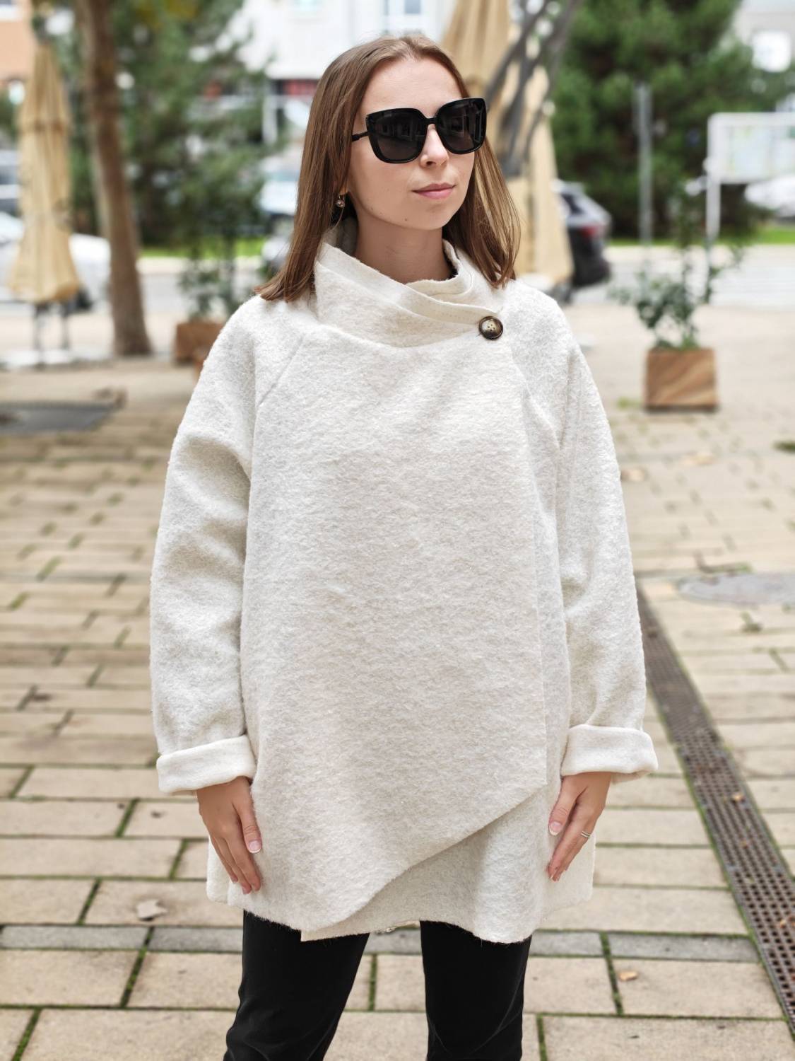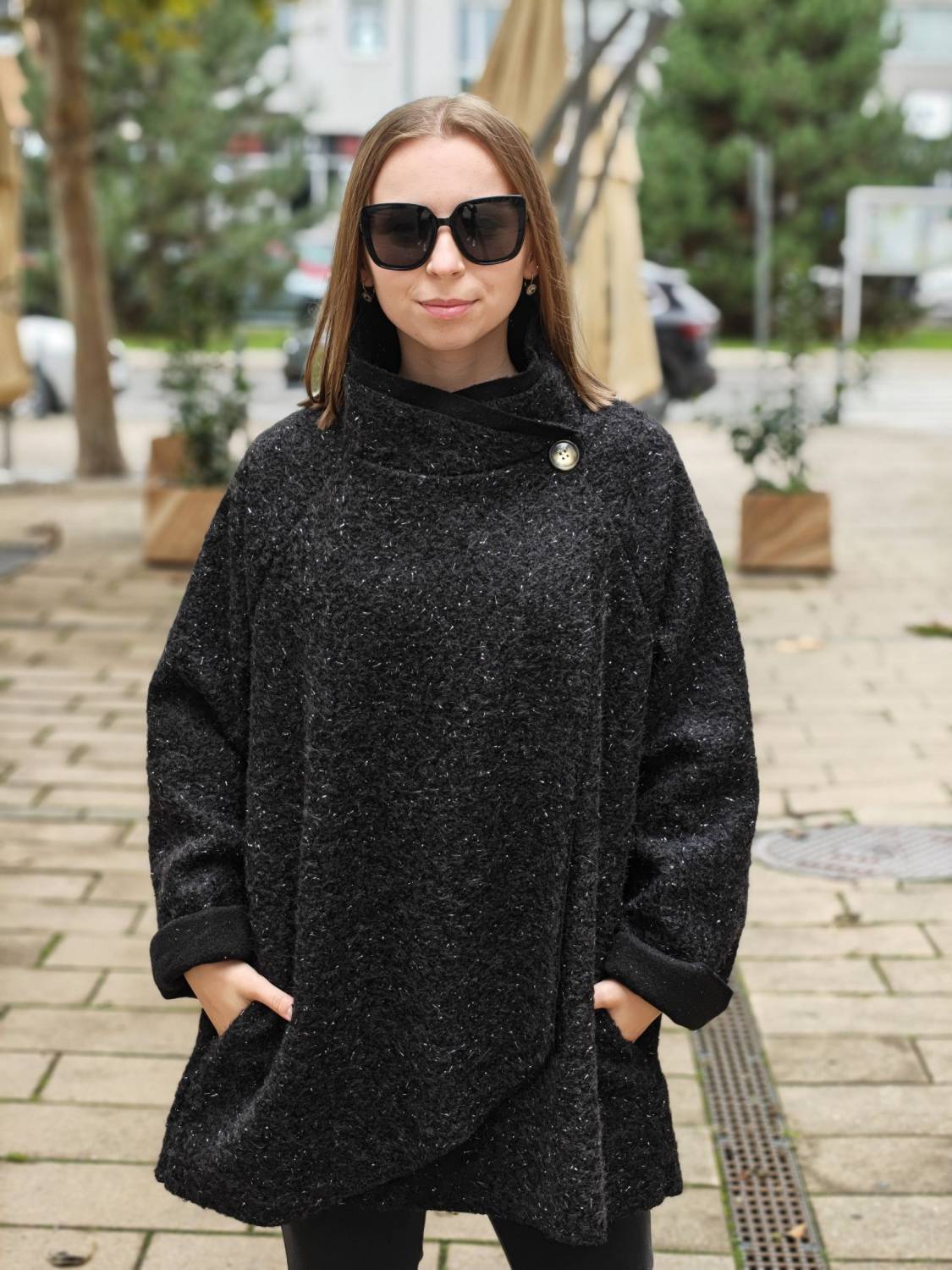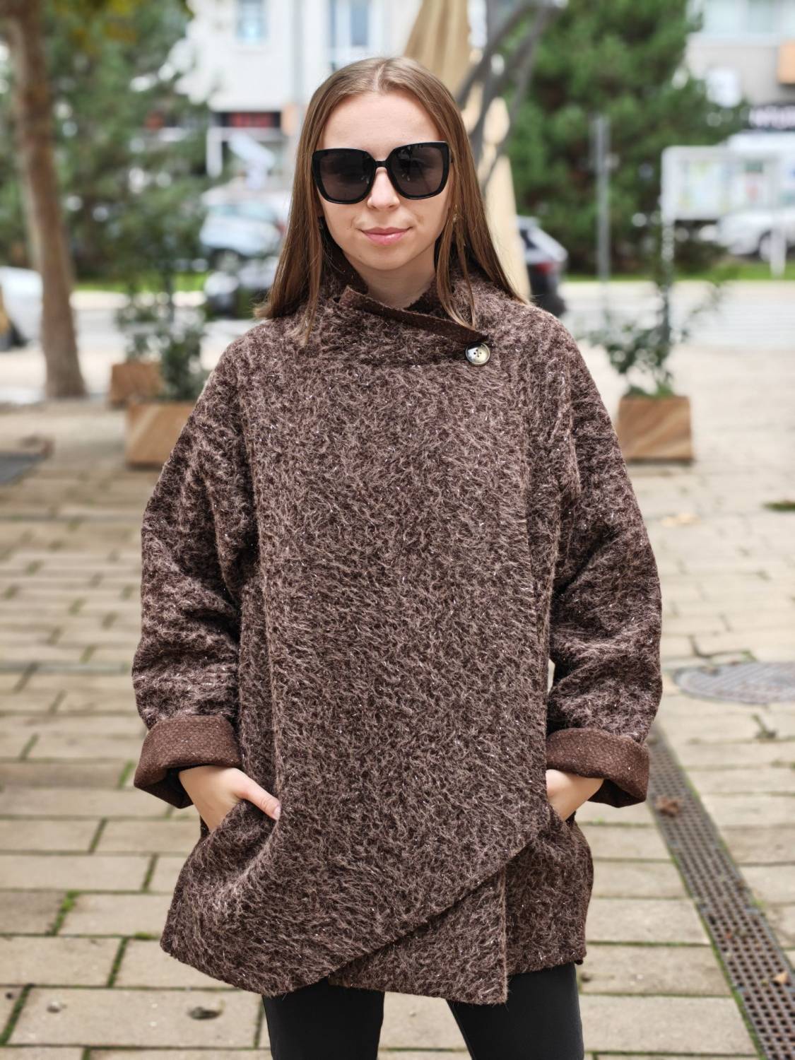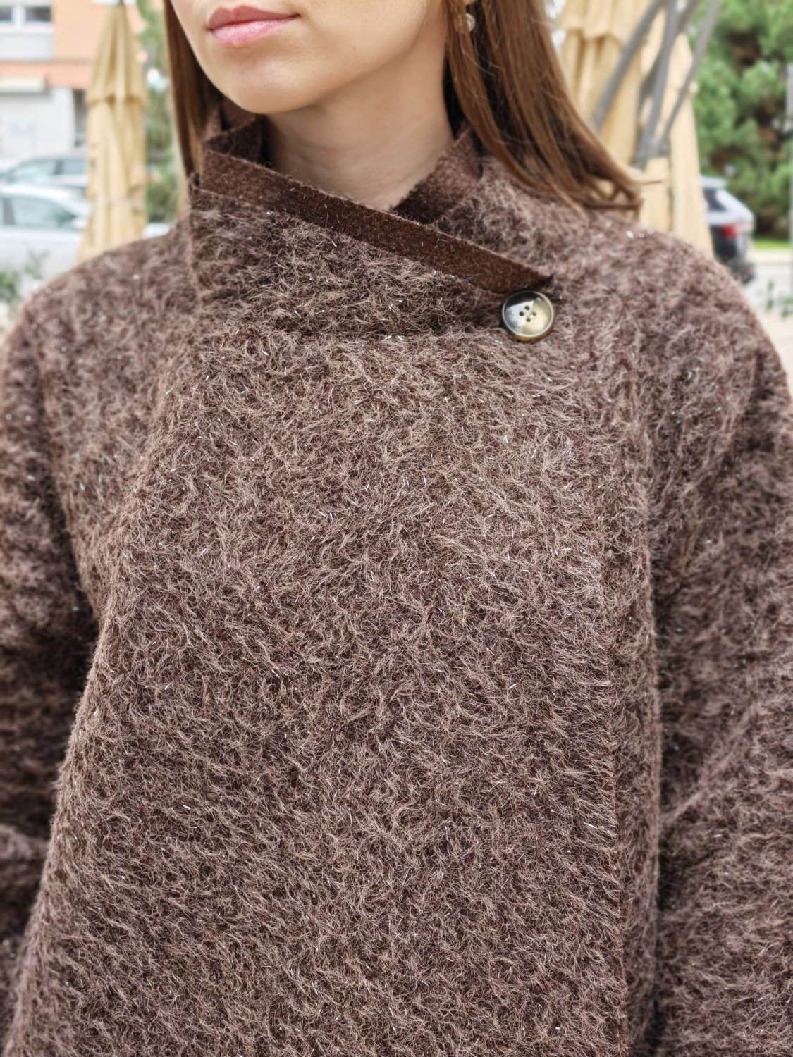 Nepodšitý bukletový kabát s lurexovou nitkou asymetrického strihu. Kabátik sa zapína na jeden gombík .