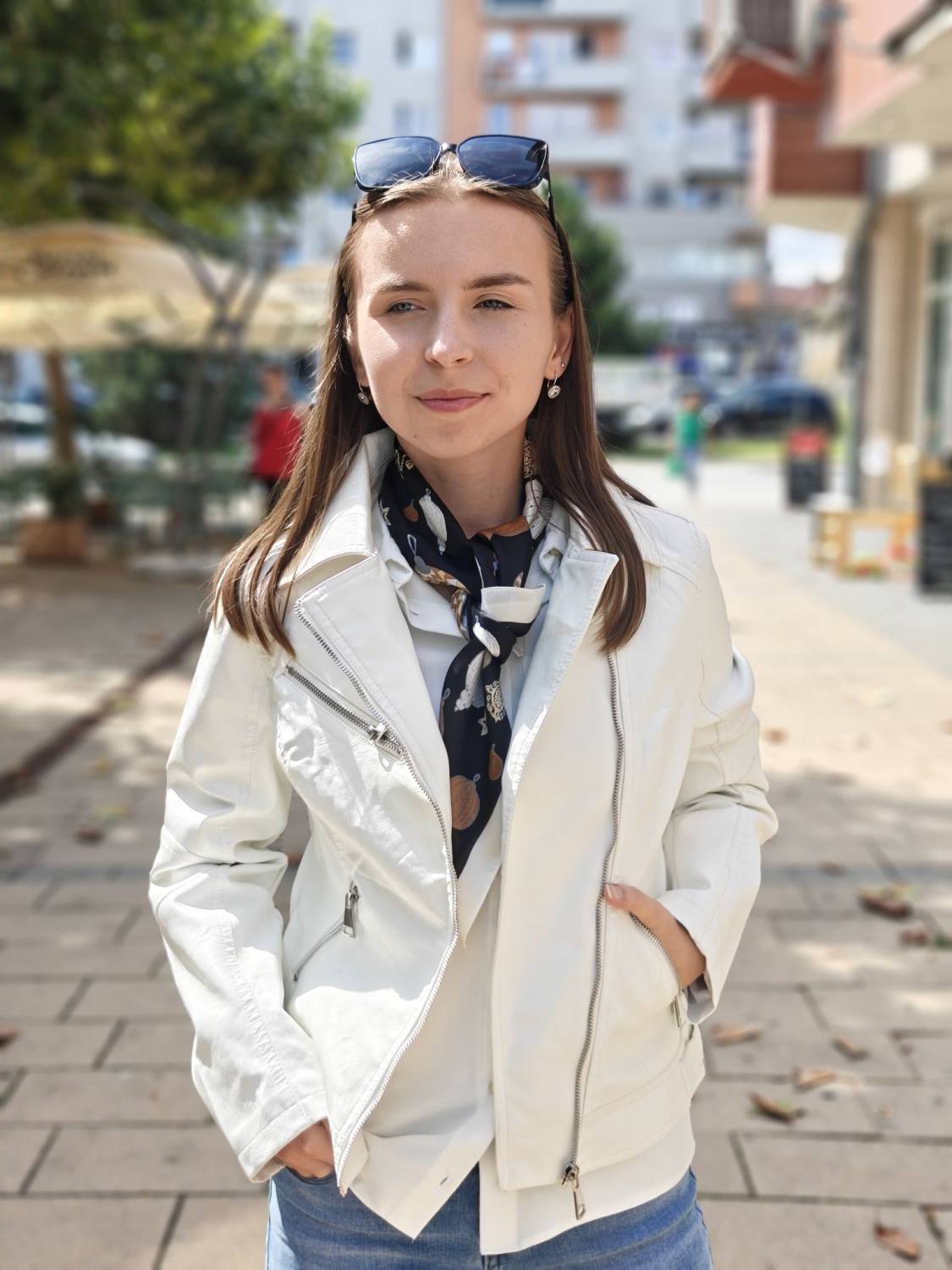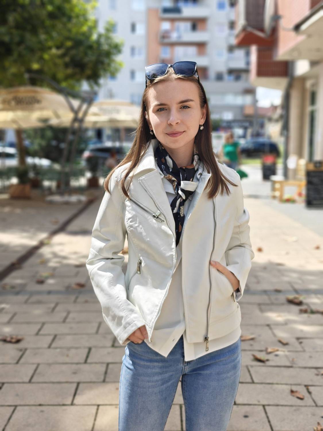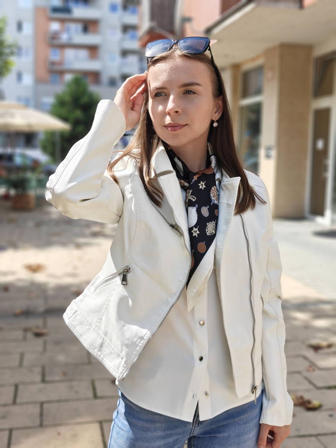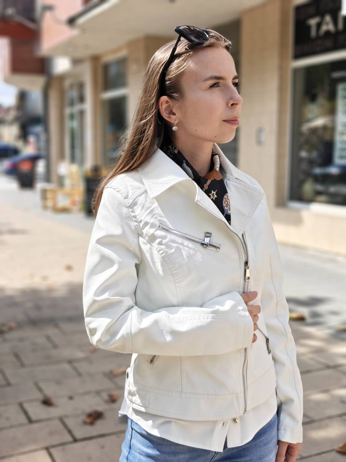 Kratšia koženková bunda, zips je strihaný do šikma.
