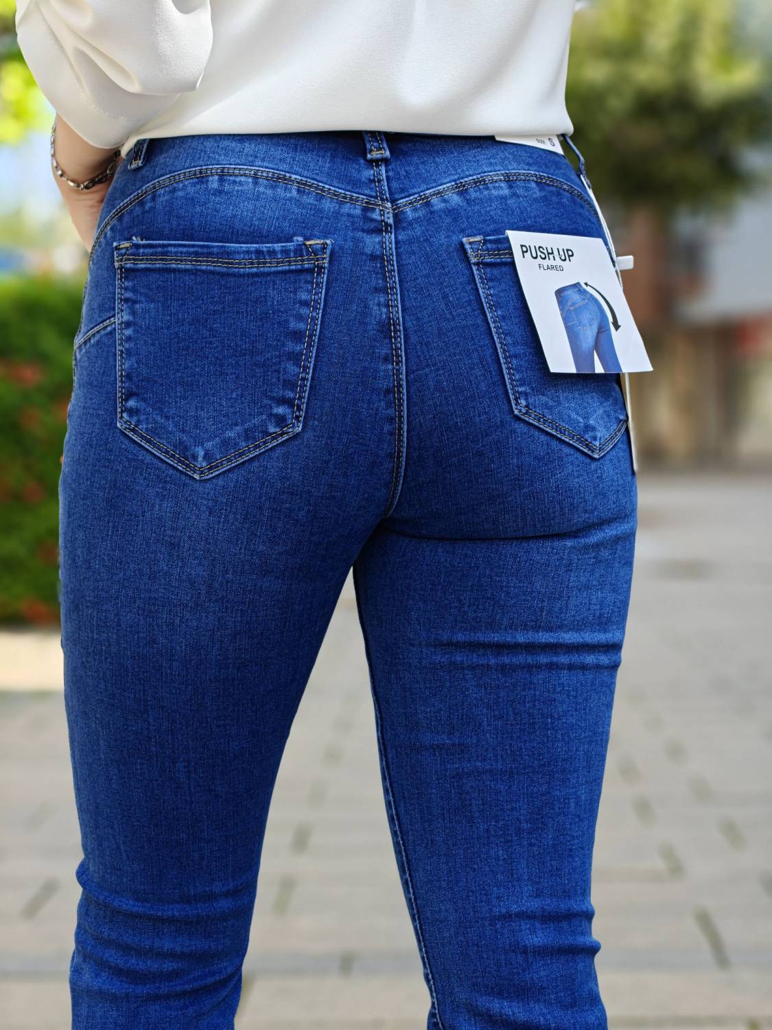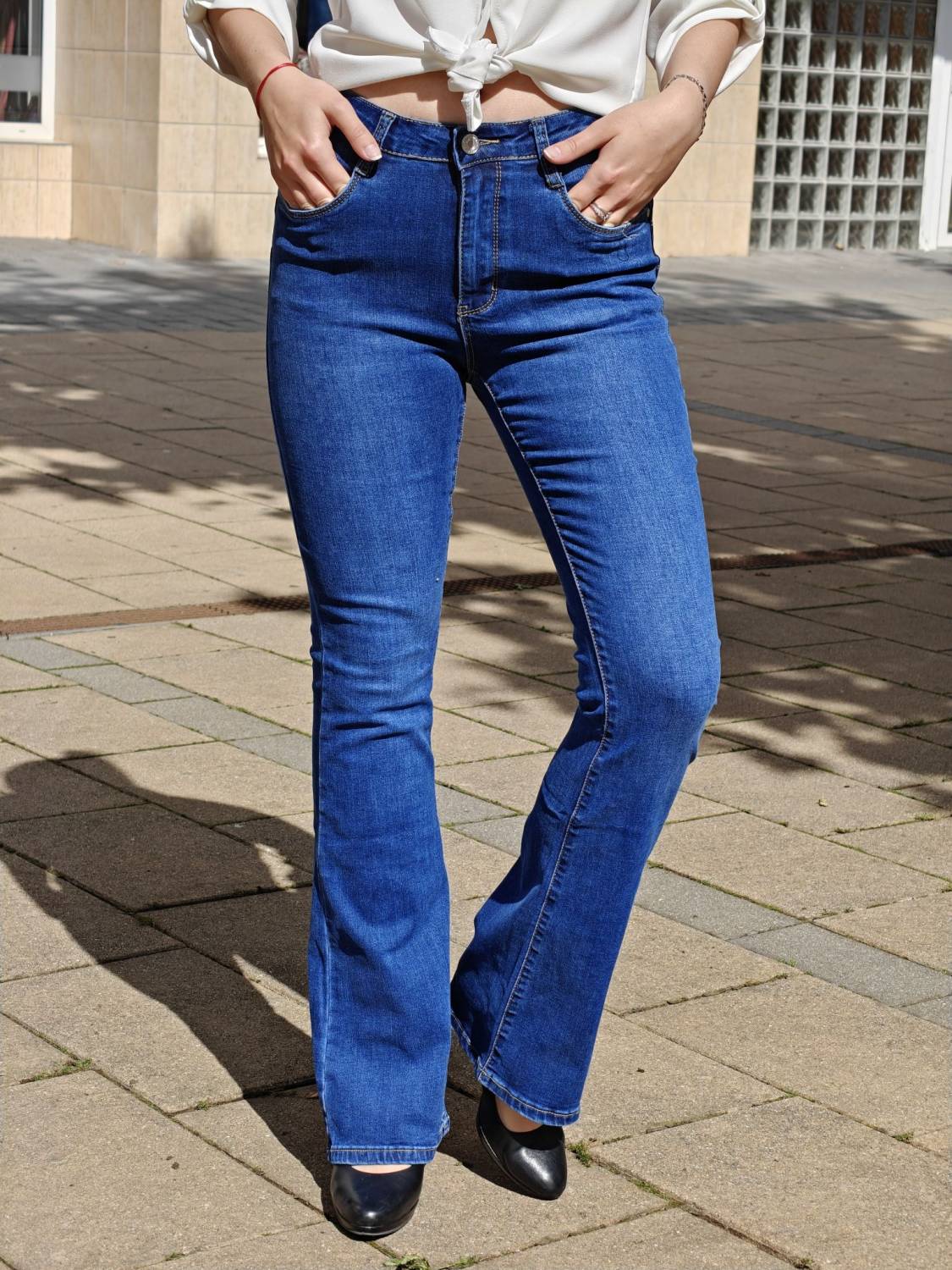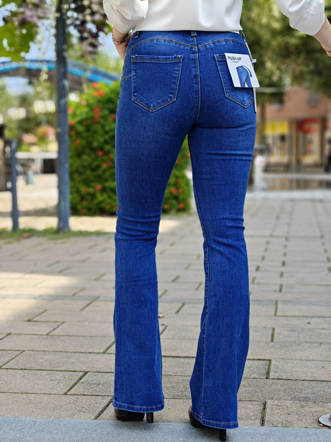 Zvonové džínsy s vyšším sedom.