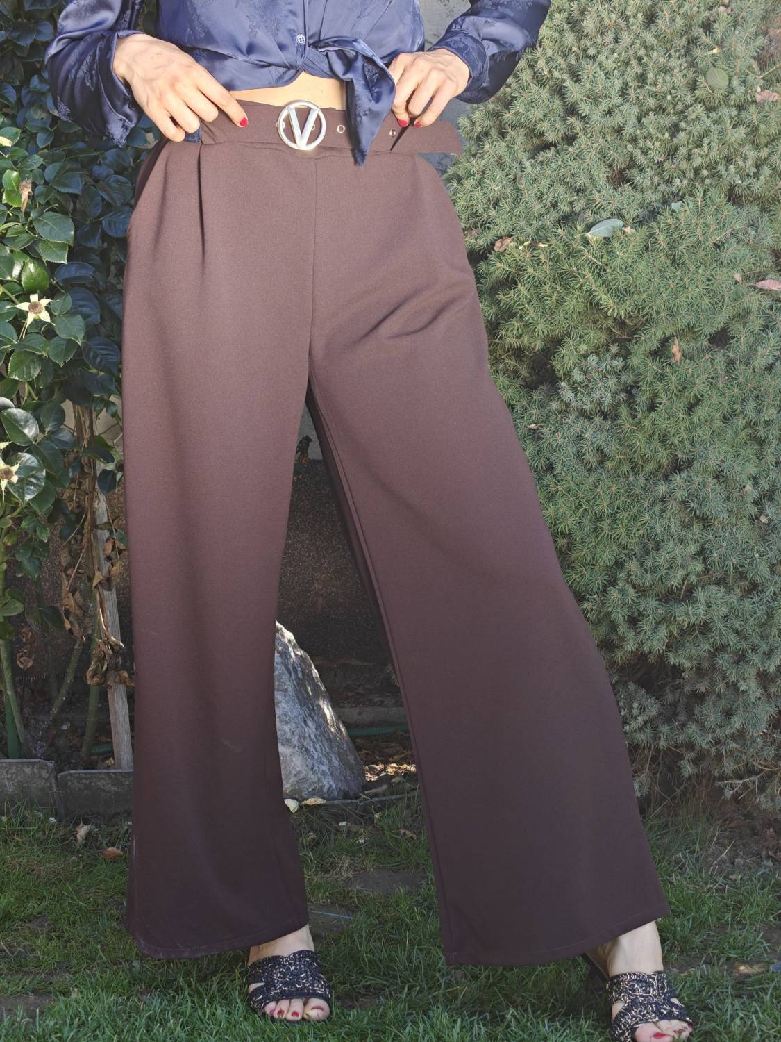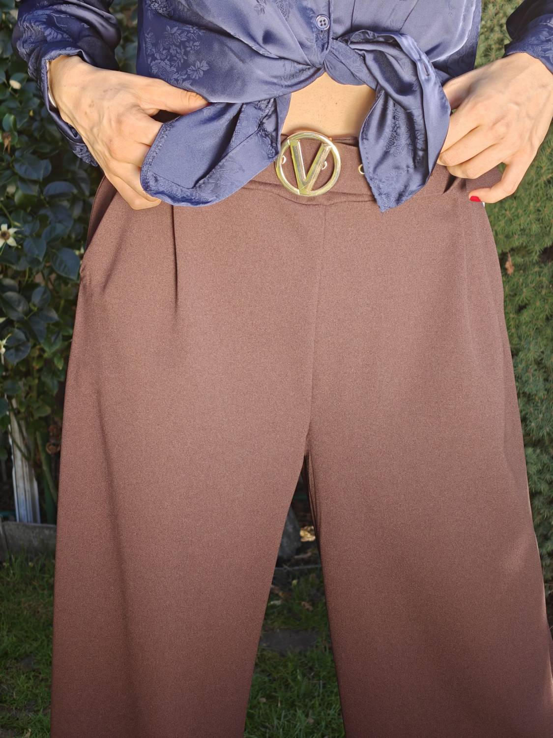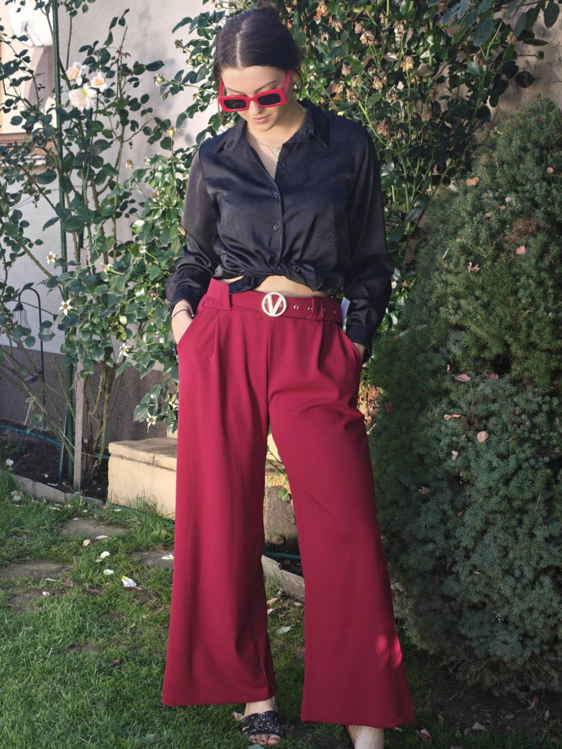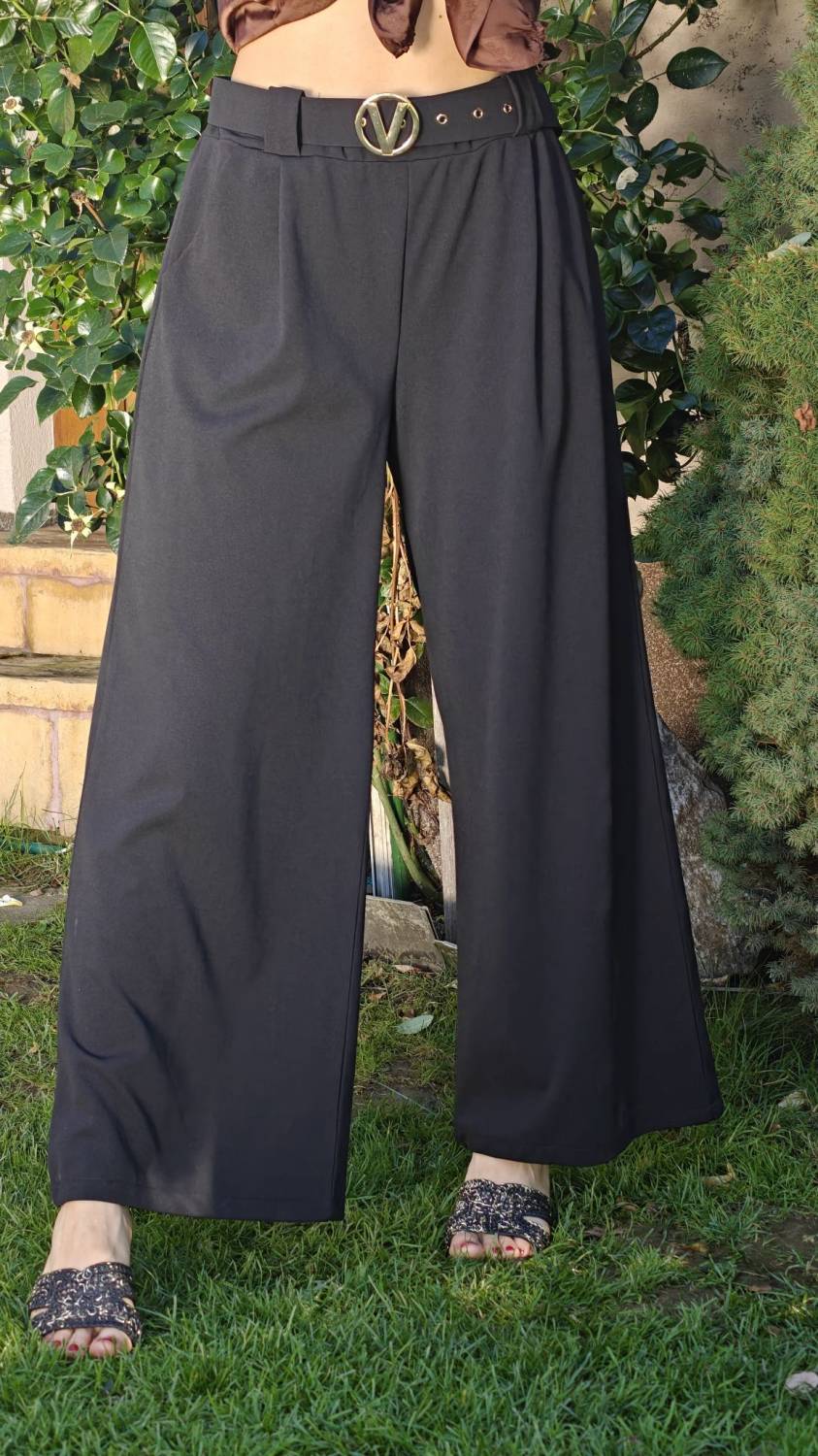 Široké nohavice s opaskom a ozdobnou sponou v zlatej farbe.