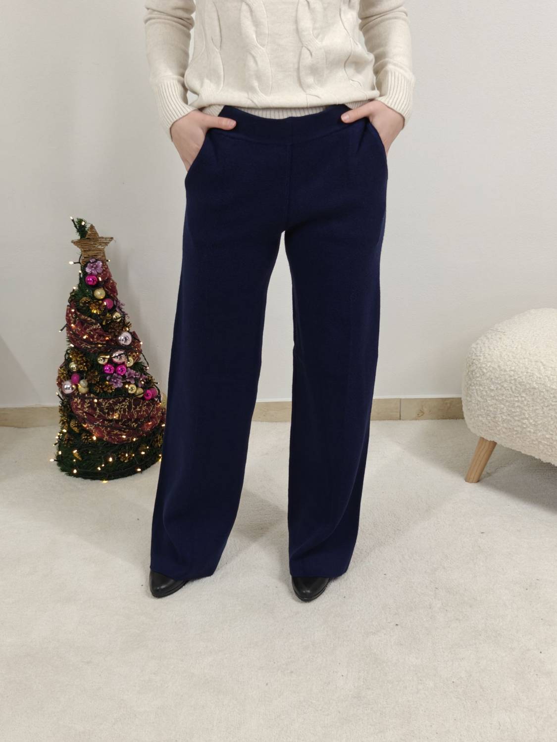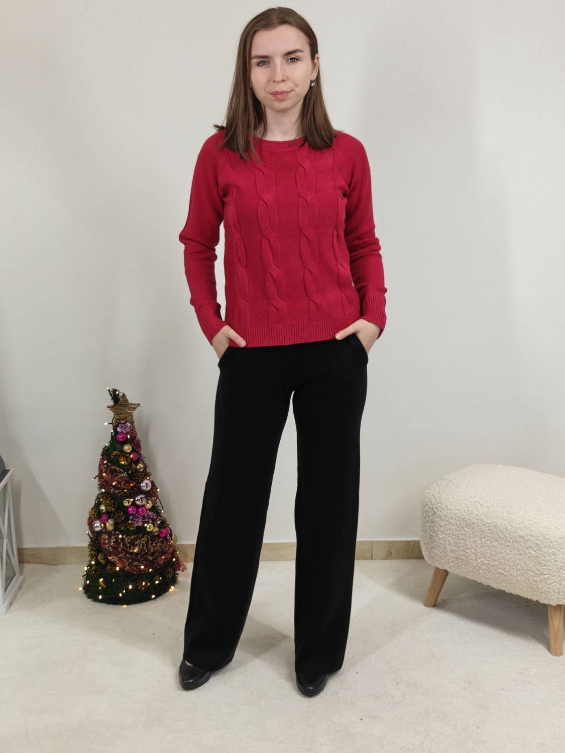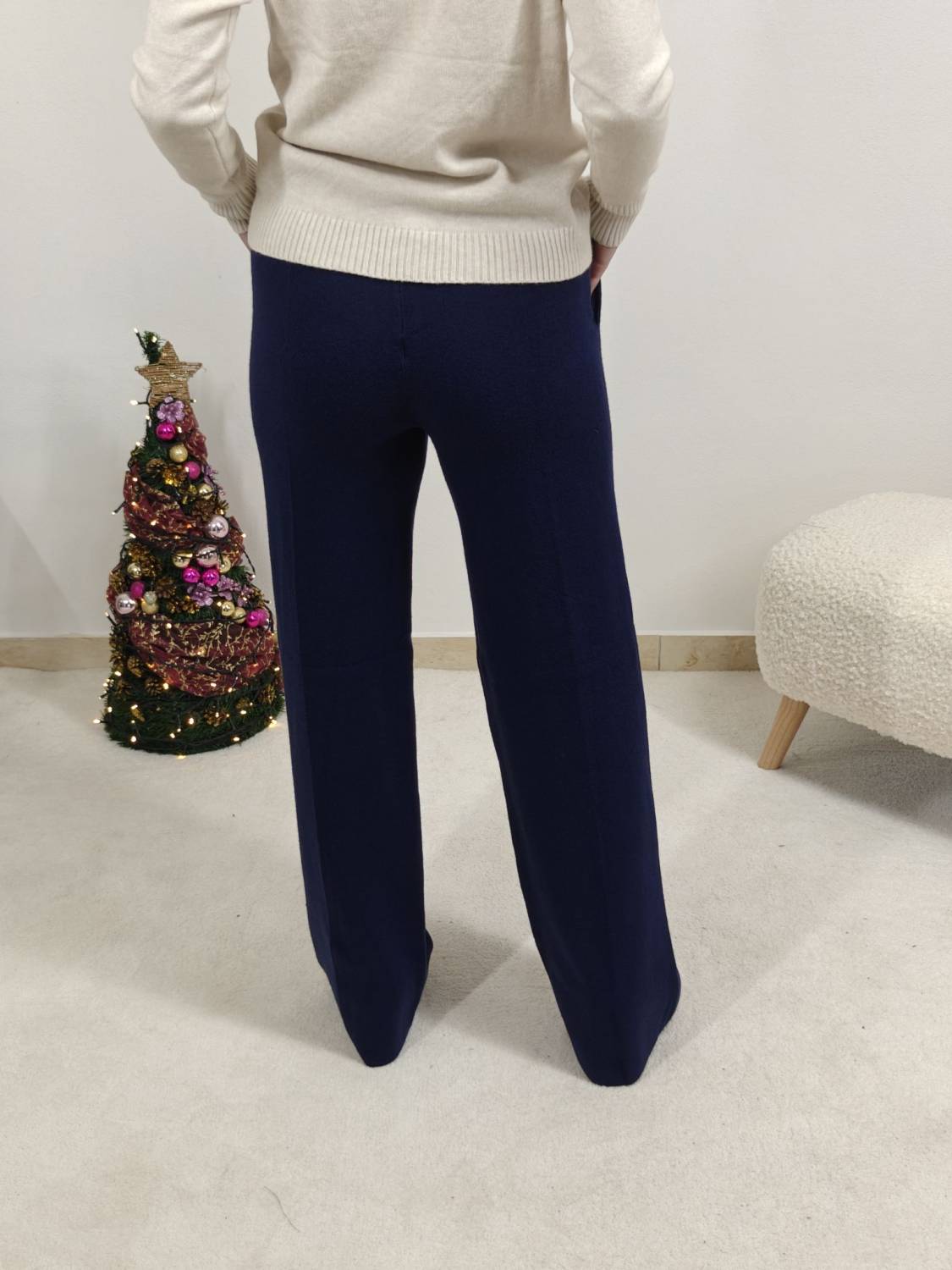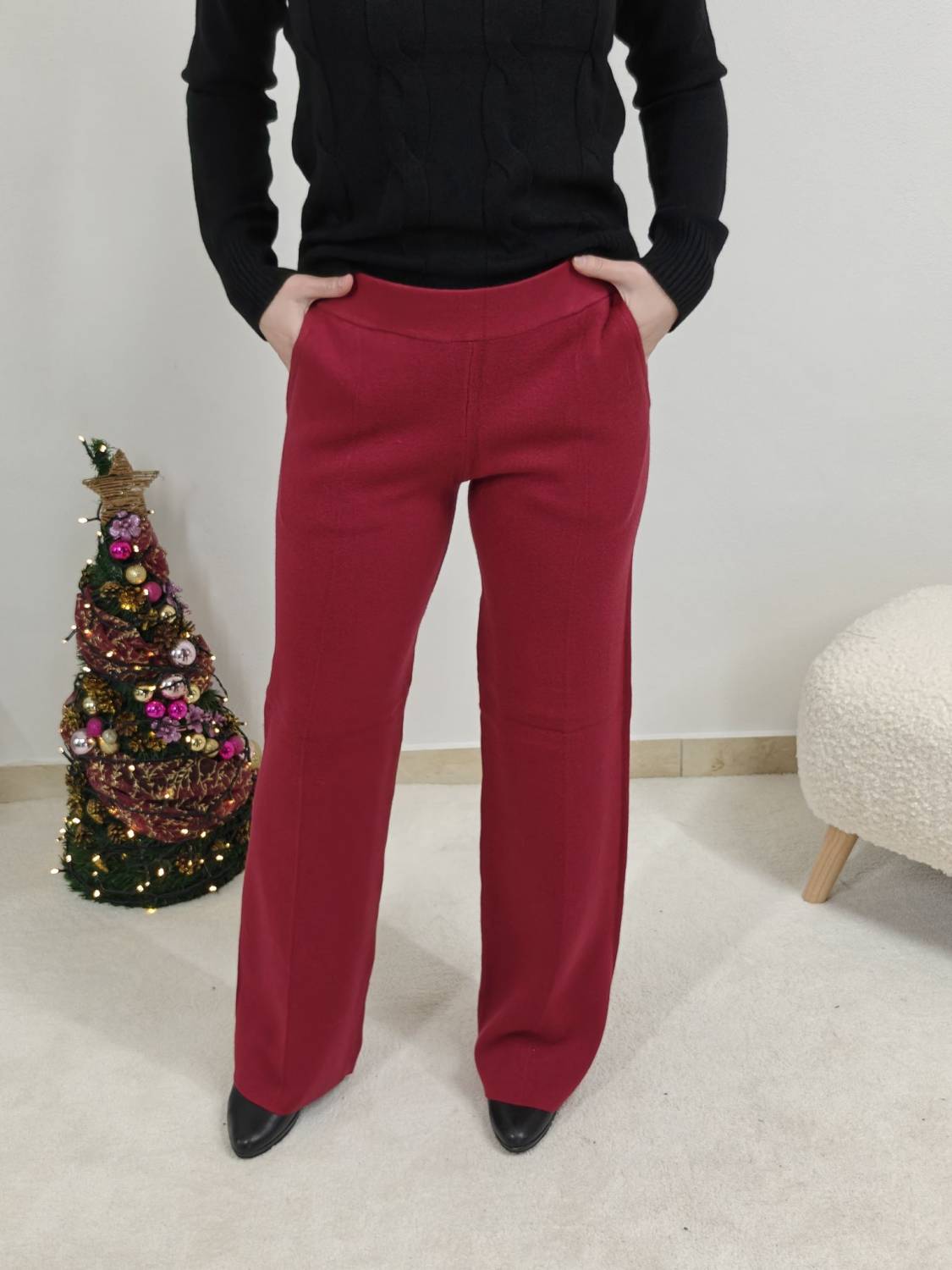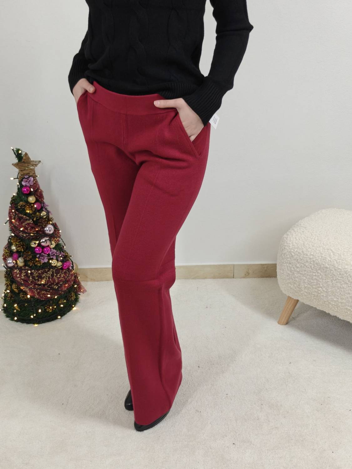 Úpletové nohavice rovného strihu, majú vrecká a v páse sú do gumičky. Nohavice majú jemné puky na prednej strane nohavíc.