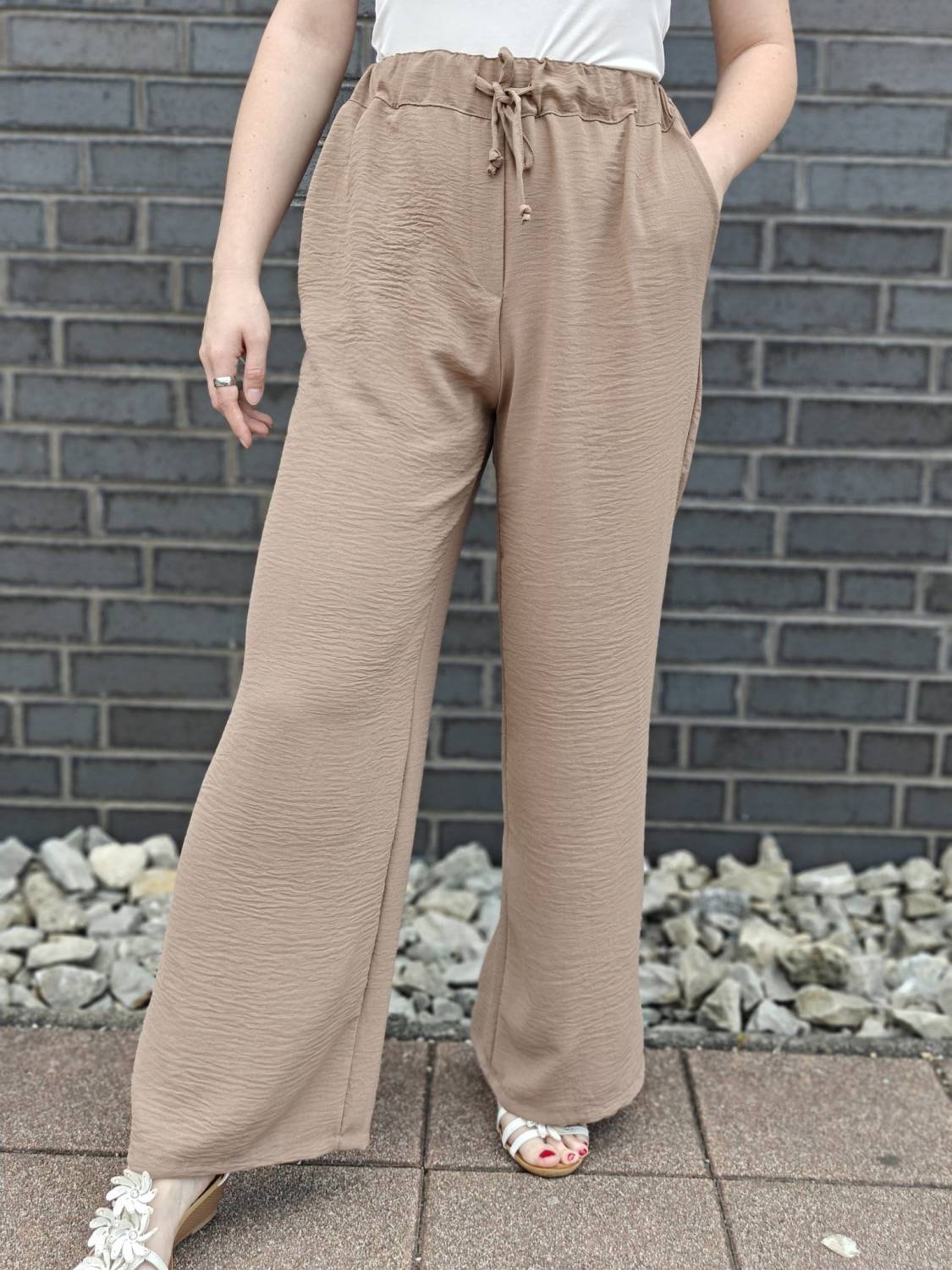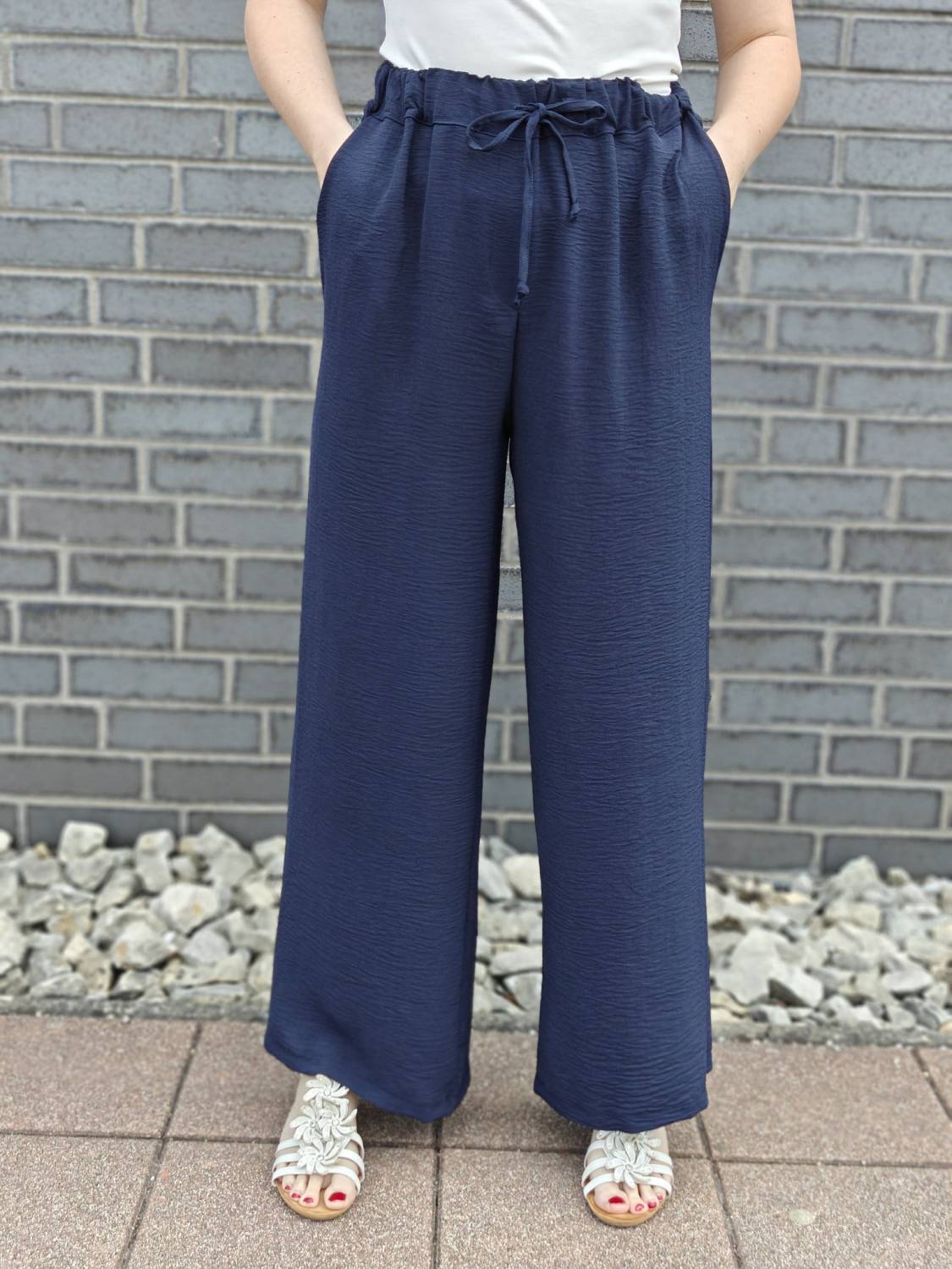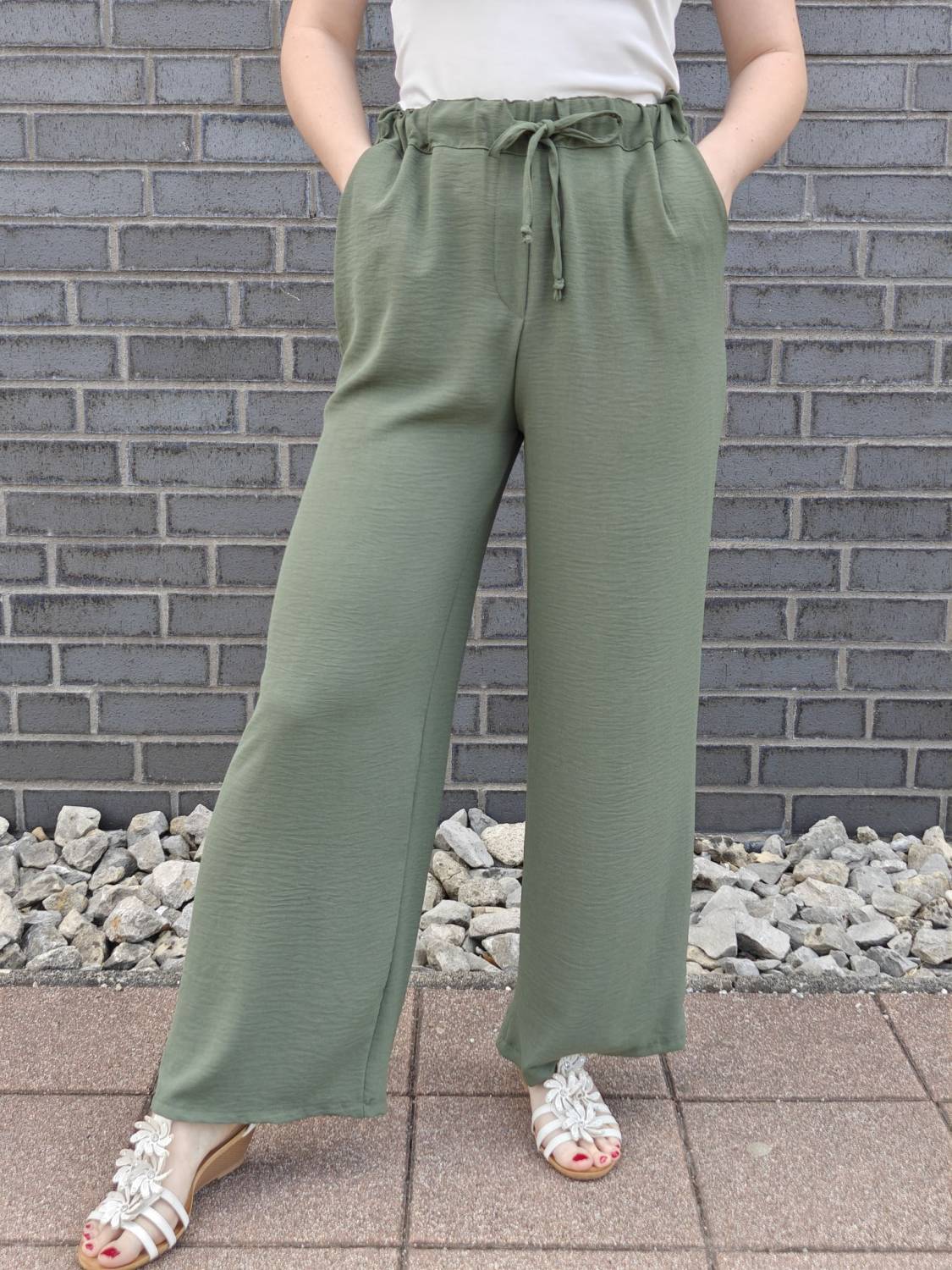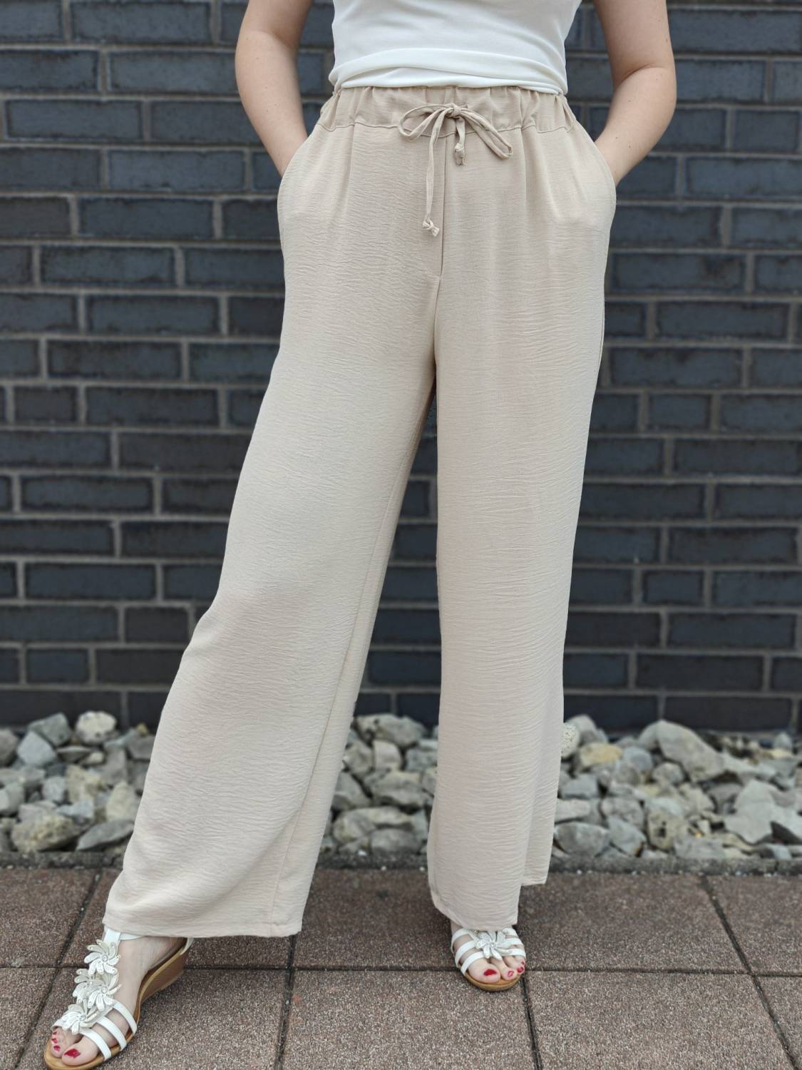 Letné široké nohavice. V páse do gumičky a šnúrkou na stiahnutie, takže sa pekne prispôsobia. Príjemný a pohodlný materiál.