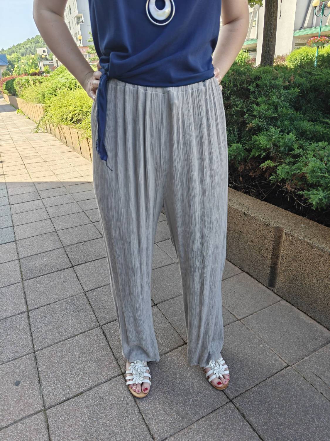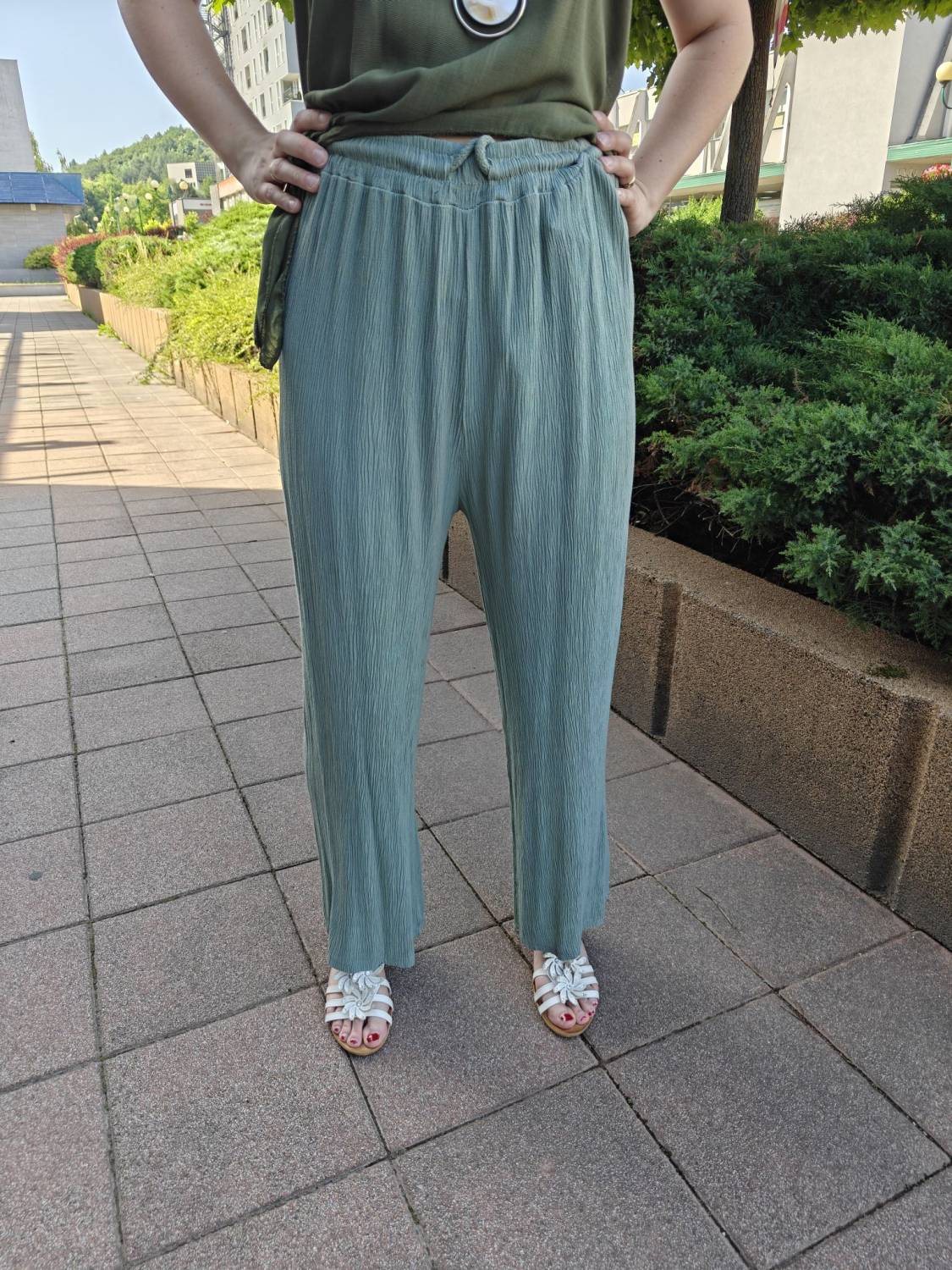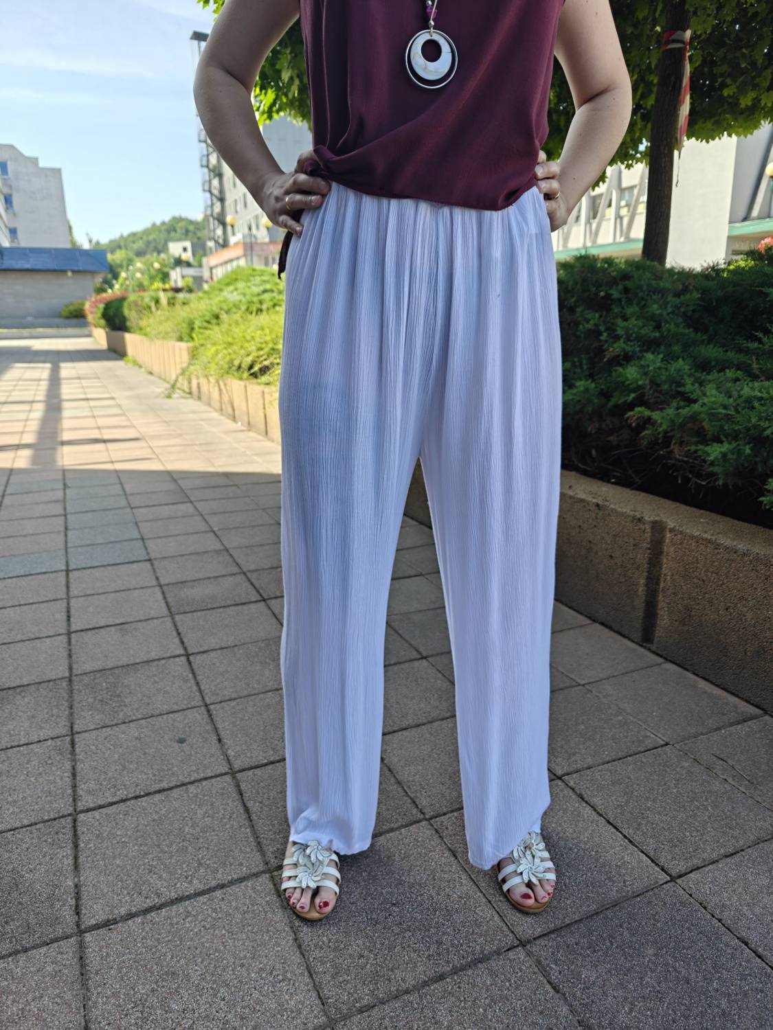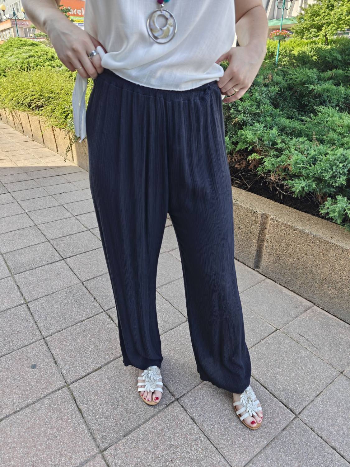 Letné široké nohavice s jemnou štruktúrou a vysokým sedom. V páse do gumičky, takže sa pekne prispôsobia. Príjemný a pohodlný materiál.