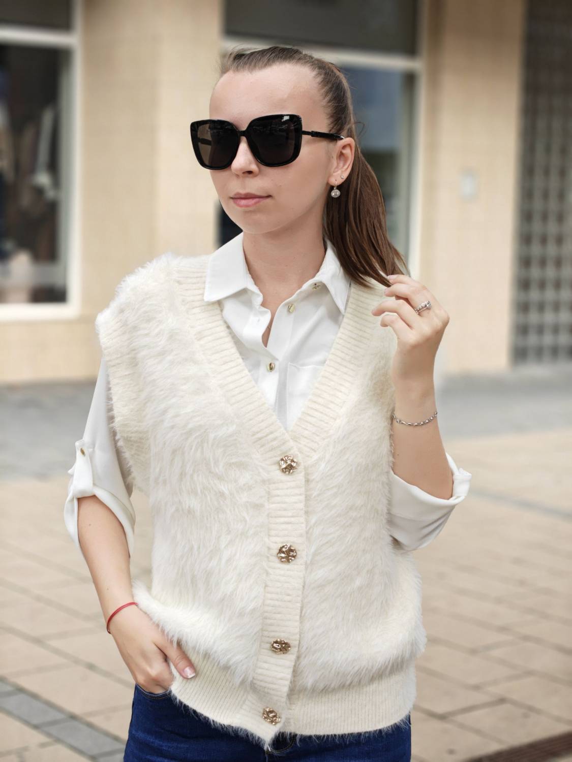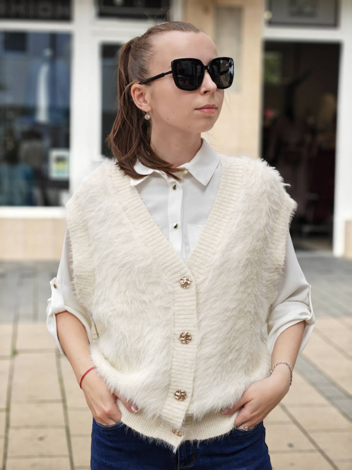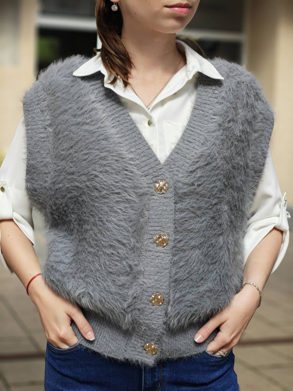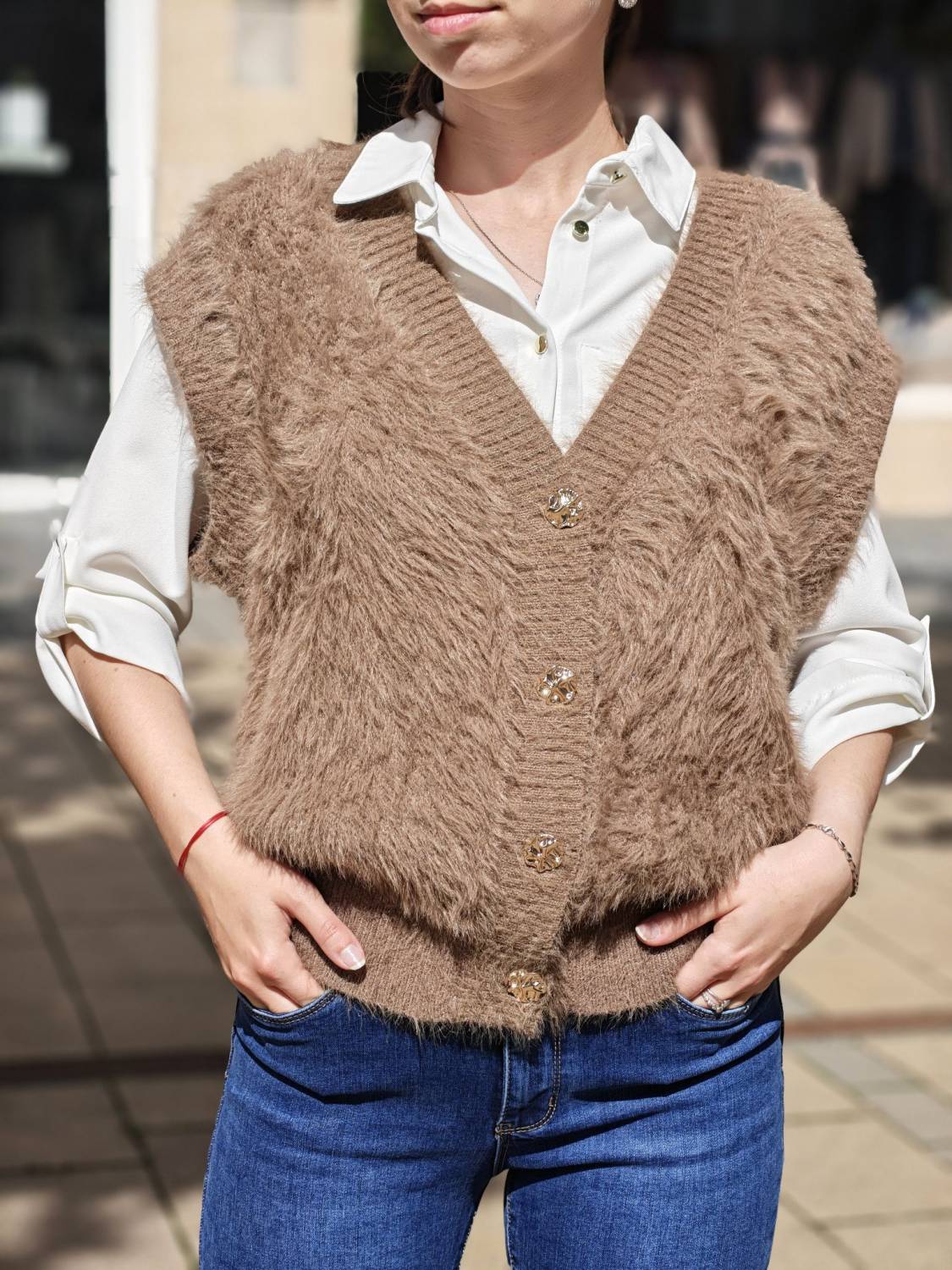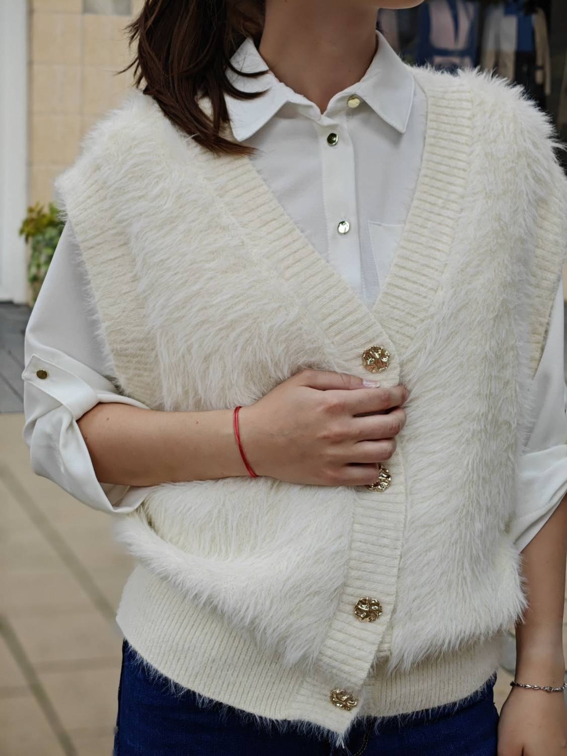 Vesta z veľmi príjemného chlpatého materiálu na gombíky v zlatej farbe.