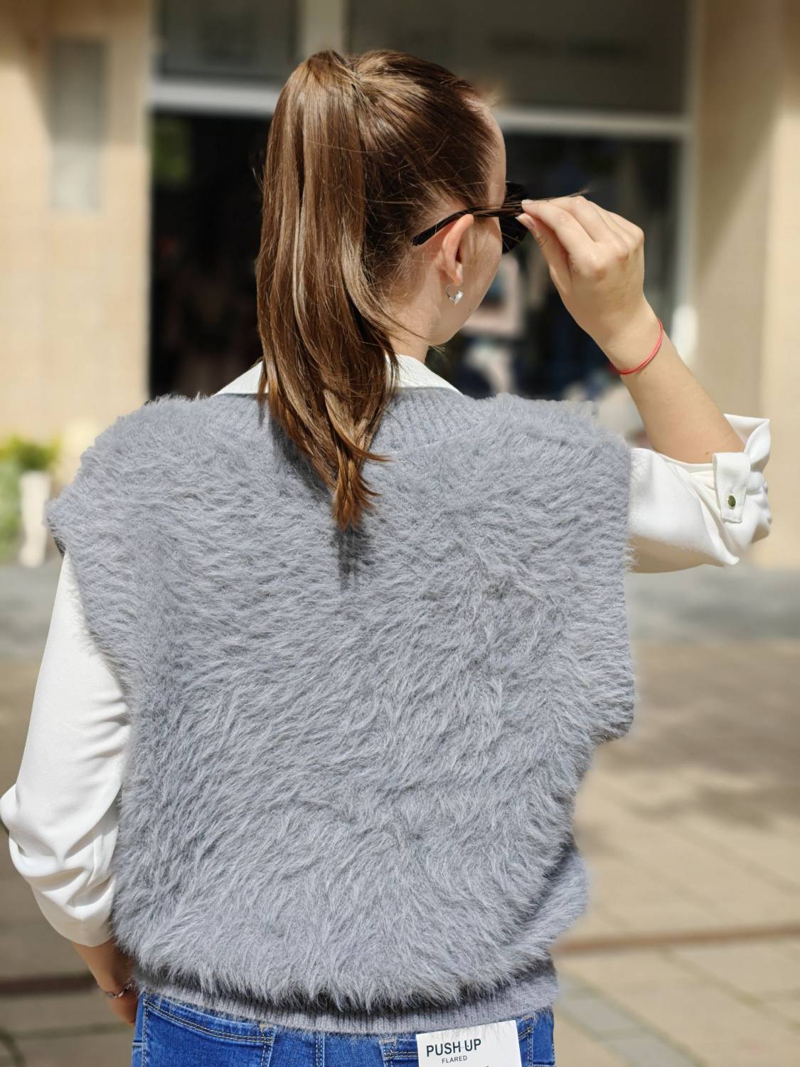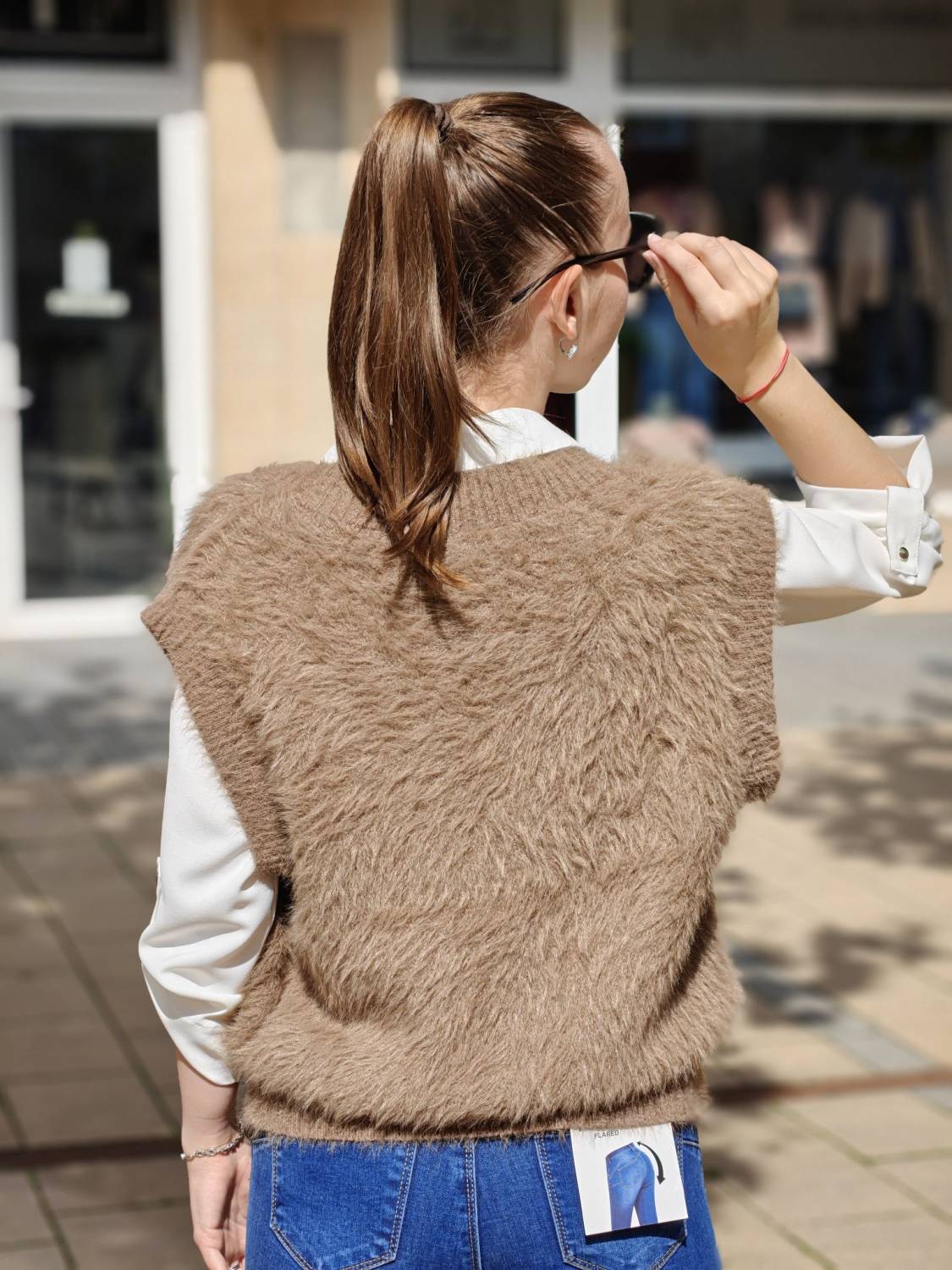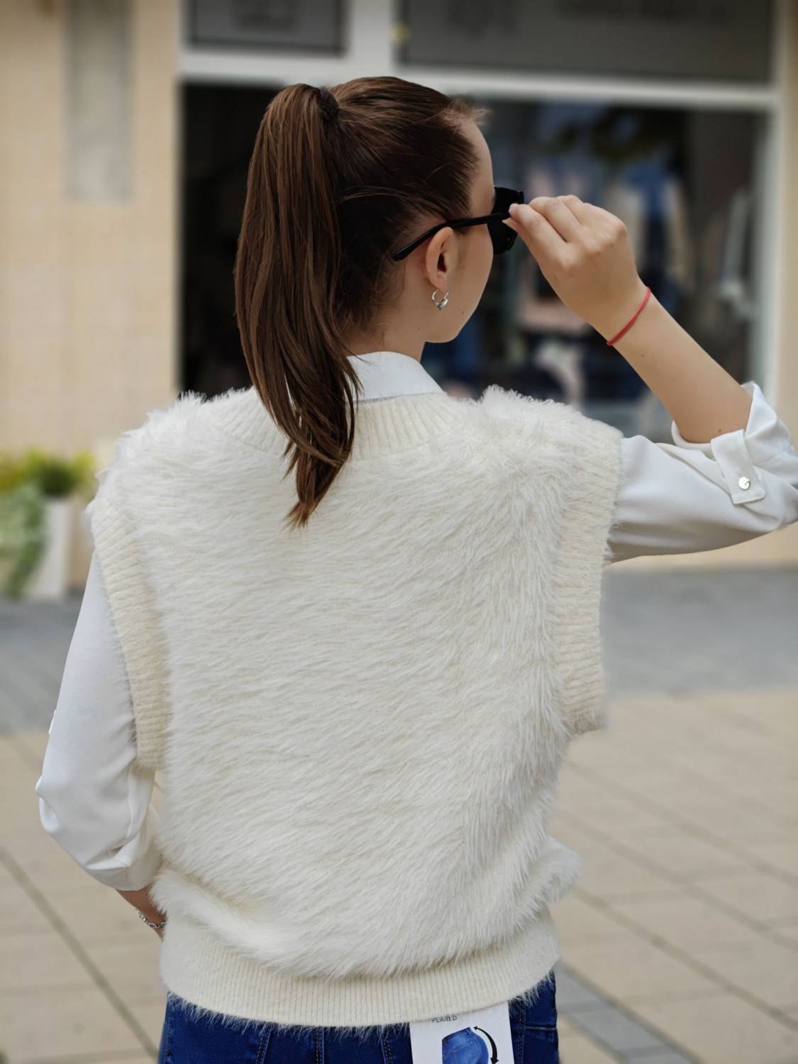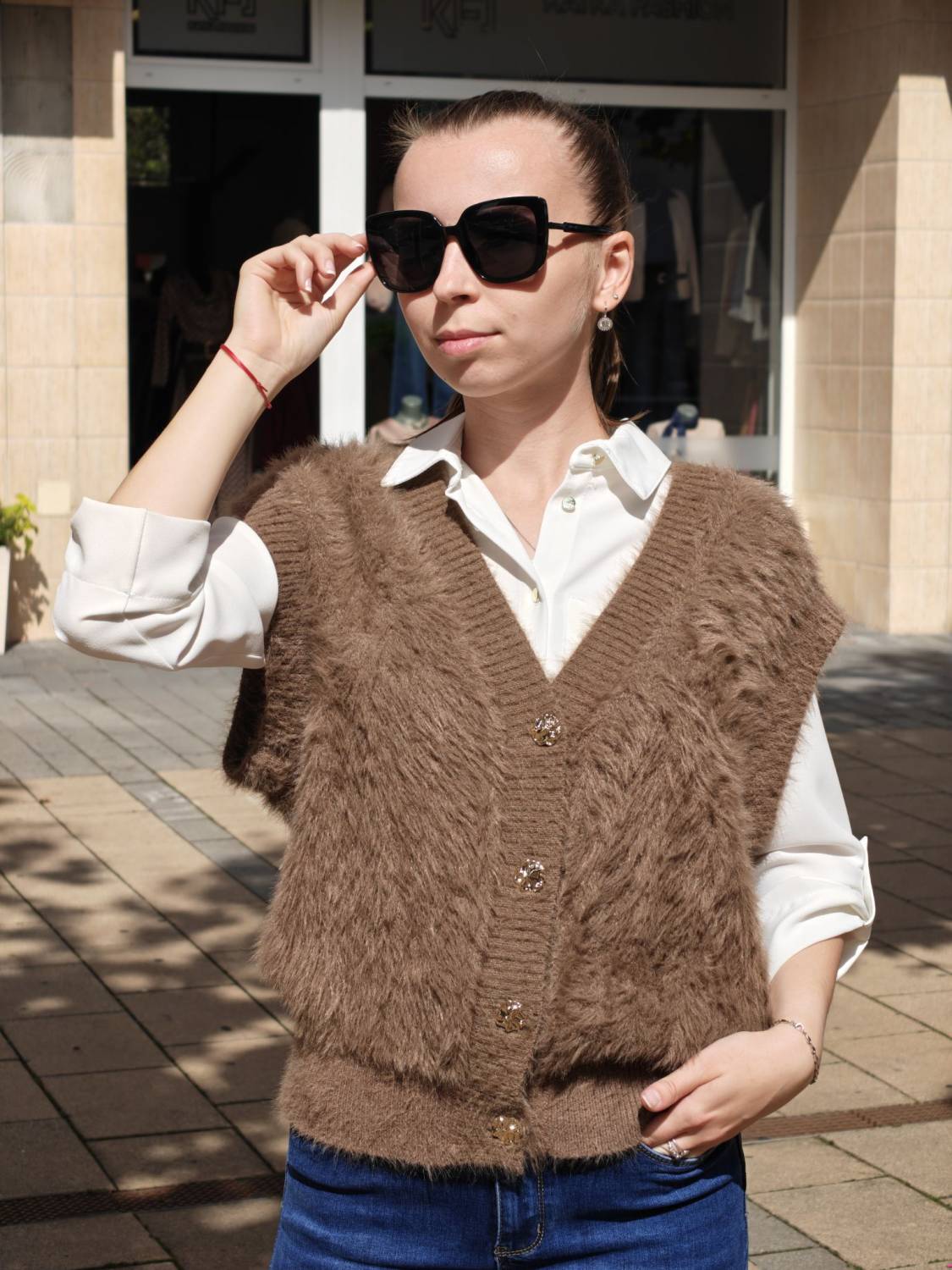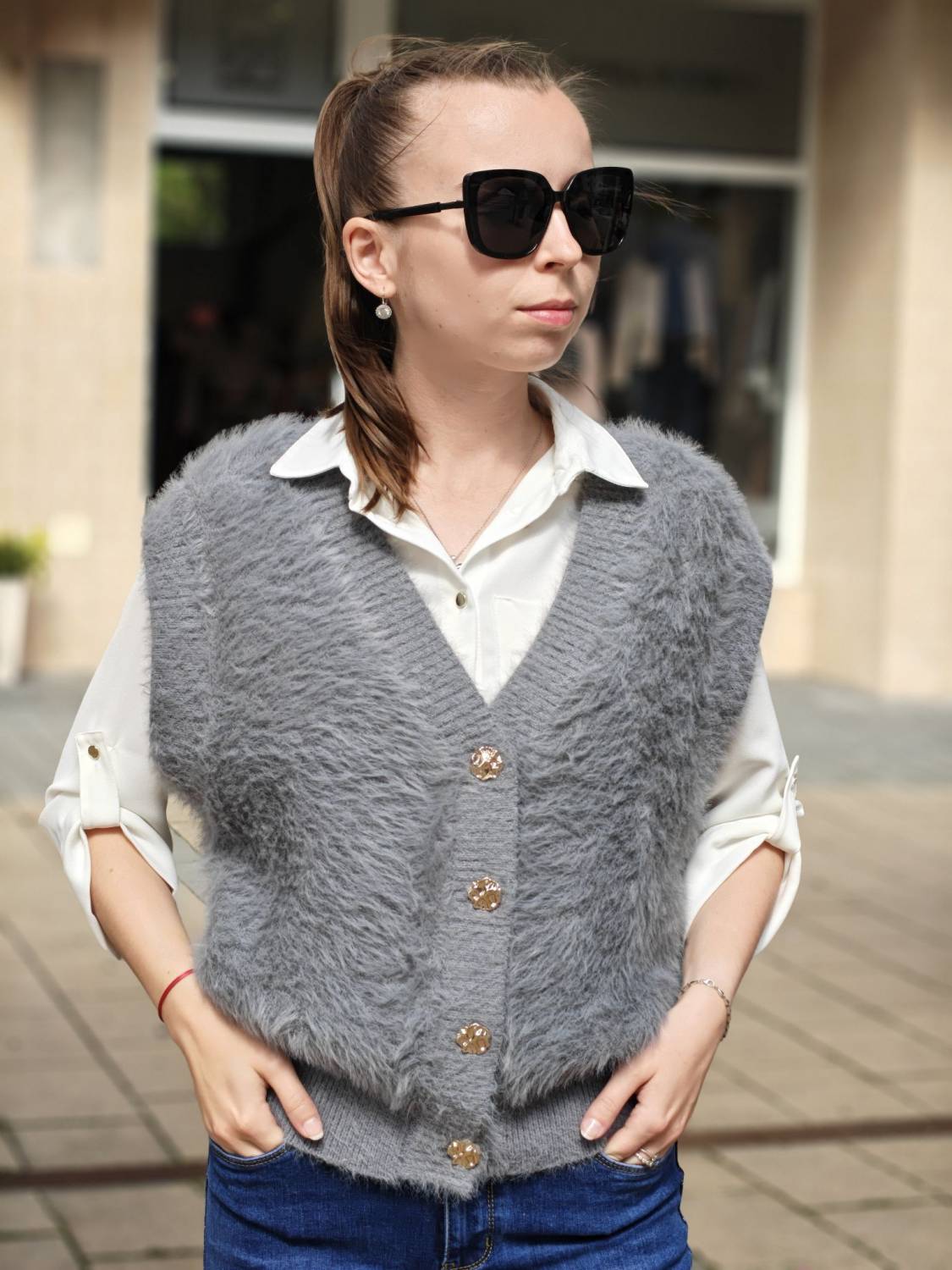 Vesta z veľmi príjemného chlpatého materiálu na gombíky v zlatej farbe.