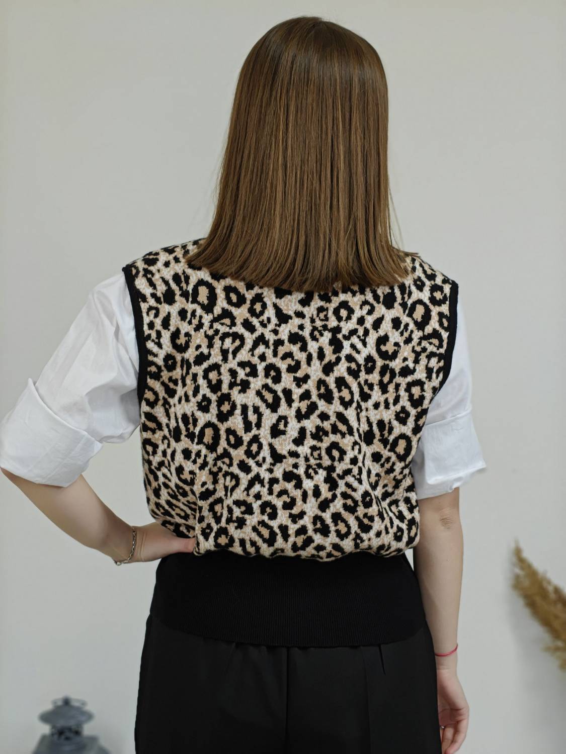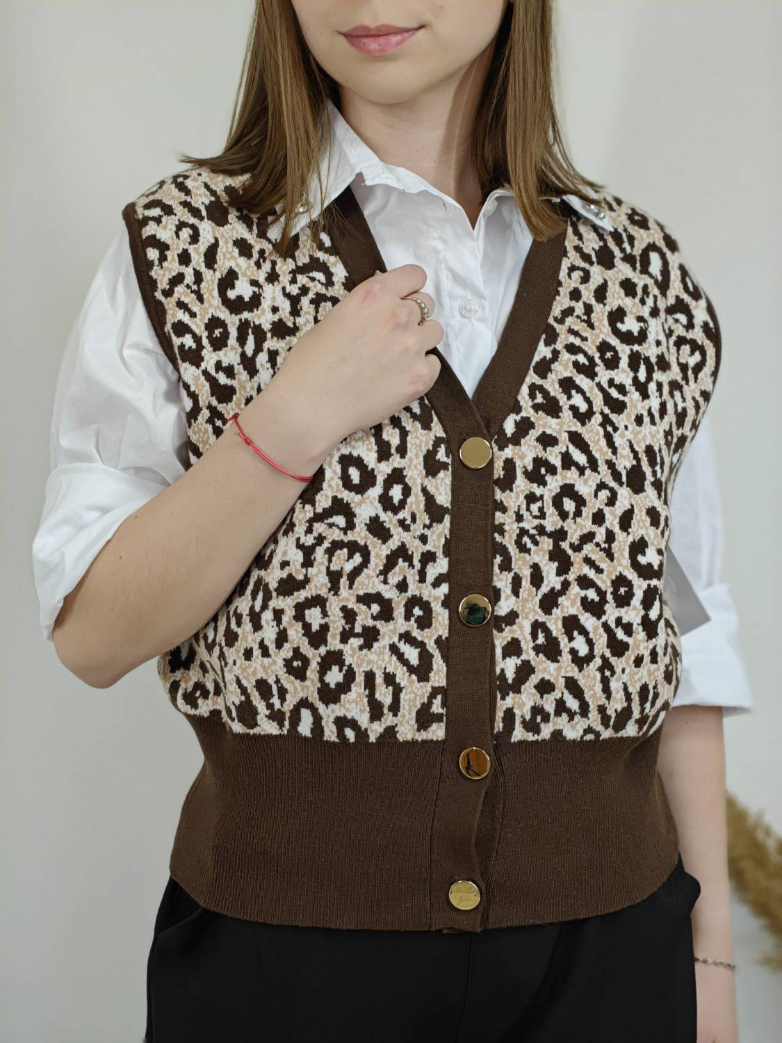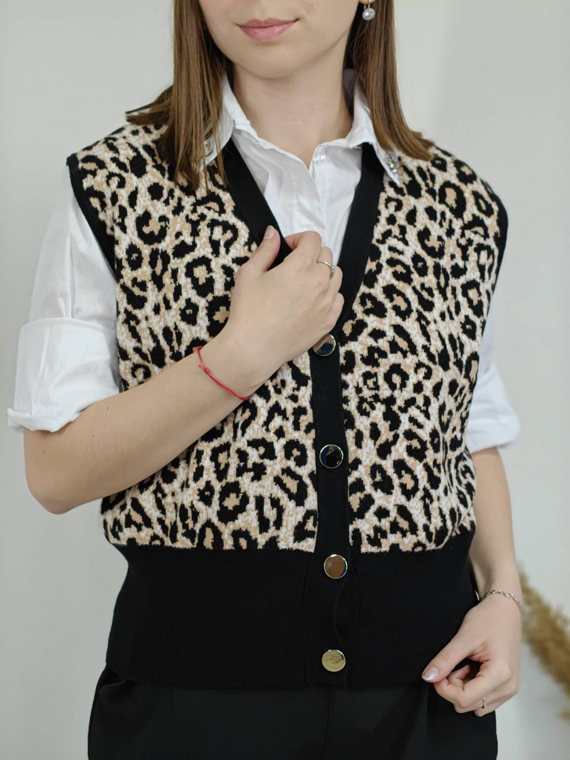 Úpletová vesta s leopadím vzorom a zlatými gombíkmi, je ukončená patentom.