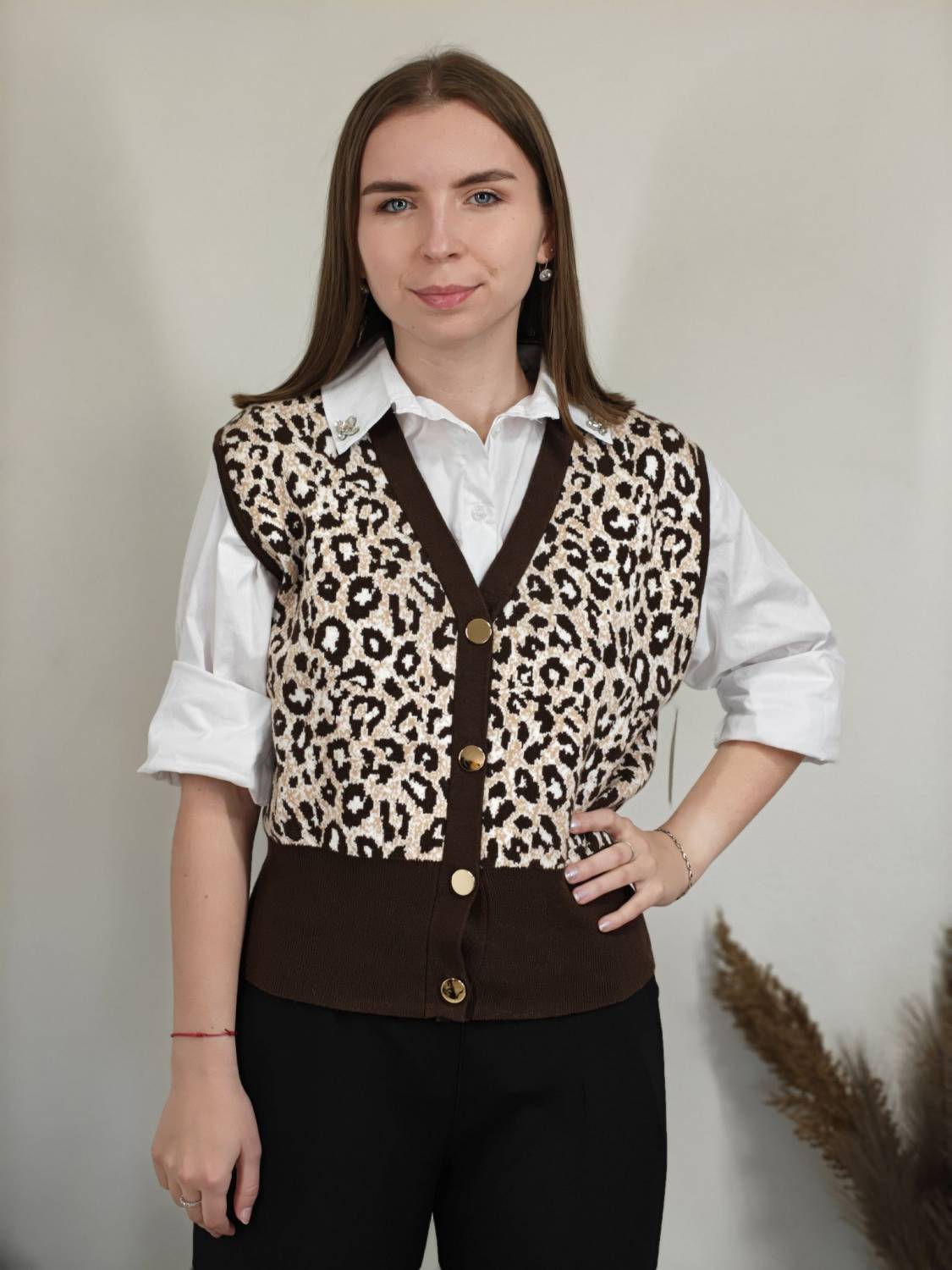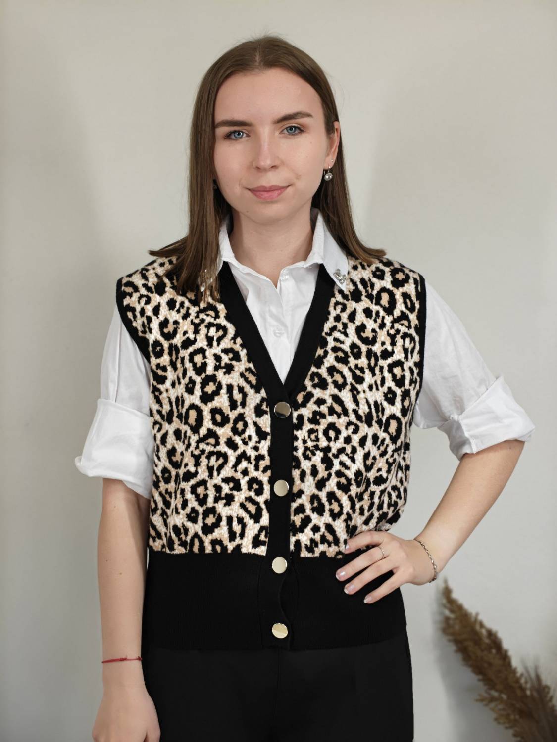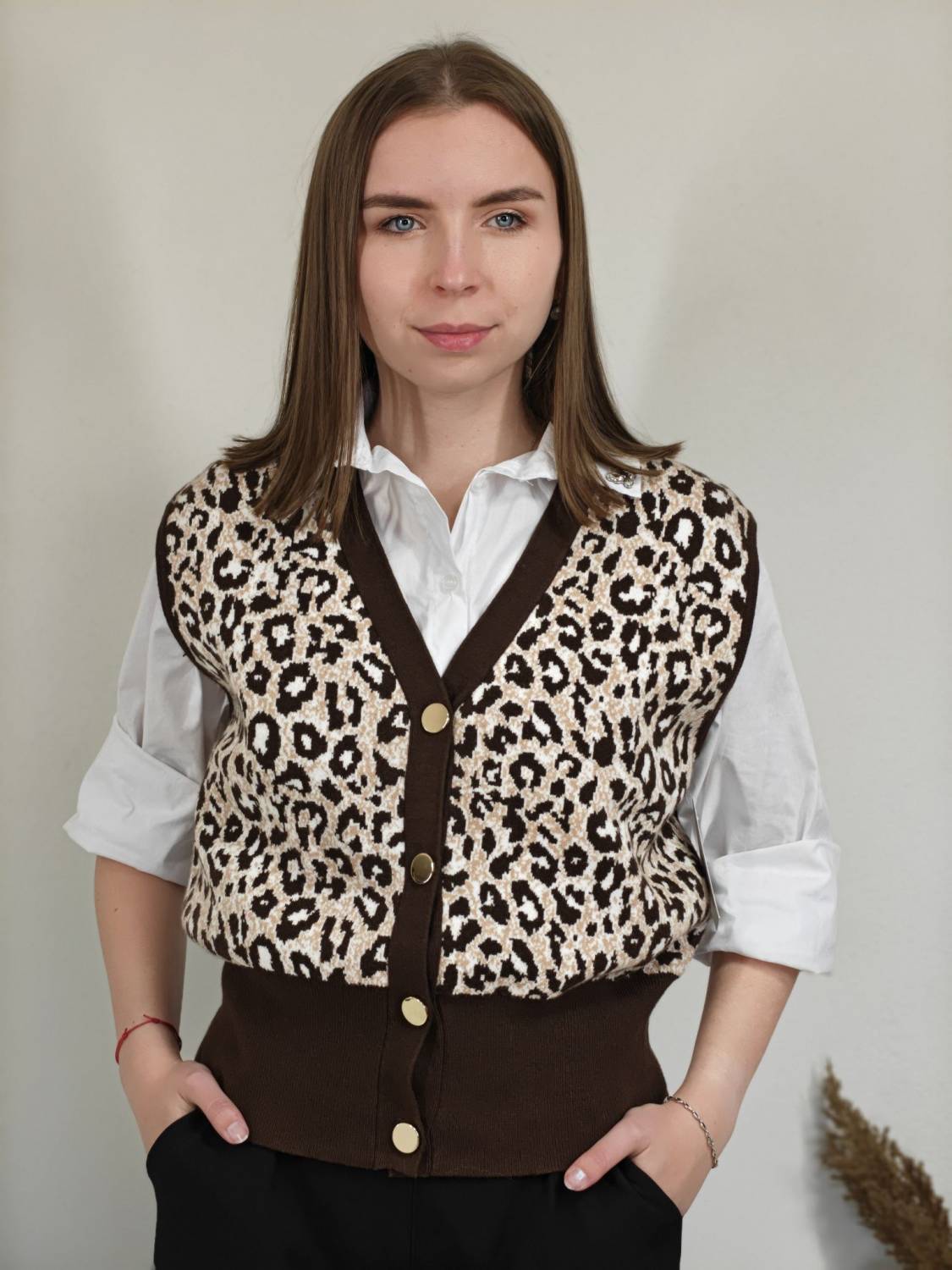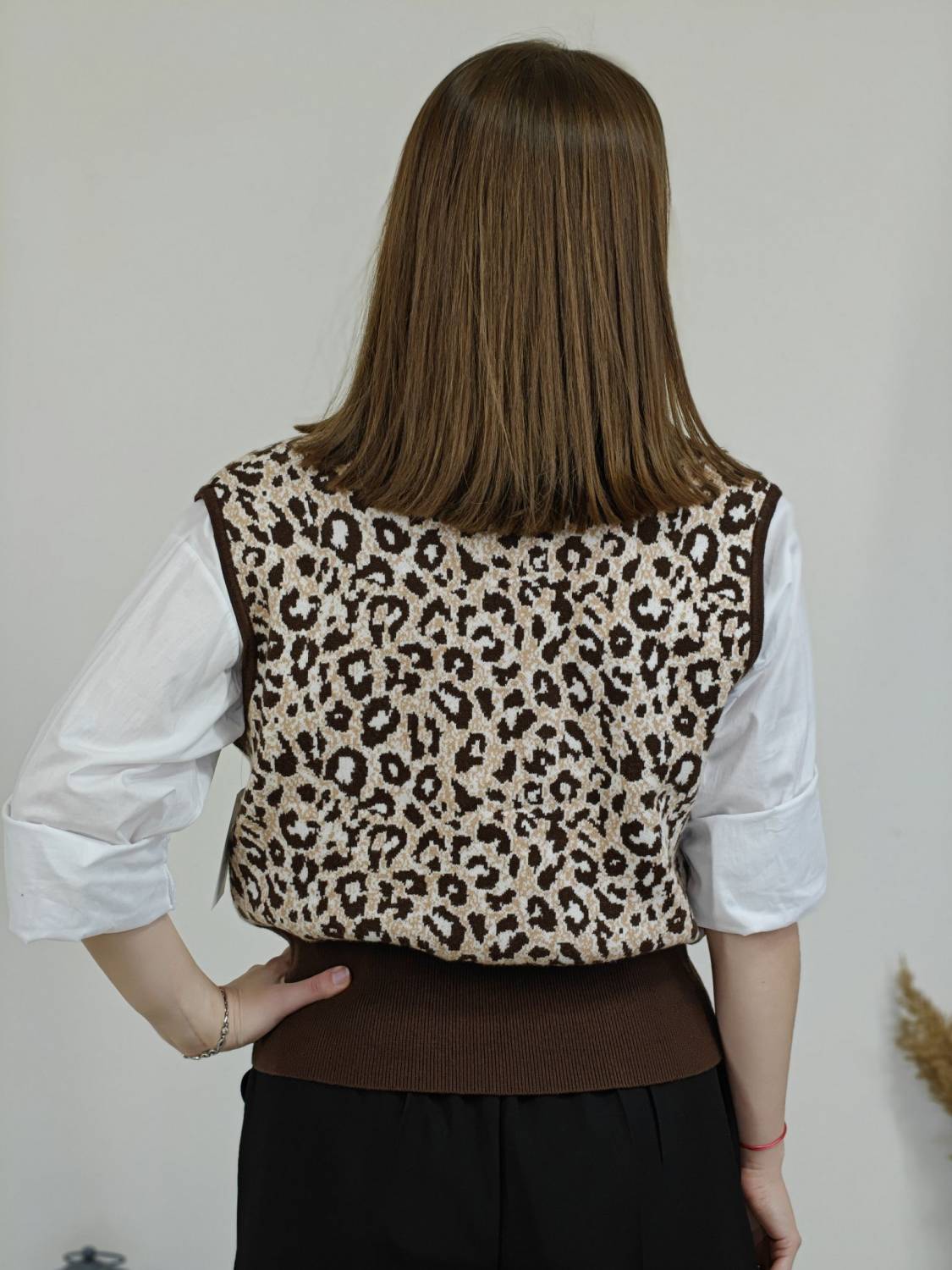 Úpletová vesta s leopadím vzorom a zlatými gombíkmi, je ukončená patentom.