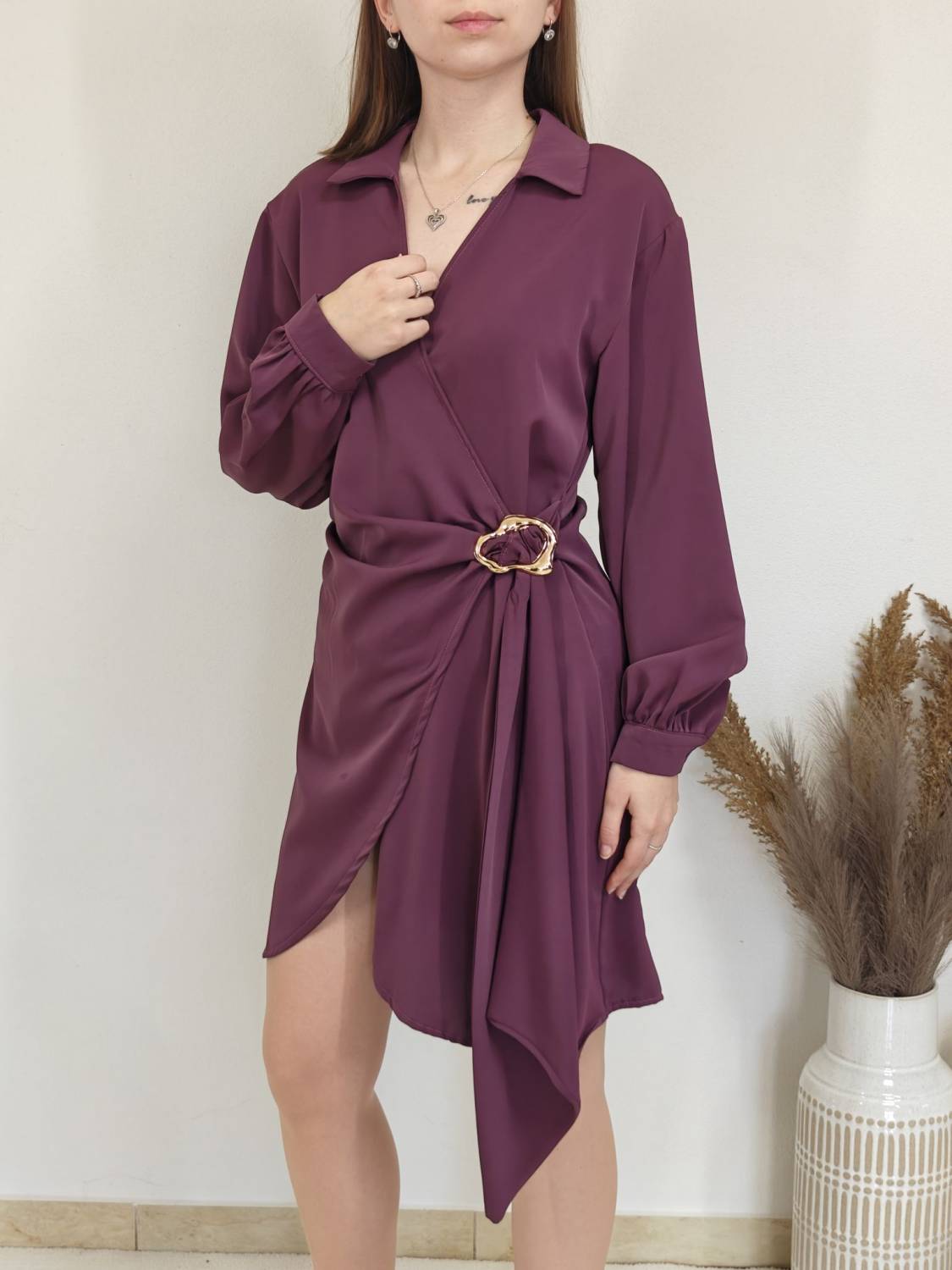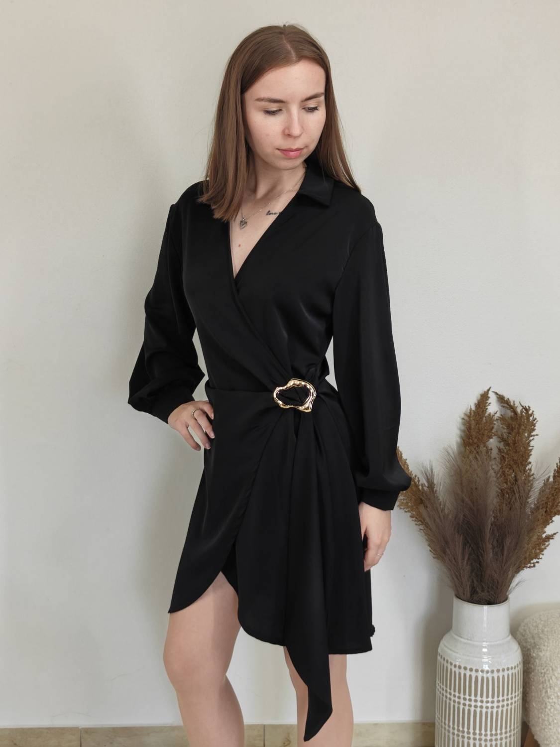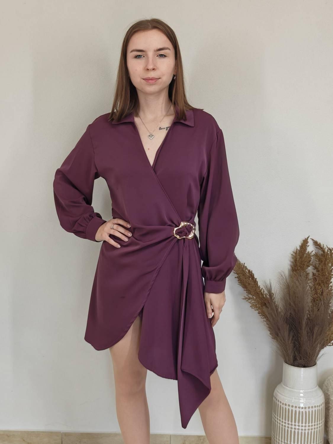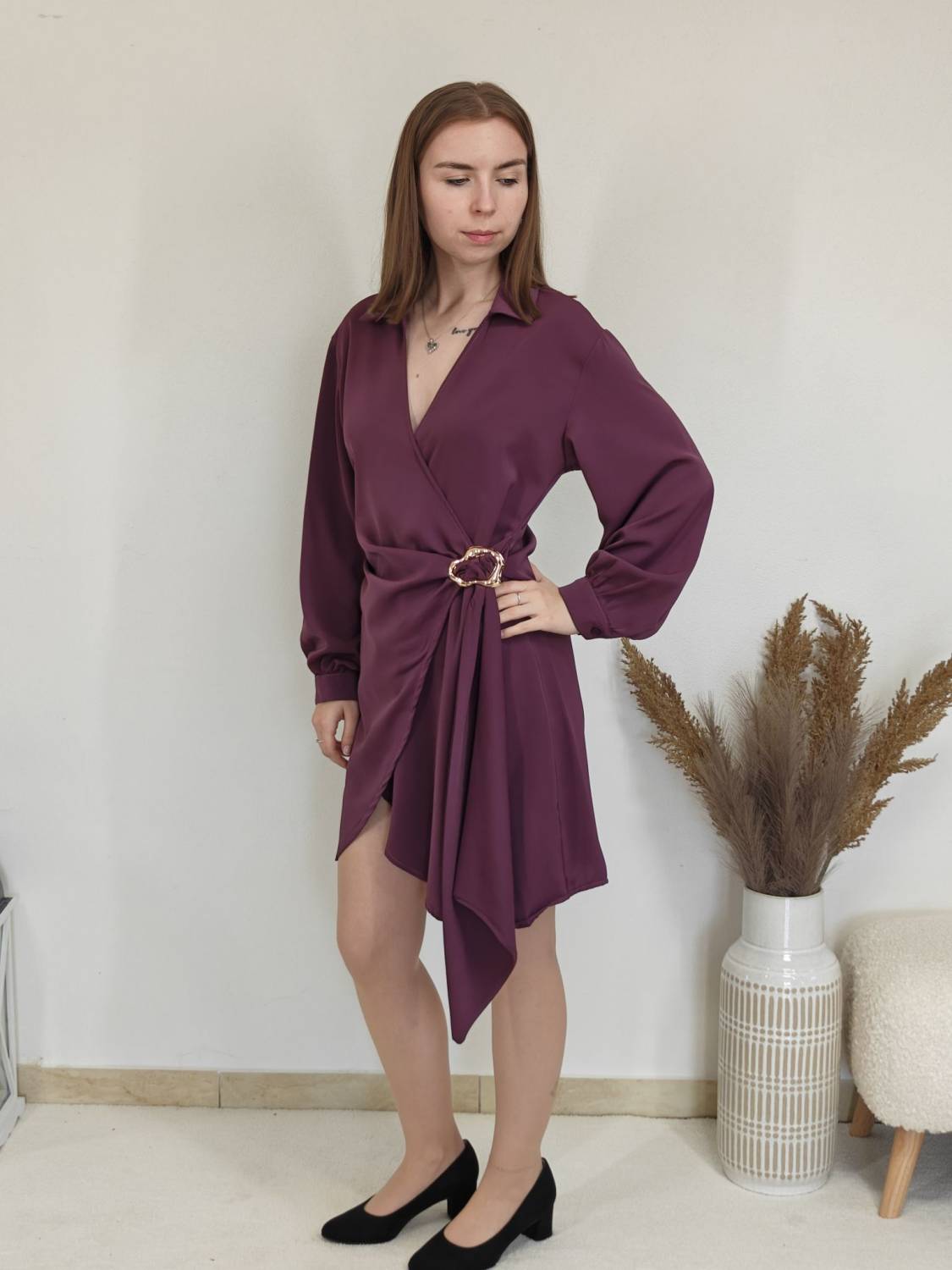 Jednofarebné asymetrické šaty s límcom a prekladom na prsiach. Na boku majú ozdobnú sponu.