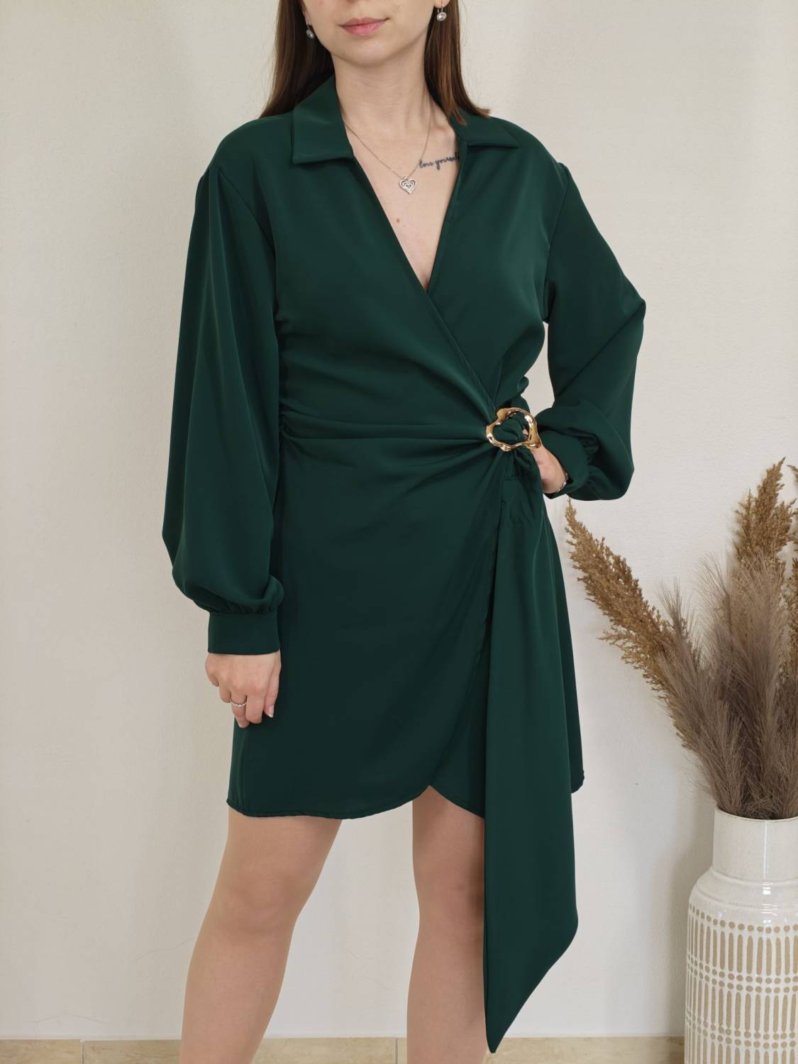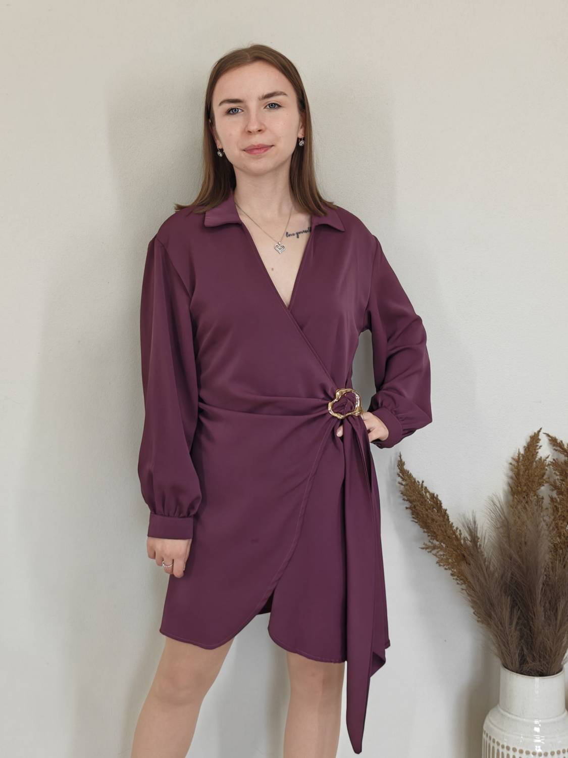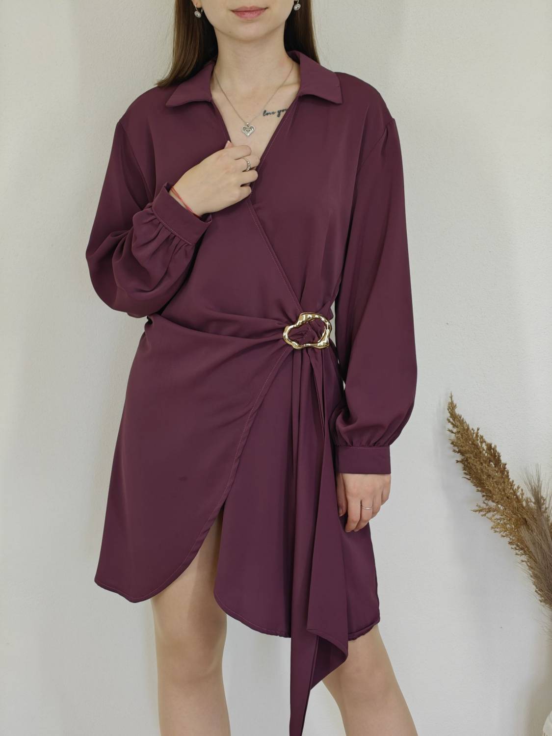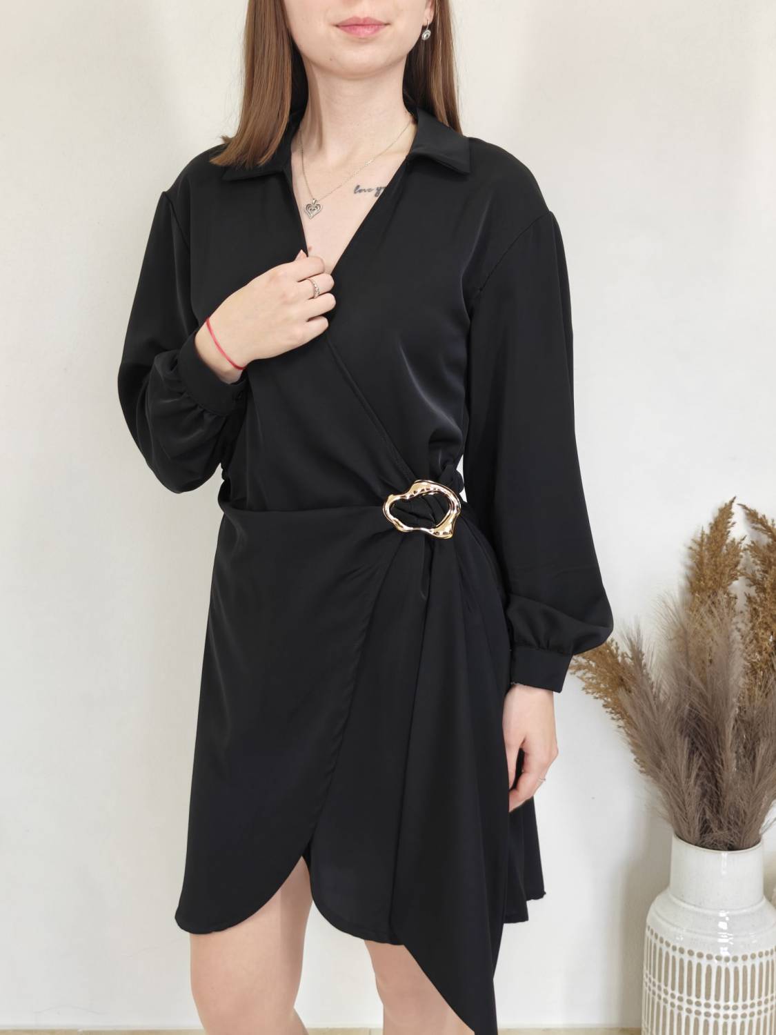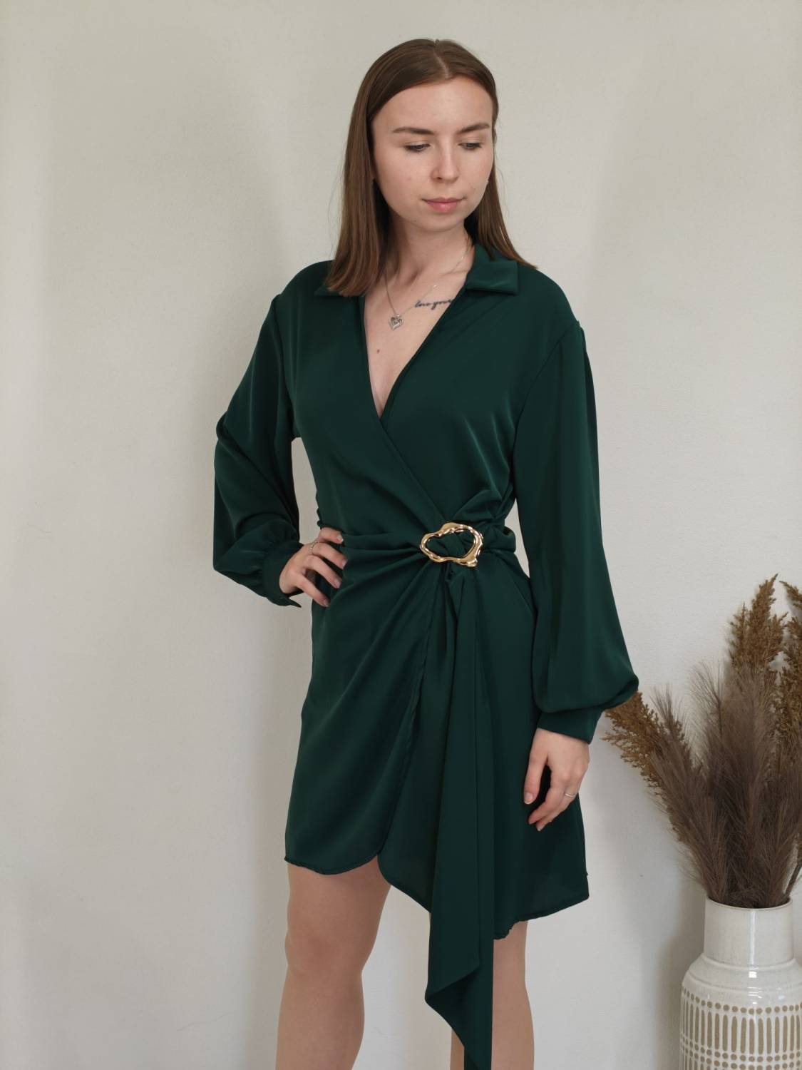 Jednofarebné asymetrické šaty s límcom a prekladom na prsiach. Na boku majú ozdobnú sponu.