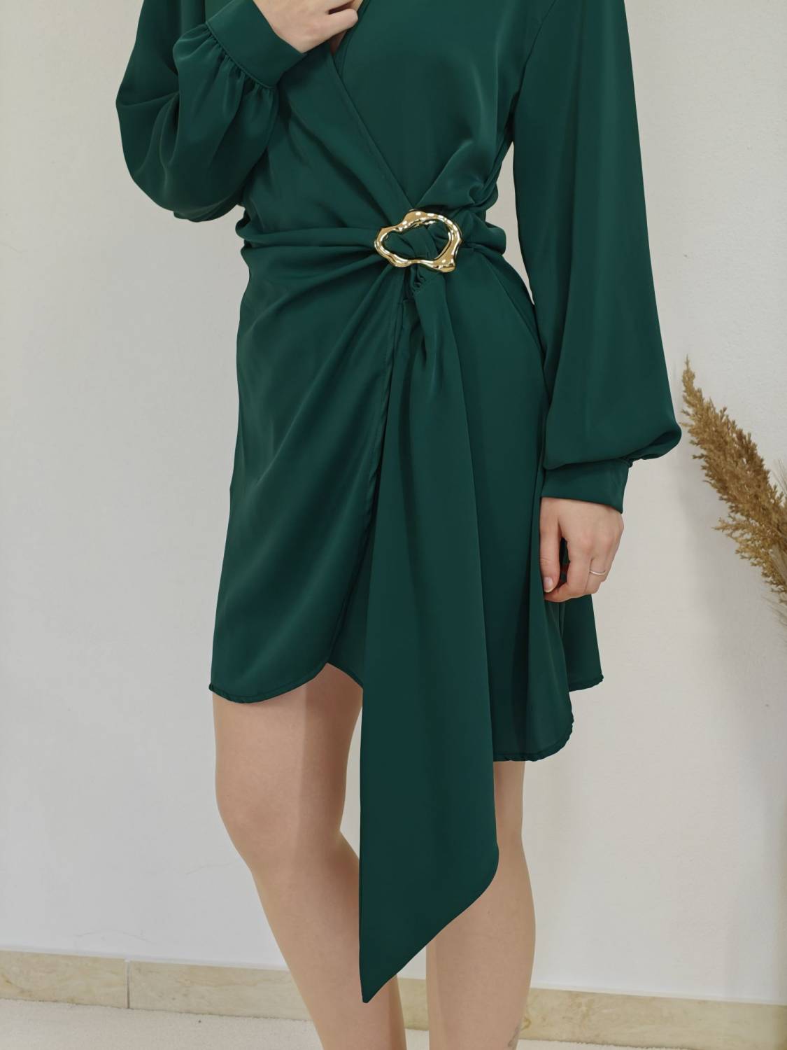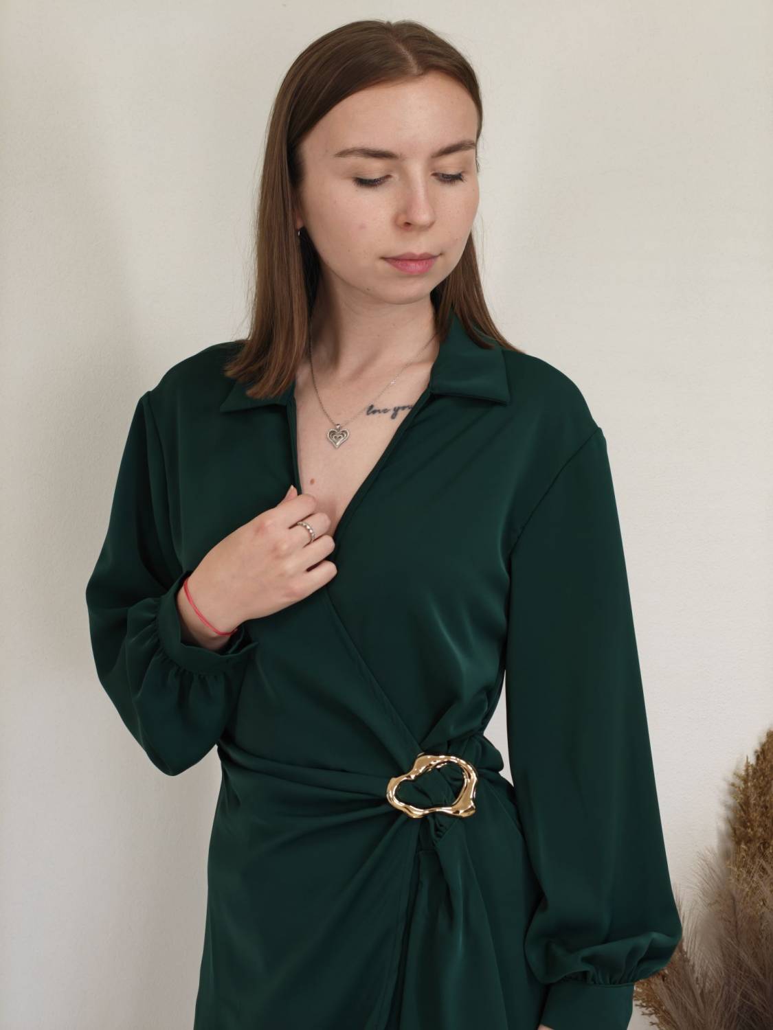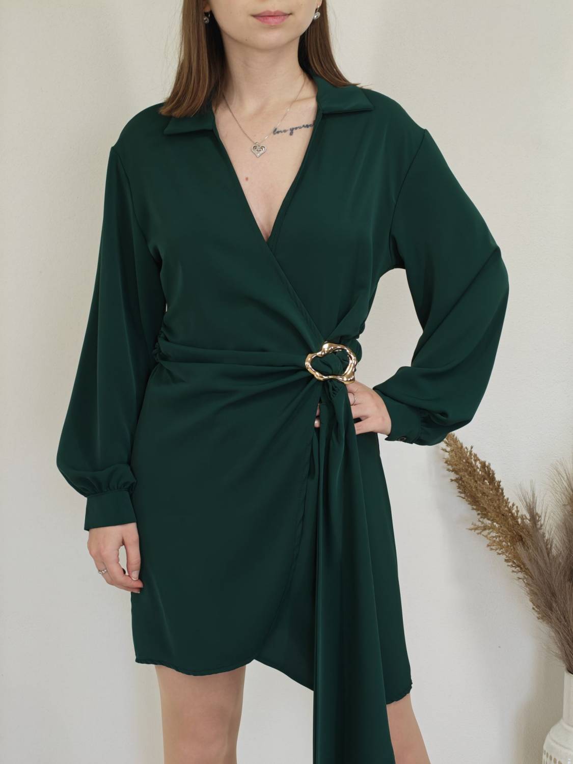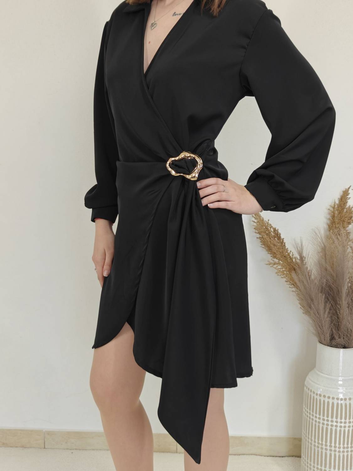 Jednofarebné asymetrické šaty s límcom a prekladom na prsiach. Na boku majú ozdobnú sponu.