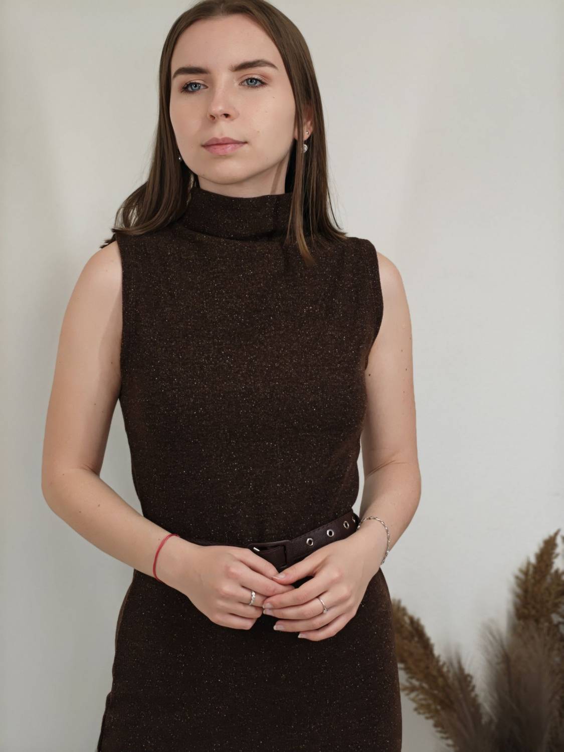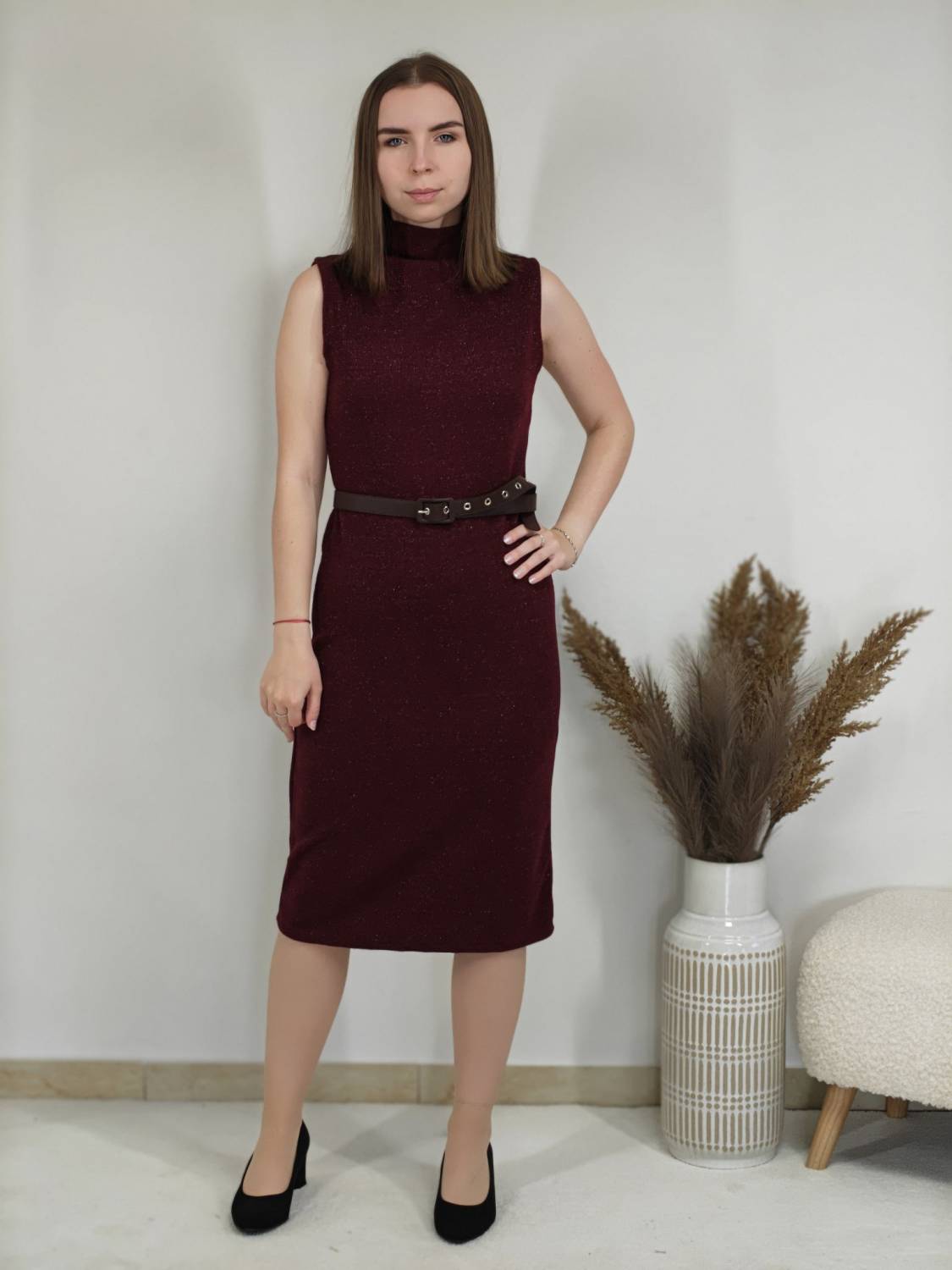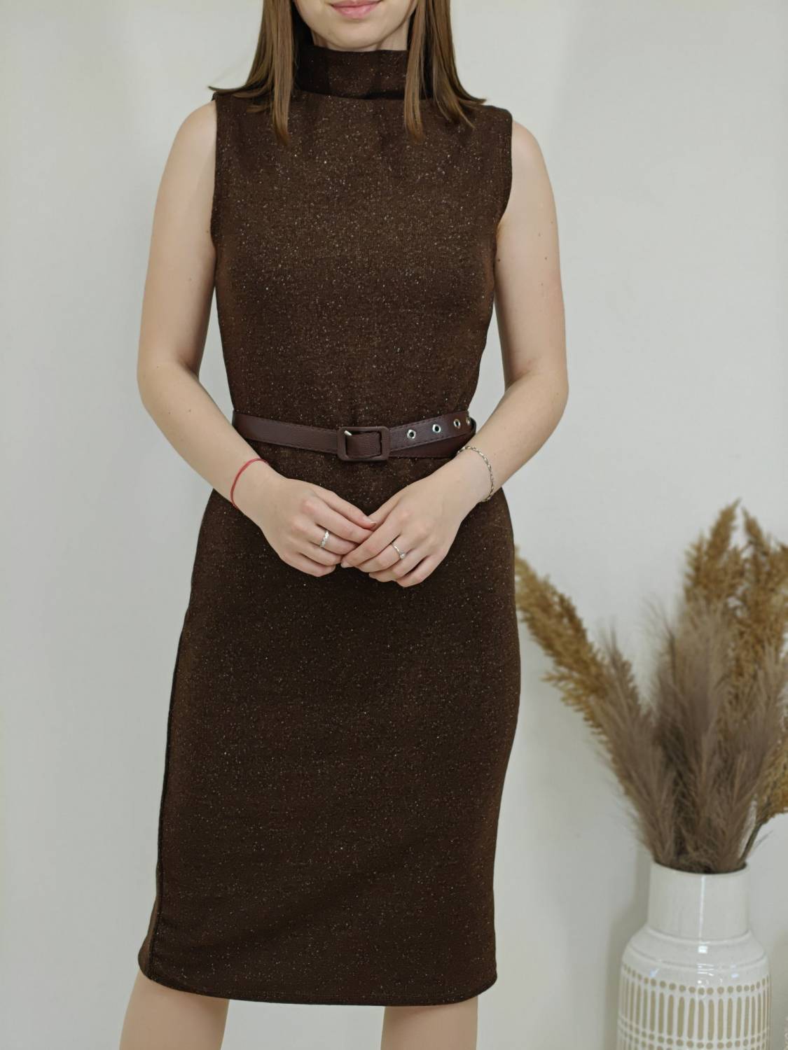 Úpletové šaty bez rukávov s jemnou lurexovou nitkou a opasokom.