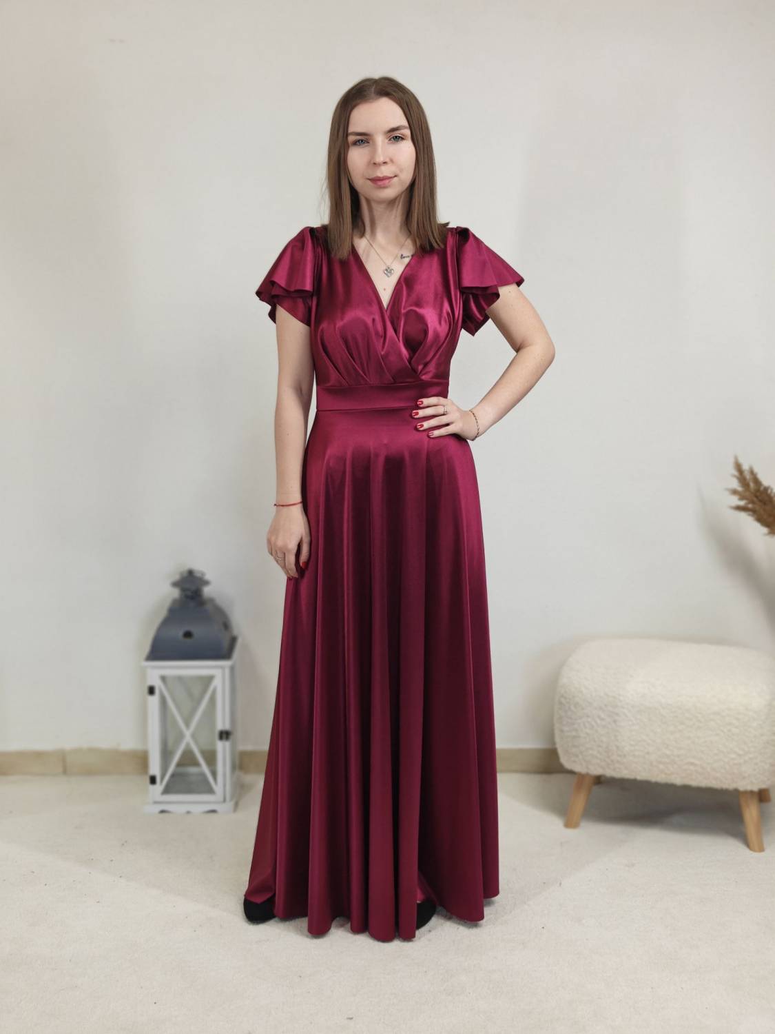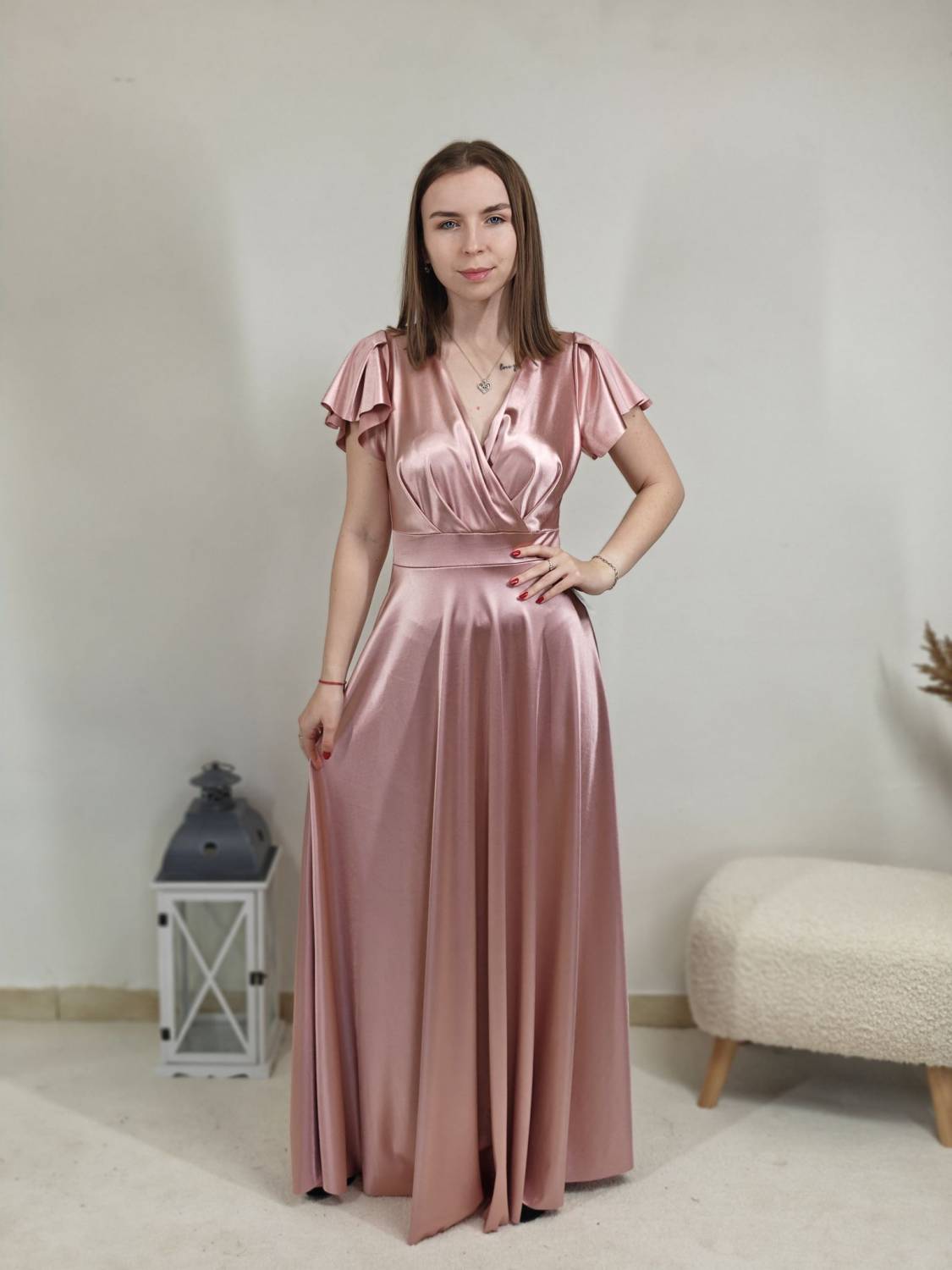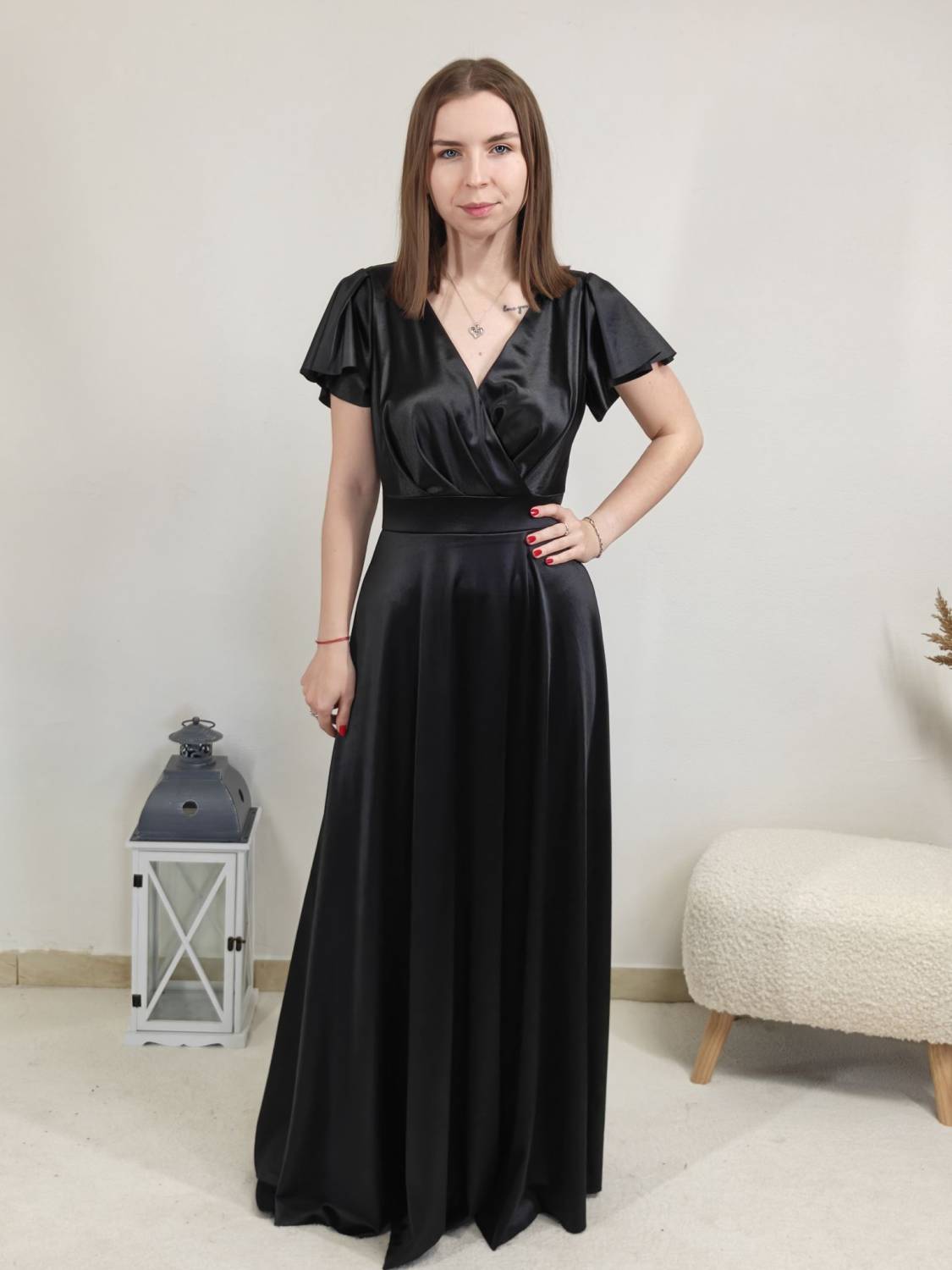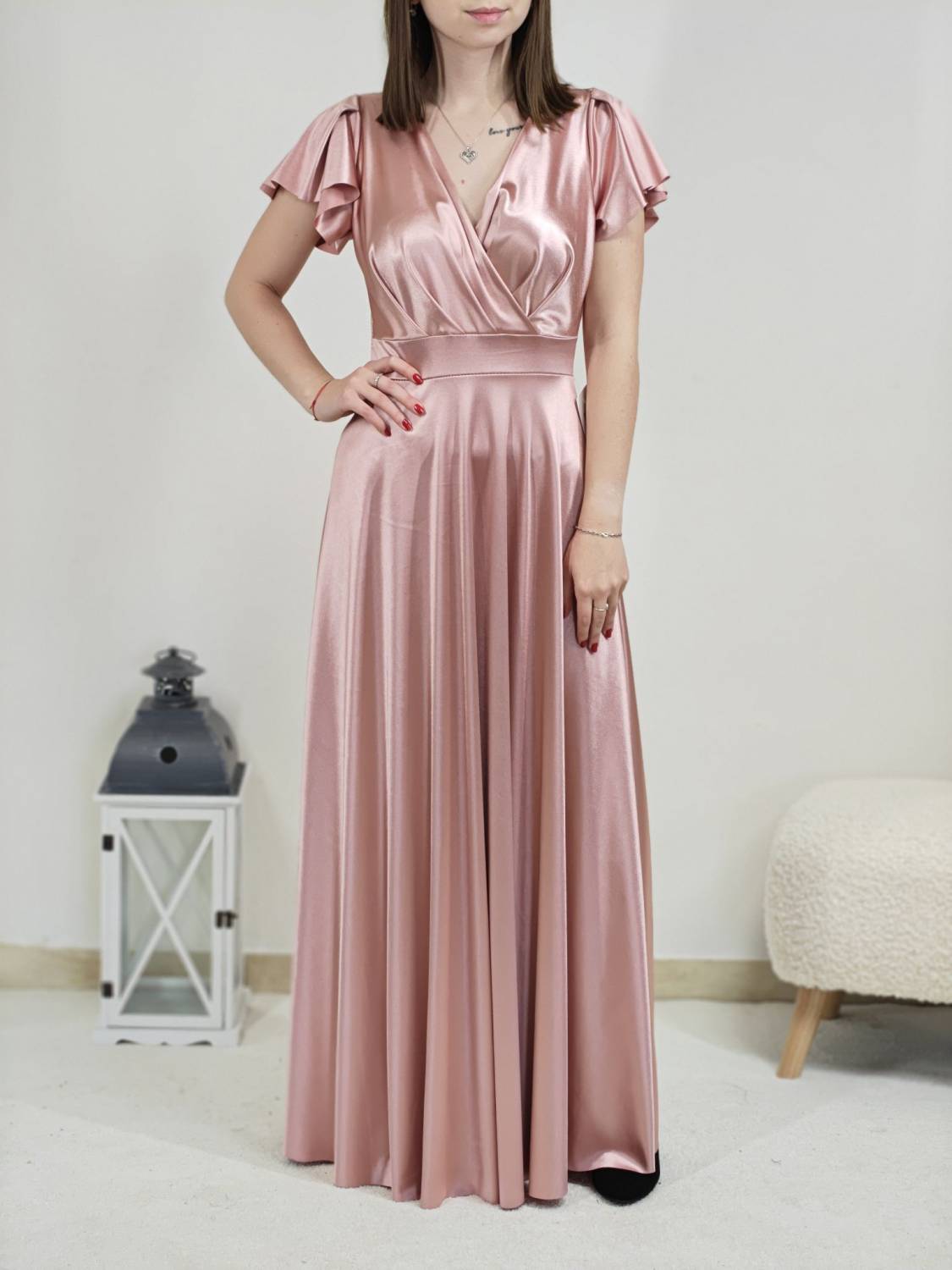 Jednofarebné dlhé šaty s prekladom, prestrihnuté v páse. Zapínanie na zips a majú vypchávkami. Sukňa je do áčka.