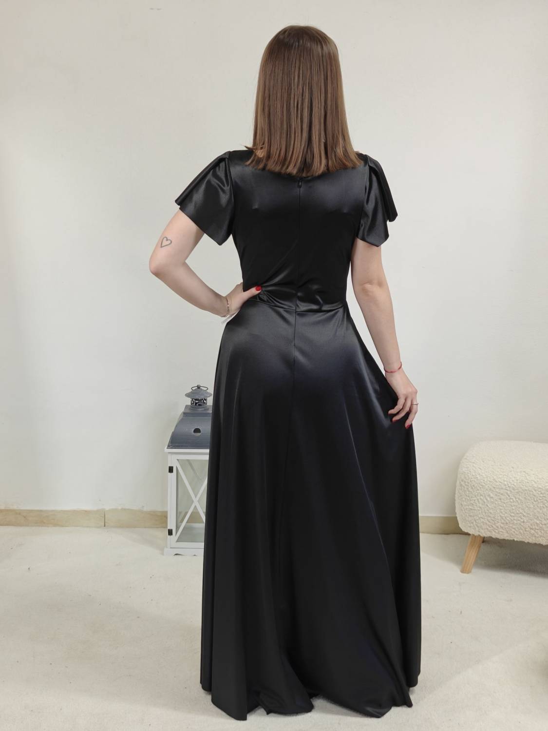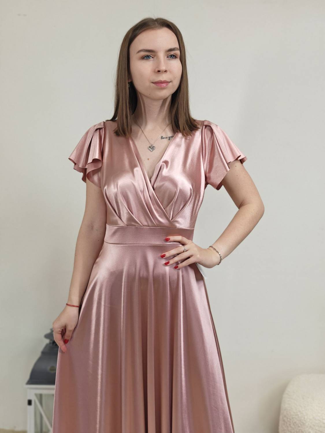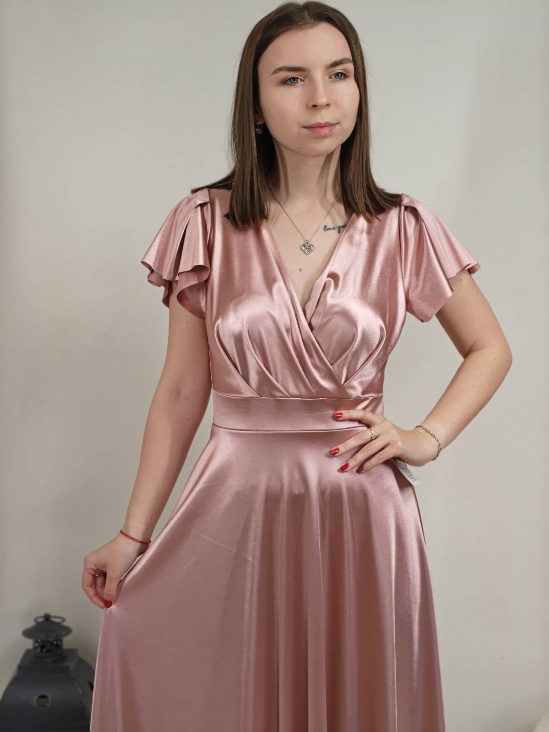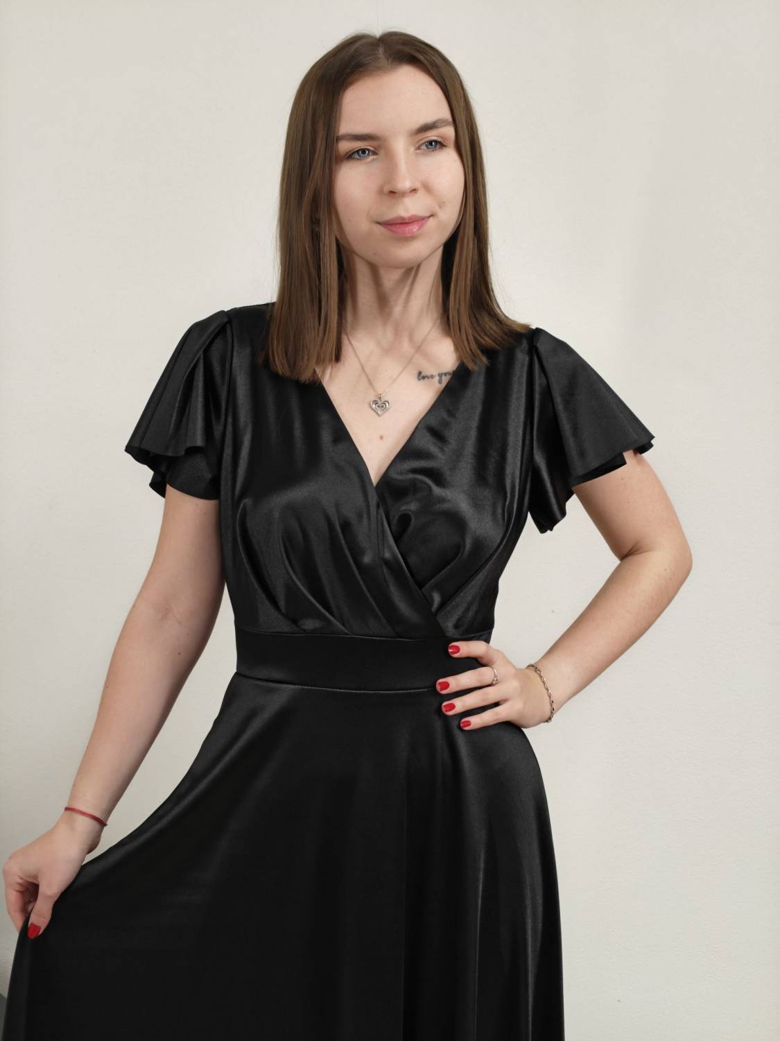 Jednofarebné dlhé šaty s prekladom, prestrihnuté v páse. Zapínanie na zips a majú vypchávkami. Sukňa je do áčka.