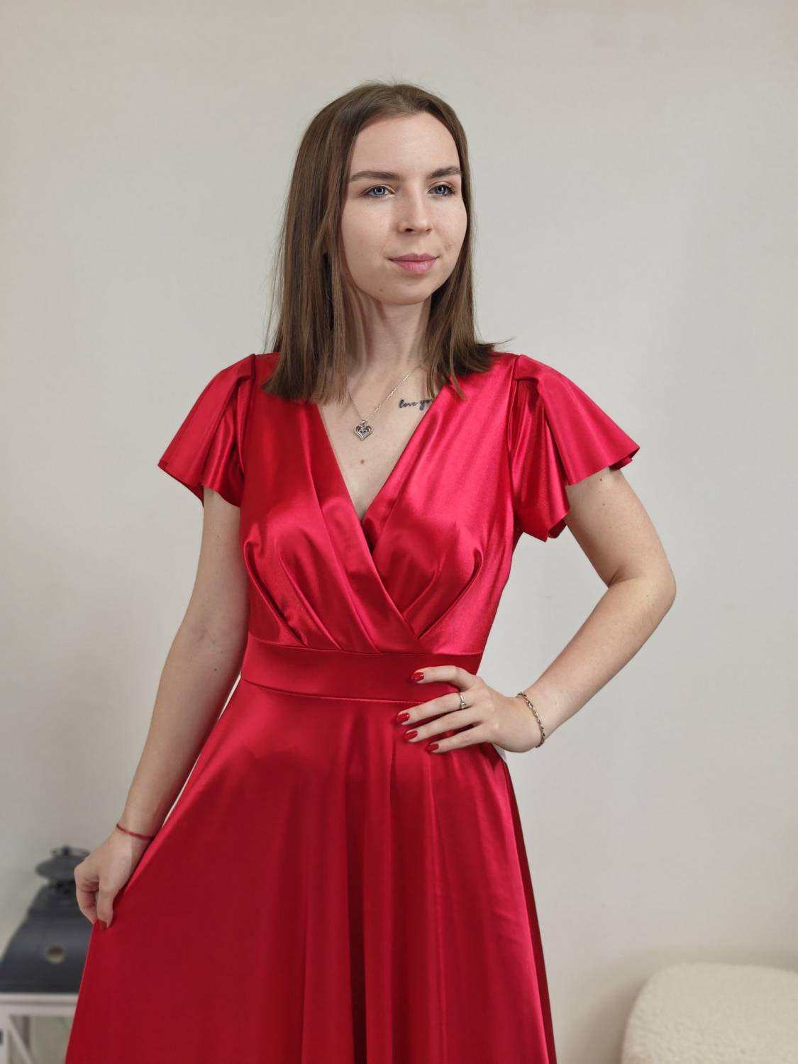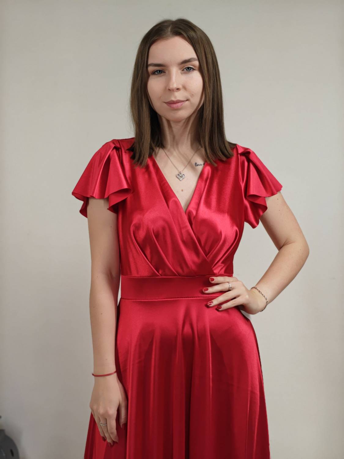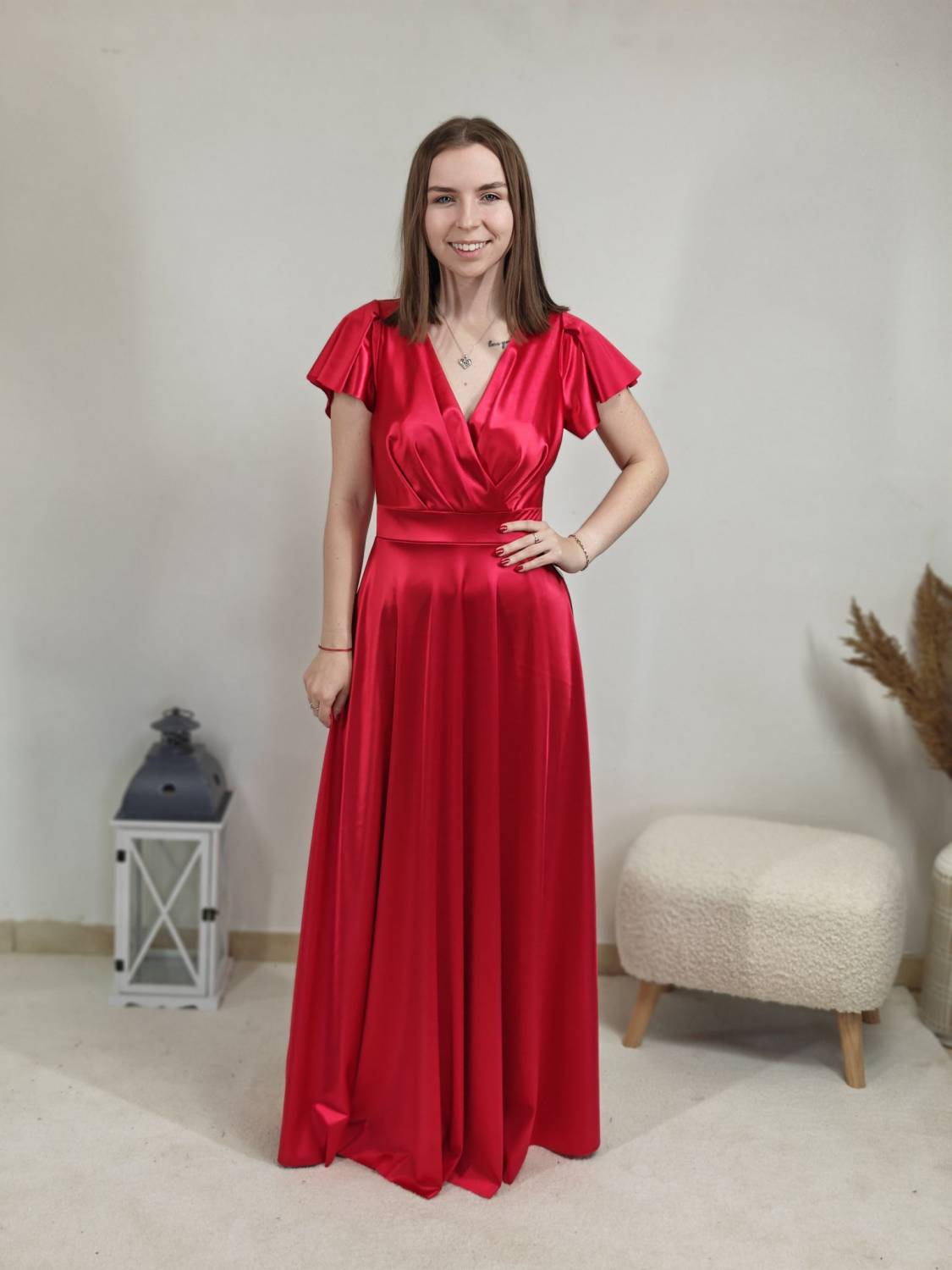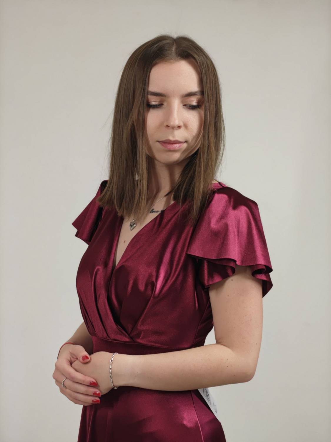 Jednofarebné dlhé šaty s prekladom, prestrihnuté v páse. Zapínanie na zips a majú vypchávkami. Sukňa je do áčka.