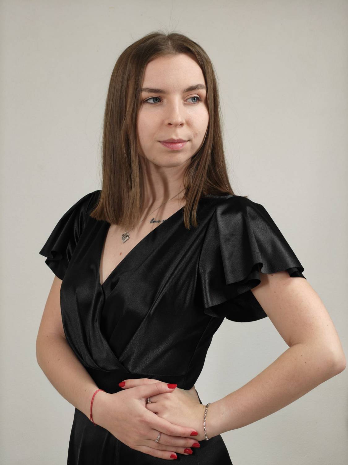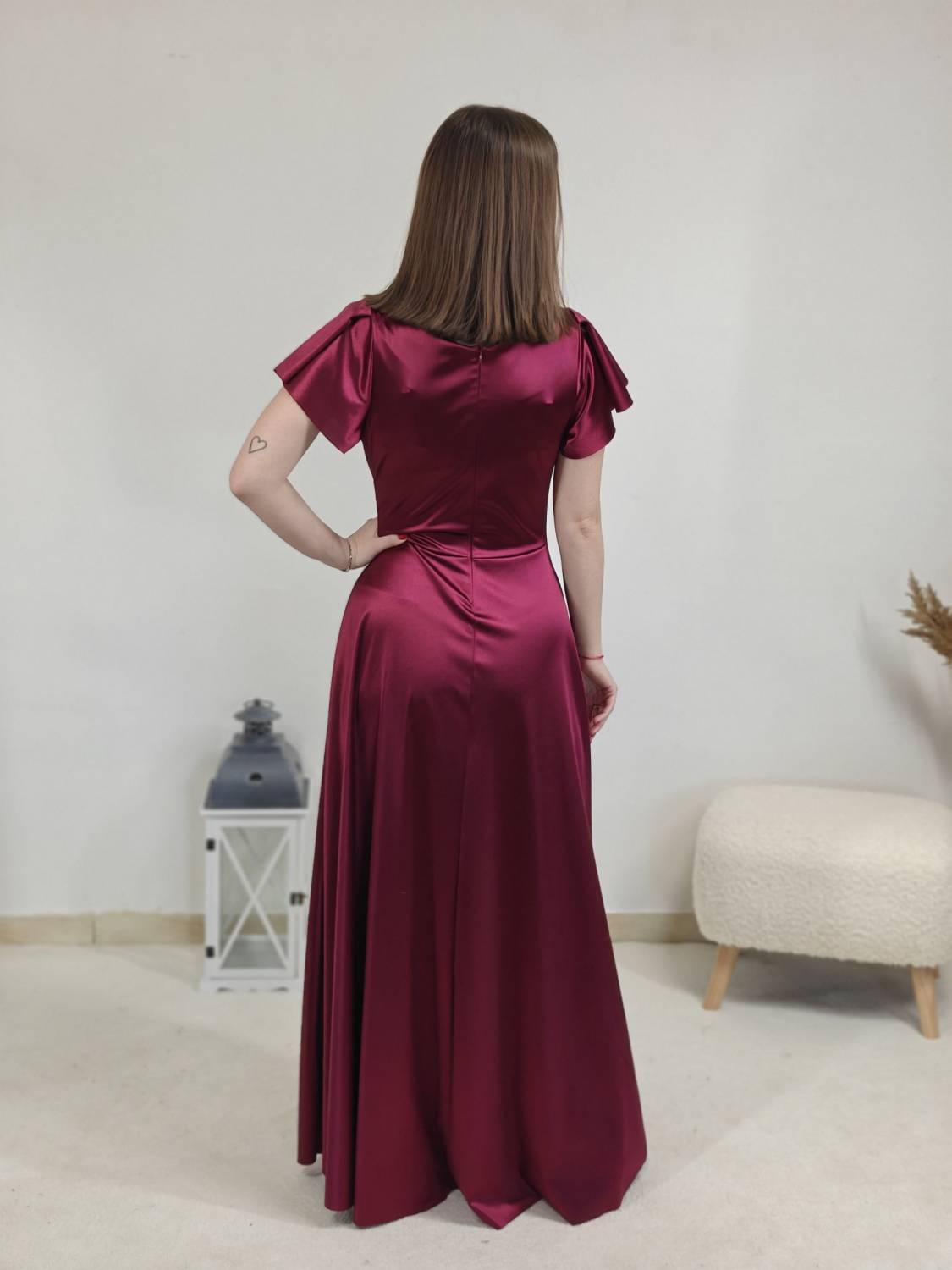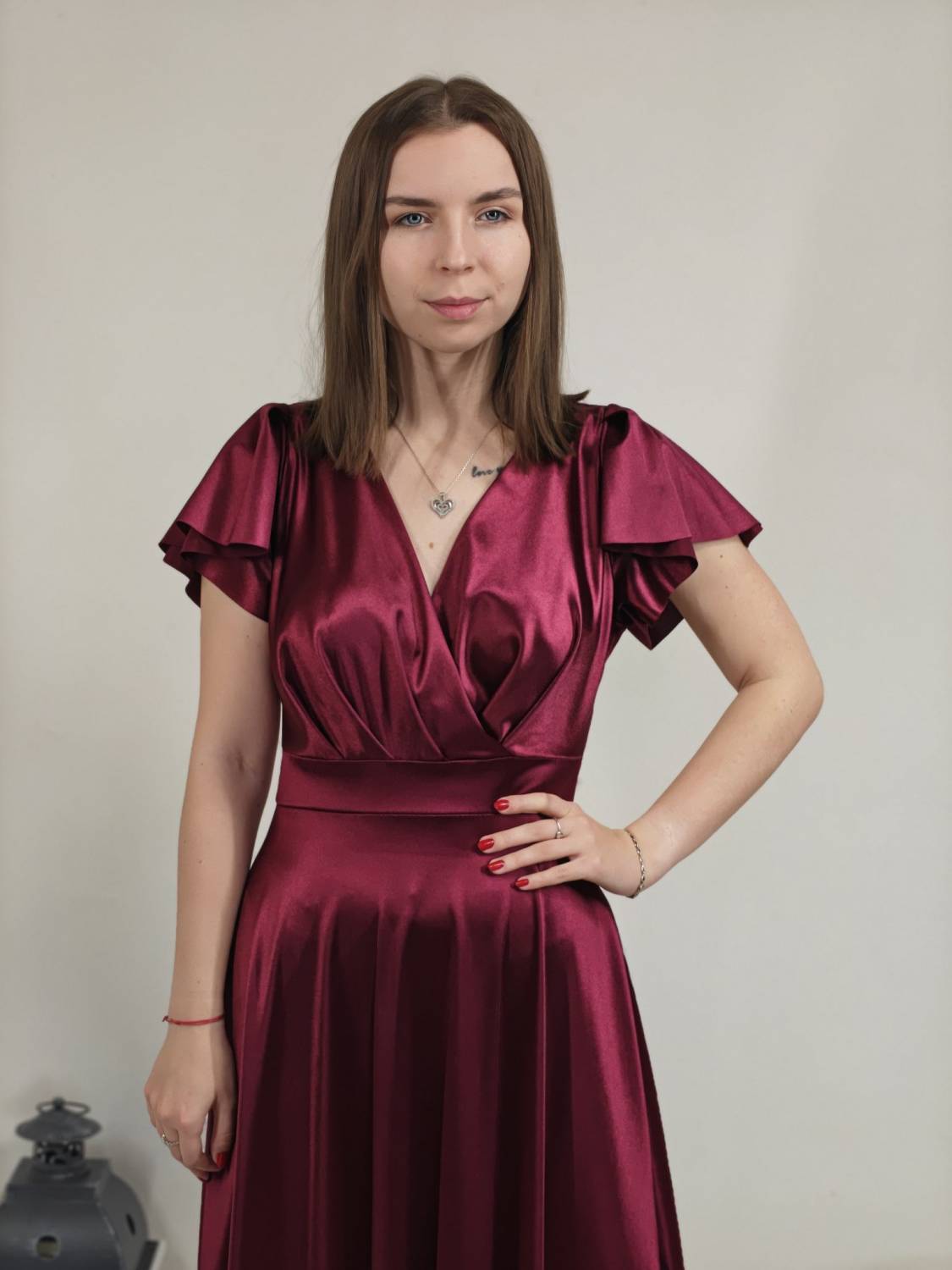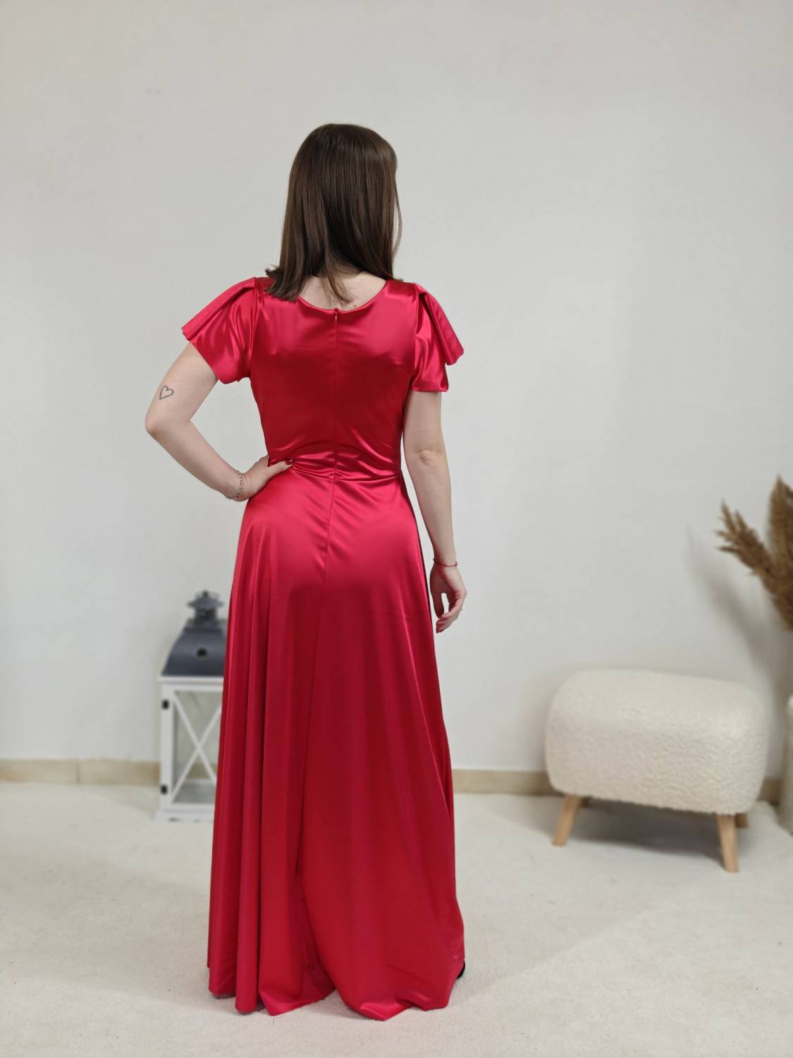 Jednofarebné dlhé šaty s prekladom, prestrihnuté v páse. Zapínanie na zips a majú vypchávkami. Sukňa je do áčka.