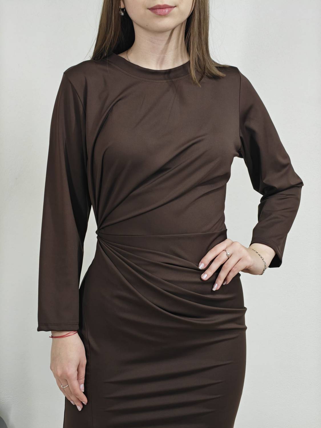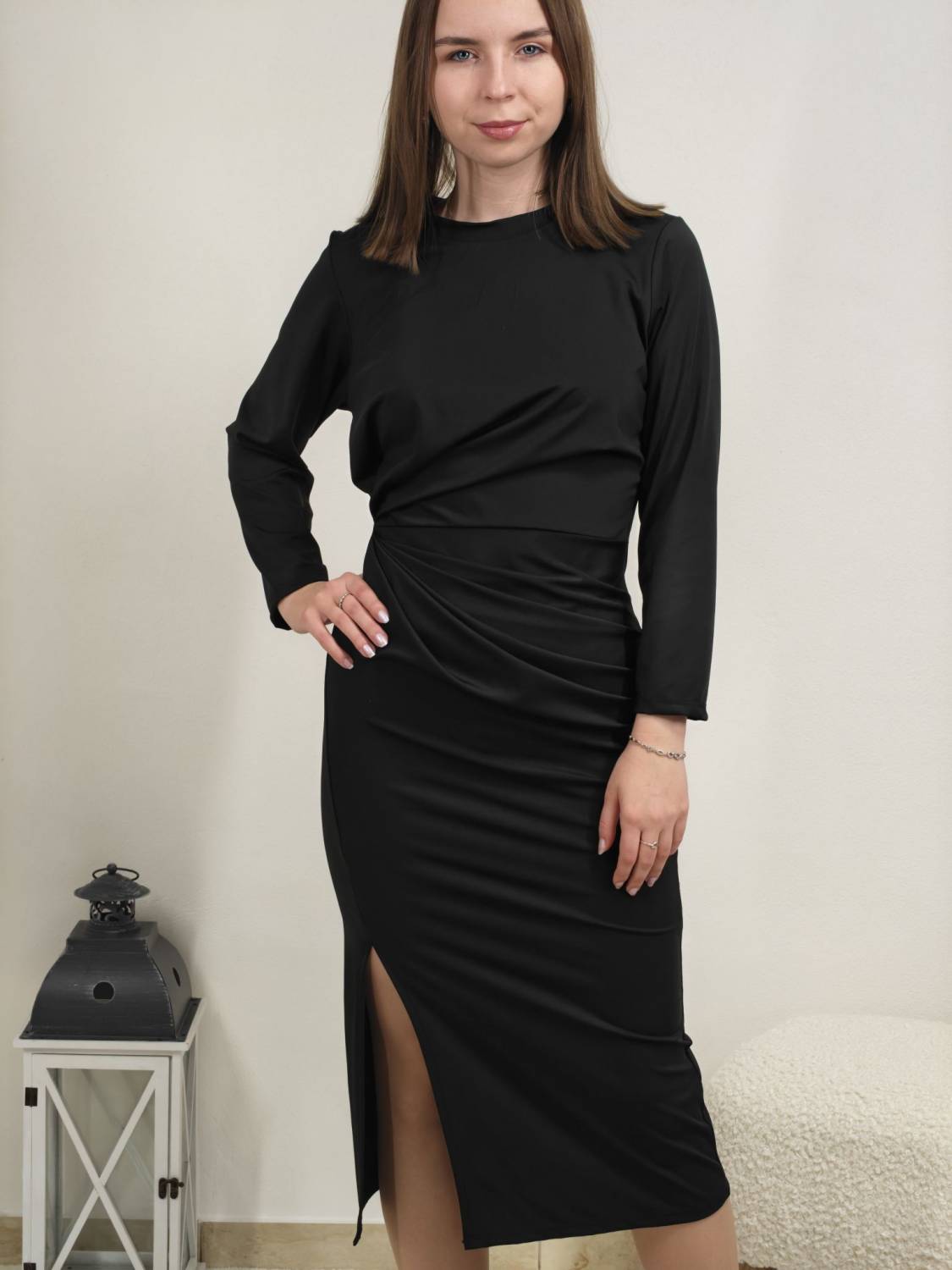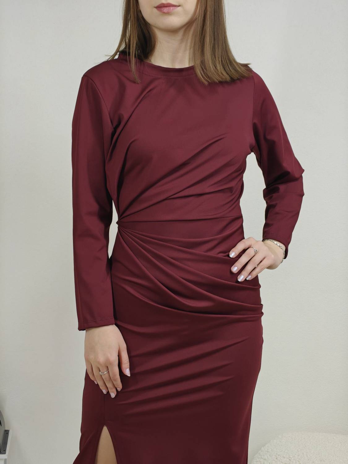 Jedofarebné obtiahnuté šaty s jemným nariasením na boku a s rázporkom v prednej časti.