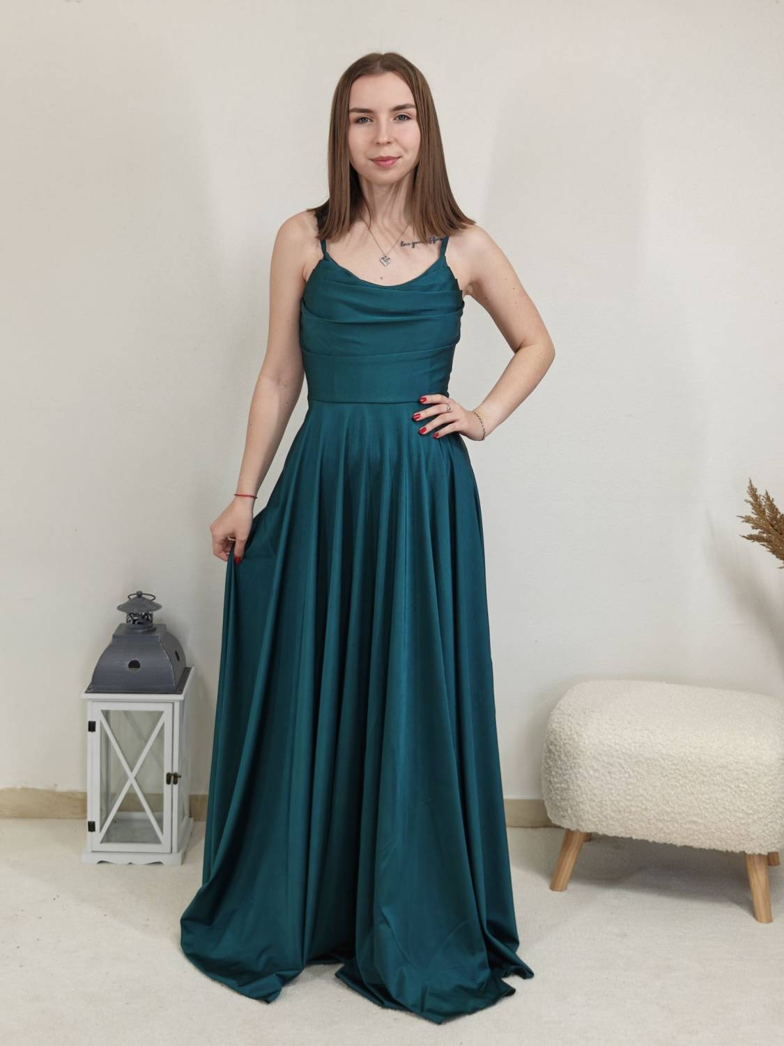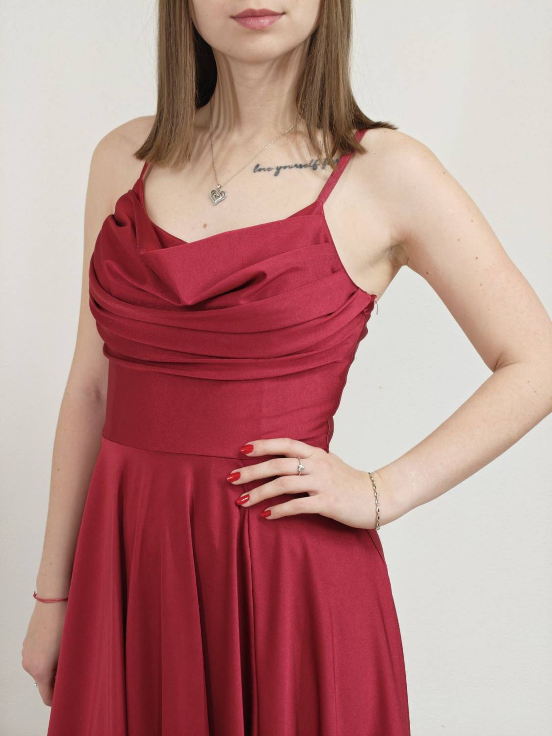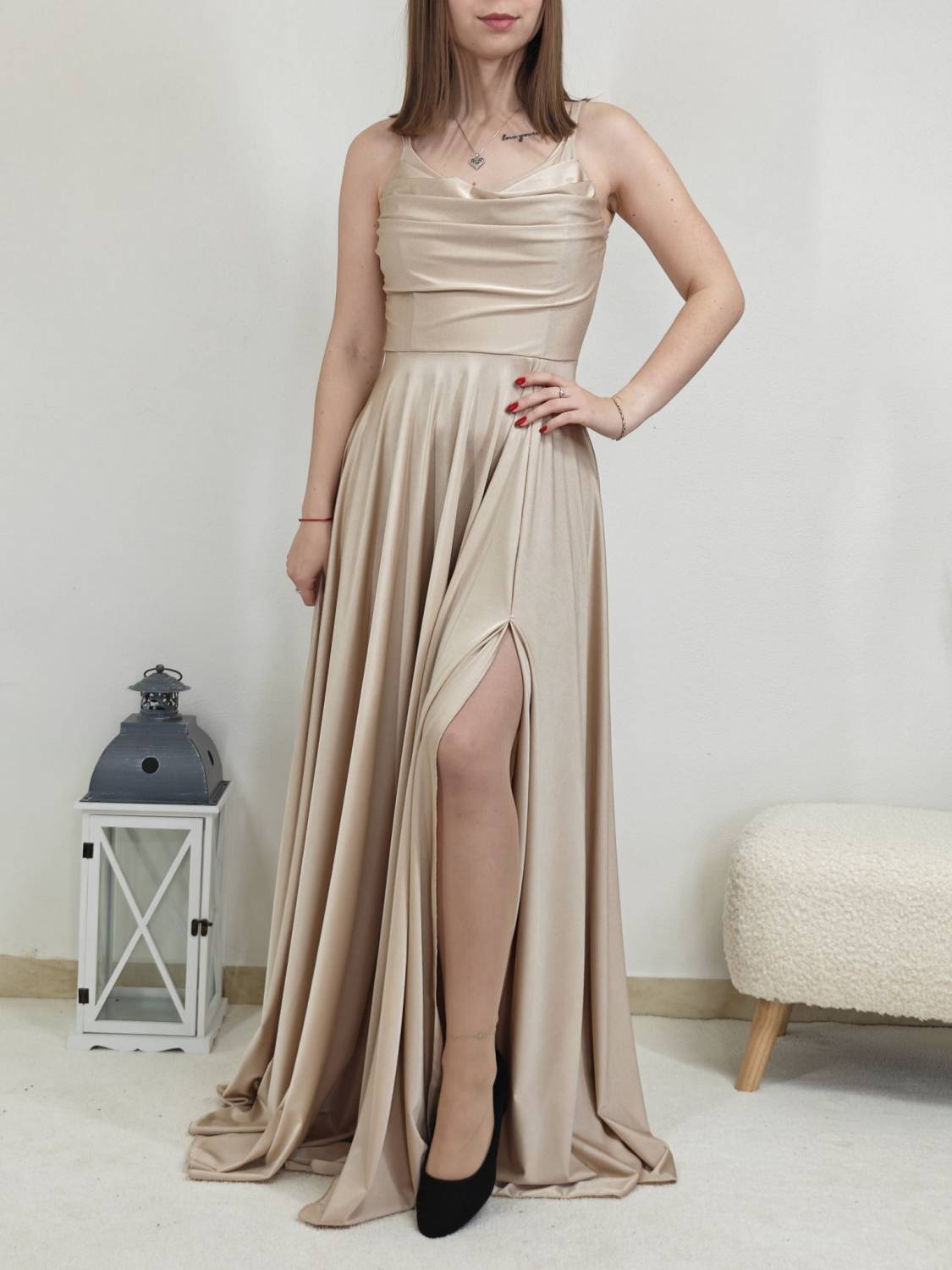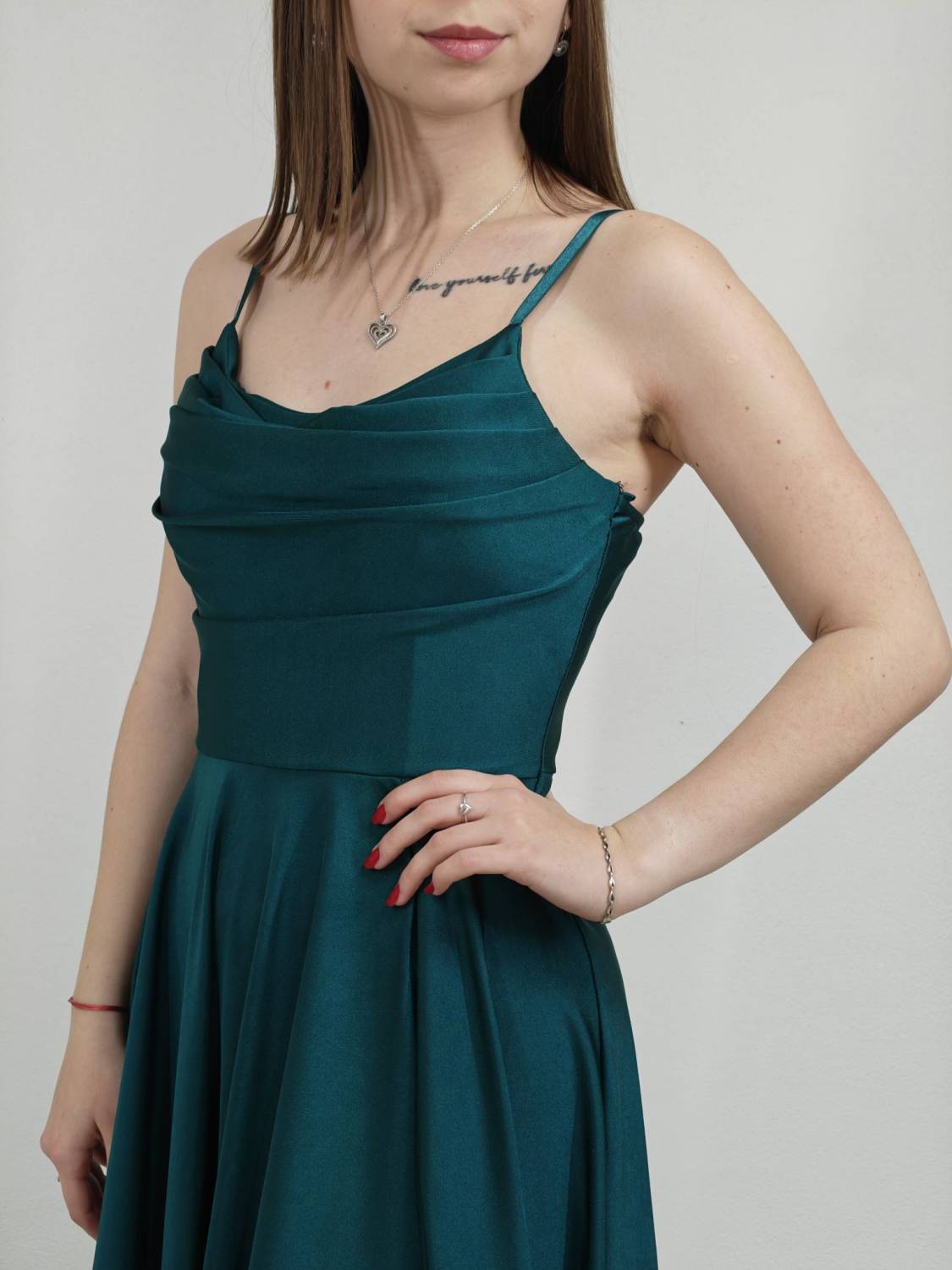 Jednofarebné elegantné šaty na regulovateľné ramienka so zapínaním na zips. Majú riasenie a vypchávky na prsiach. Sukňa je áčkového strihu s rázporkom vpredu.