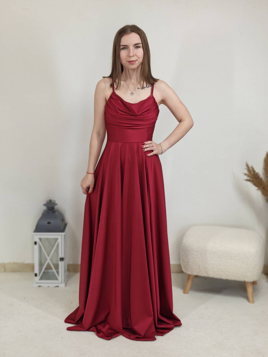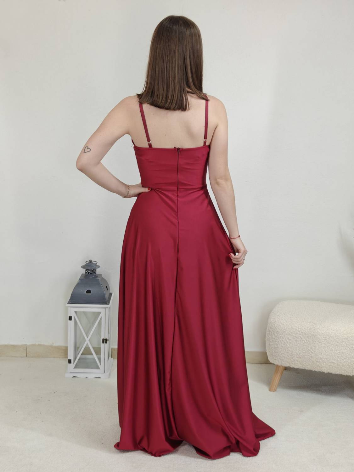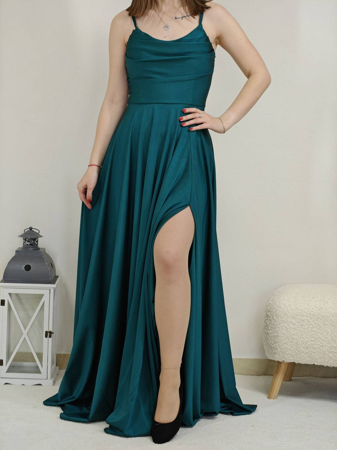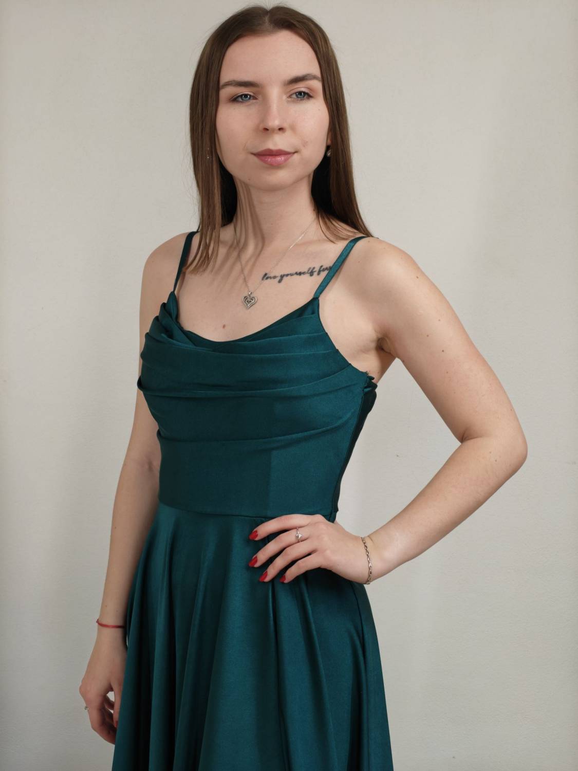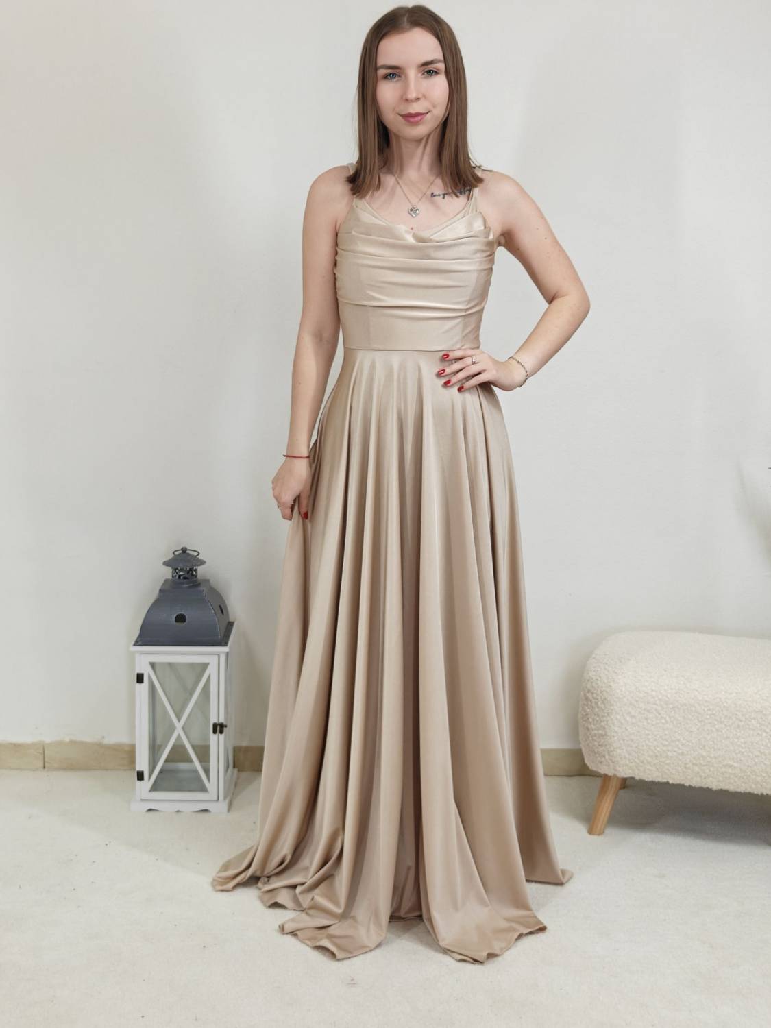 Jednofarebné elegantné šaty na regulovateľné ramienka so zapínaním na zips. Majú riasenie a vypchávky na prsiach. Sukňa je áčkového strihu s rázporkom vpredu.