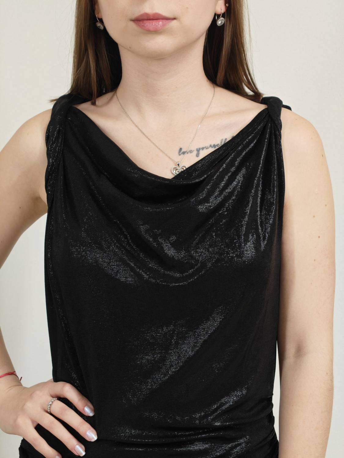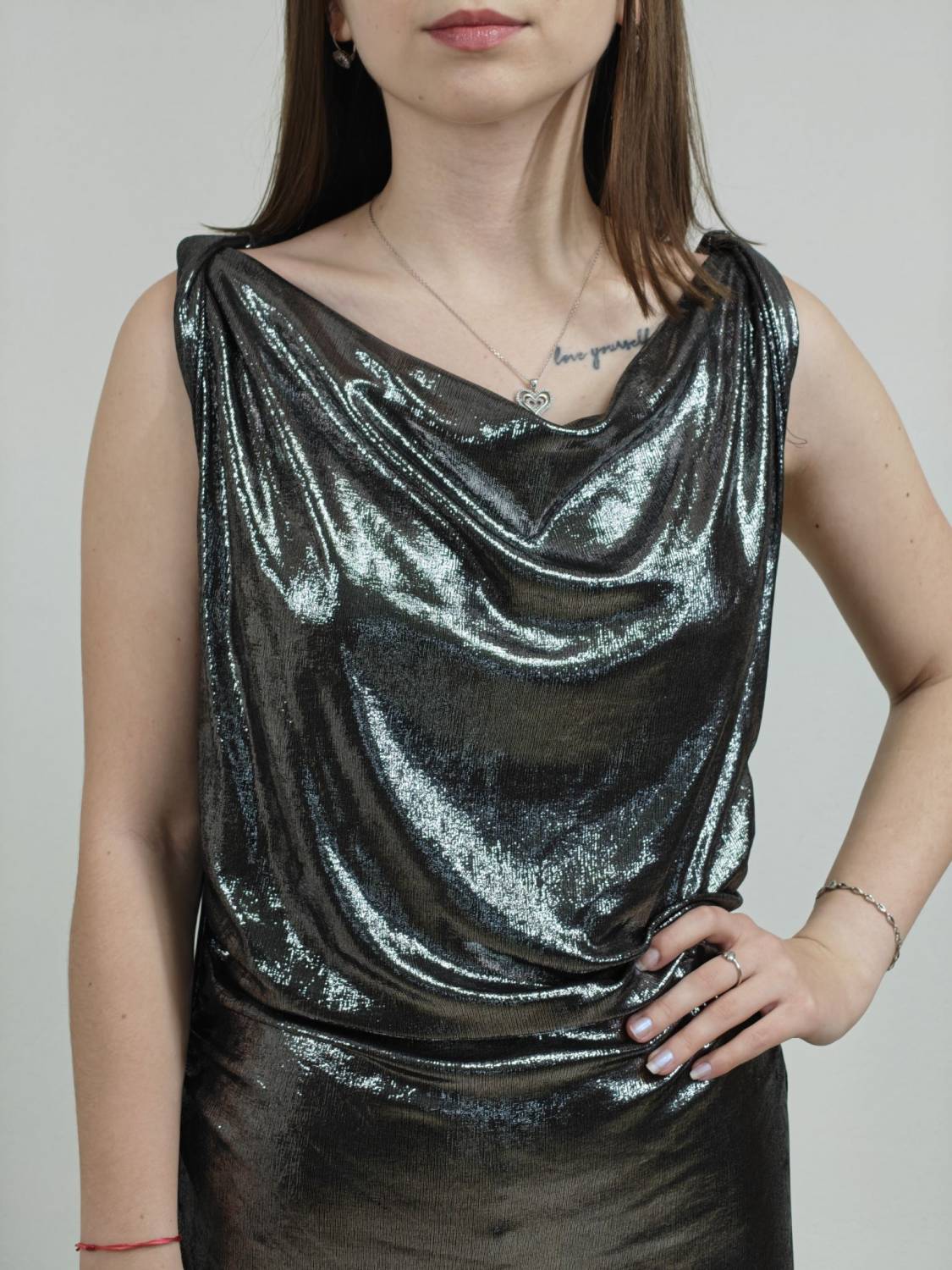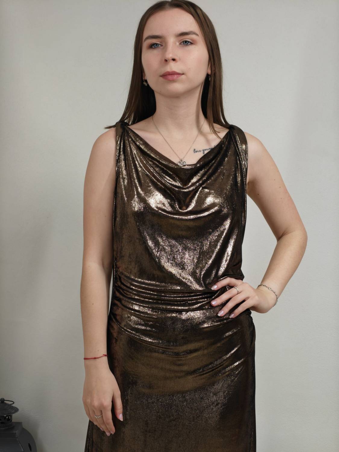 Jednofarebné lesklé šaty na ramienka, ktoré sú pretočené a vytvárajú zaujímavý efekt.