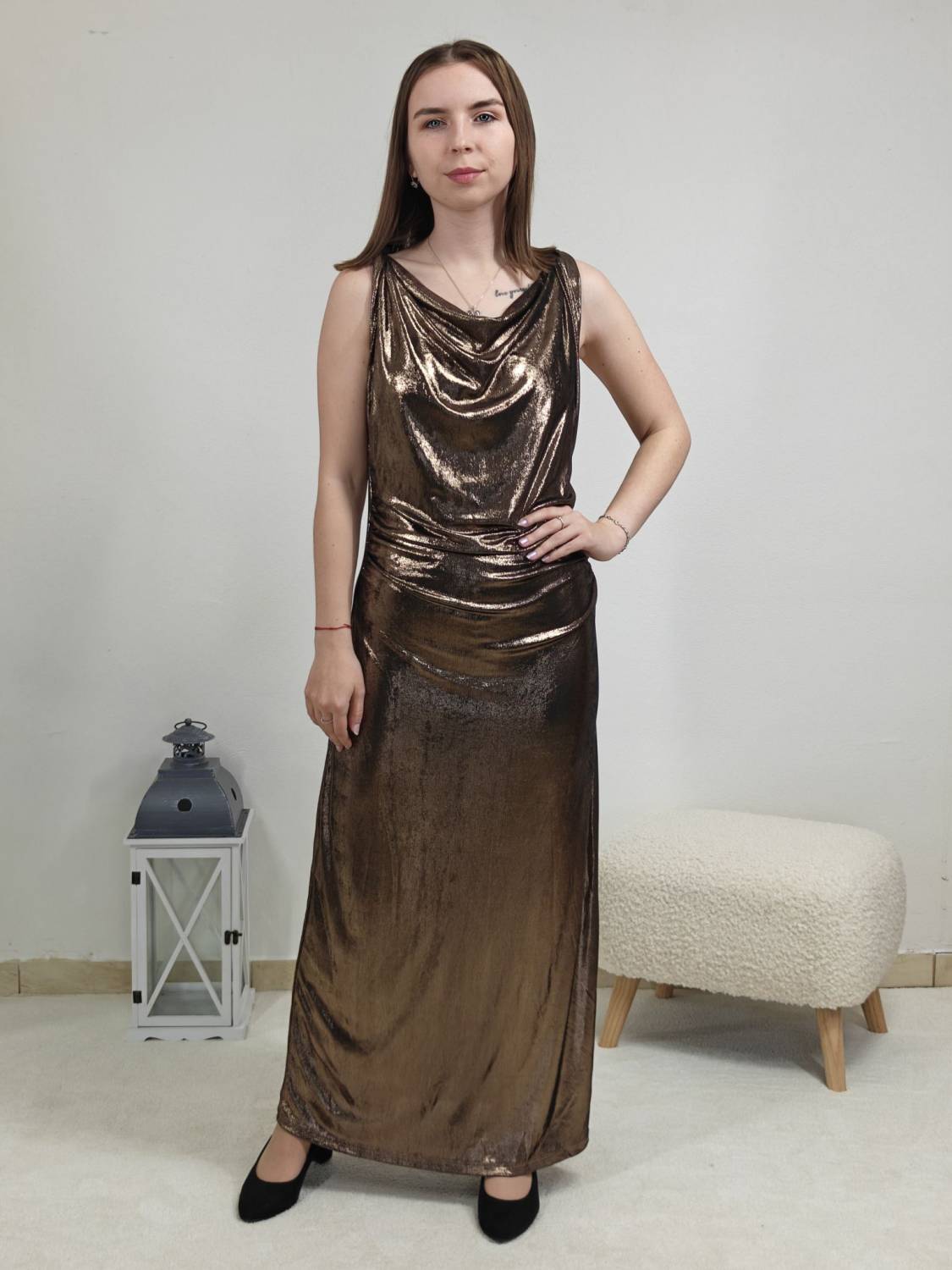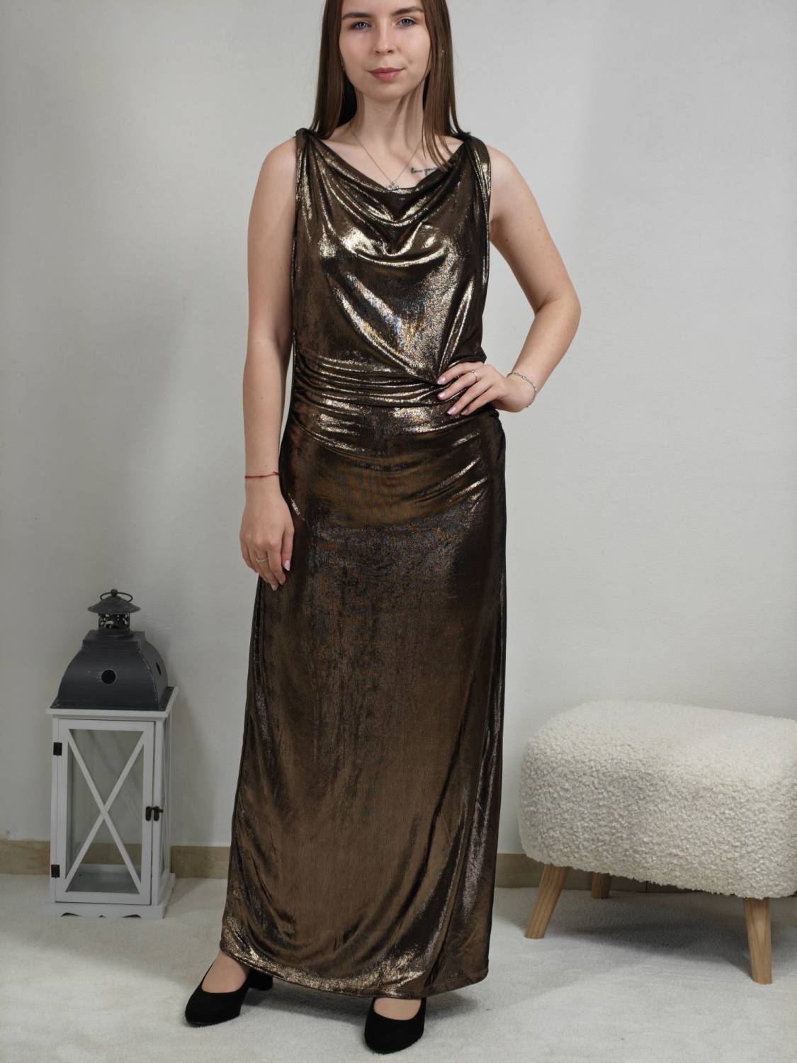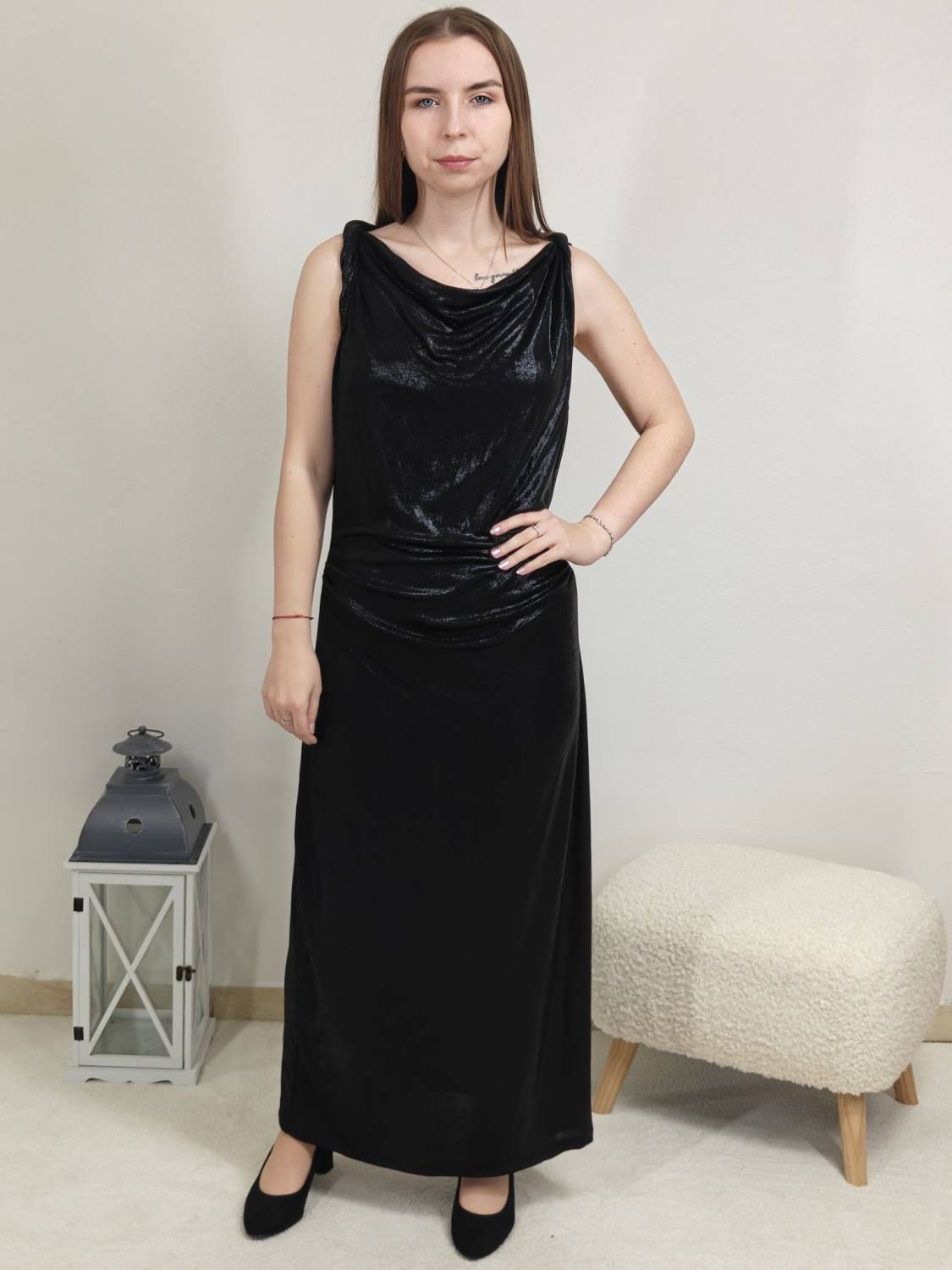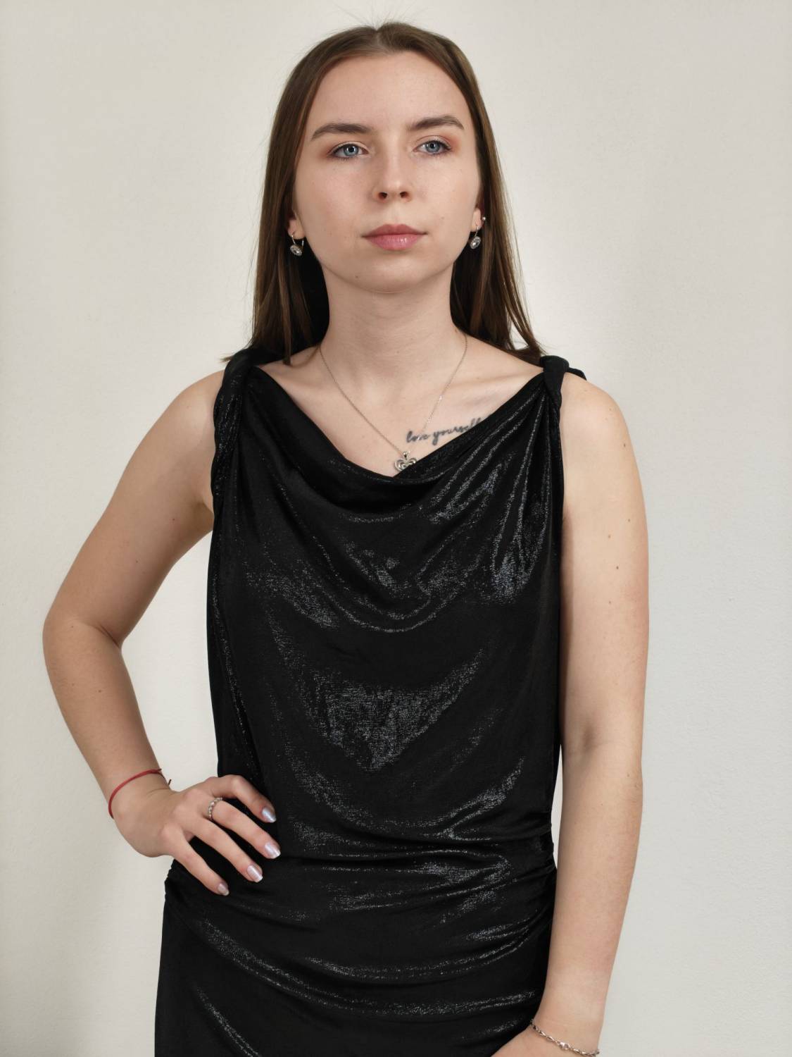 Jednofarebné lesklé šaty na ramienka, ktoré sú pretočené a vytvárajú zaujímavý efekt.