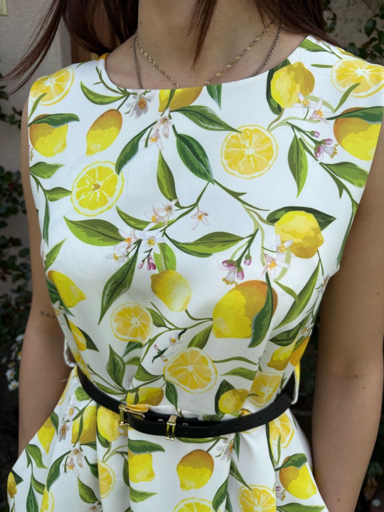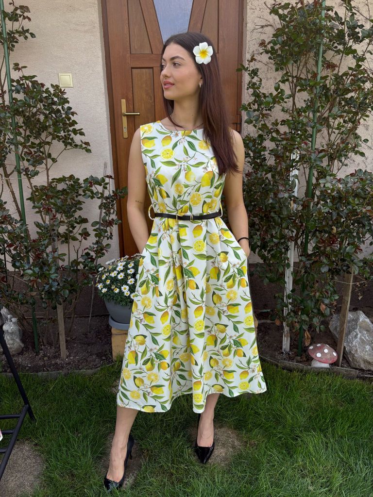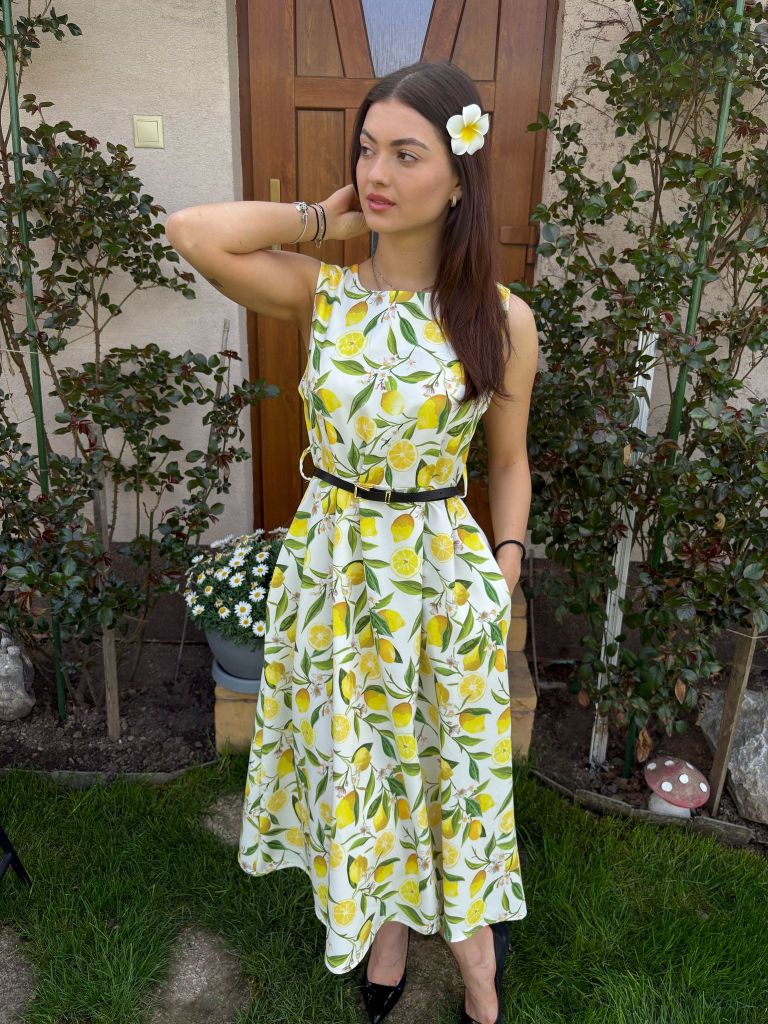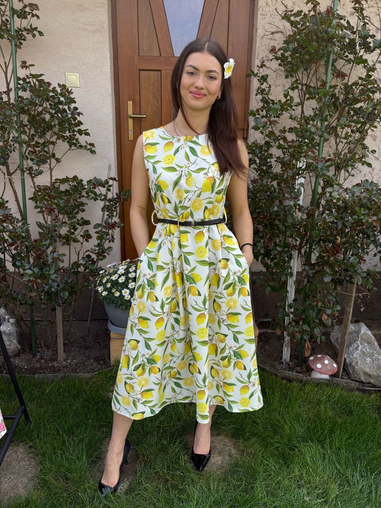 Šaty s potlačou citrónov na širšie ramienka, suknička je strihaná do A-čka.