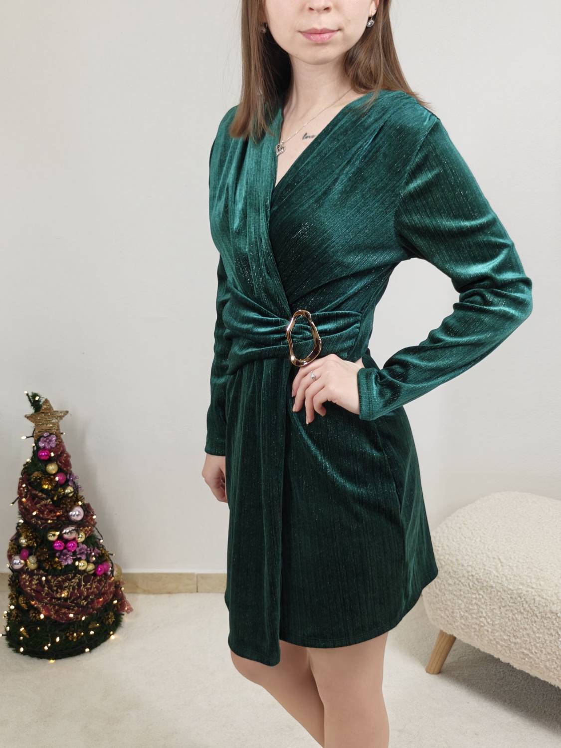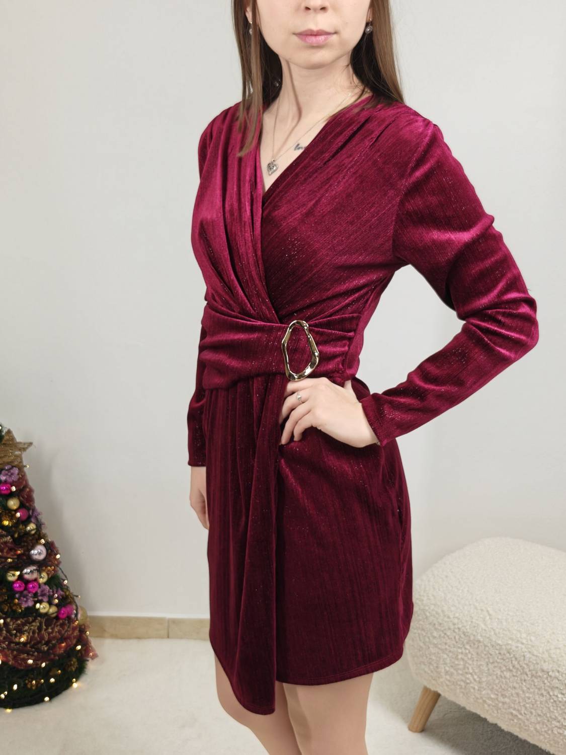 Krátke, prekladané velúrové šaty, majú ozdobnú sponu zlatej farby.